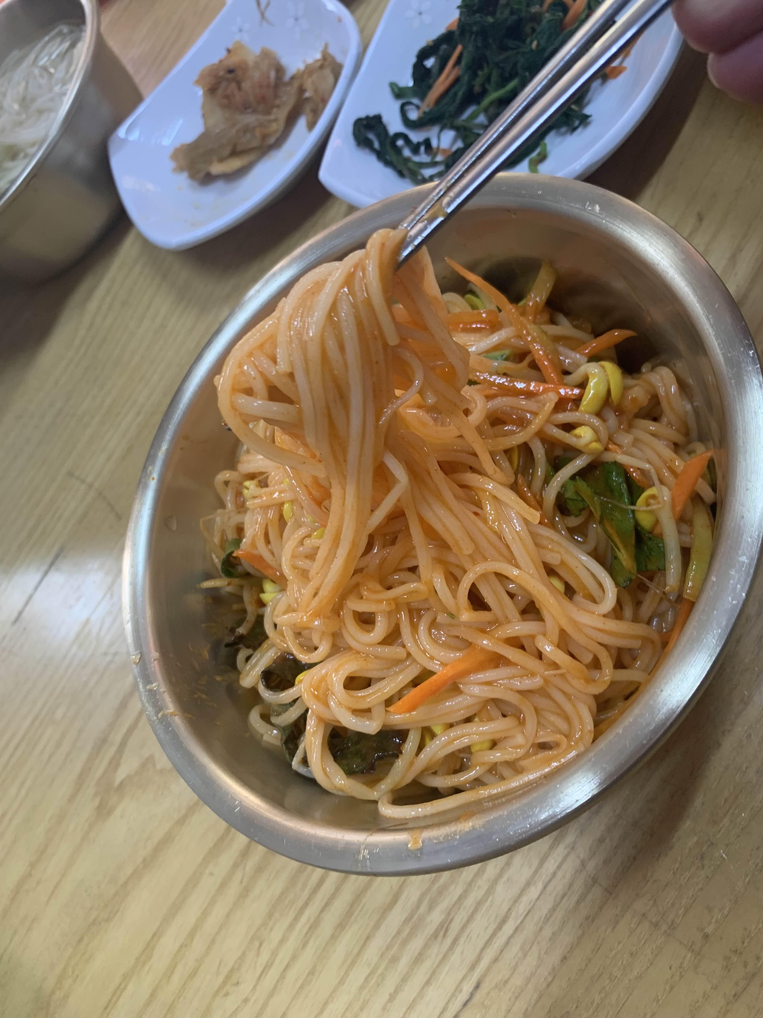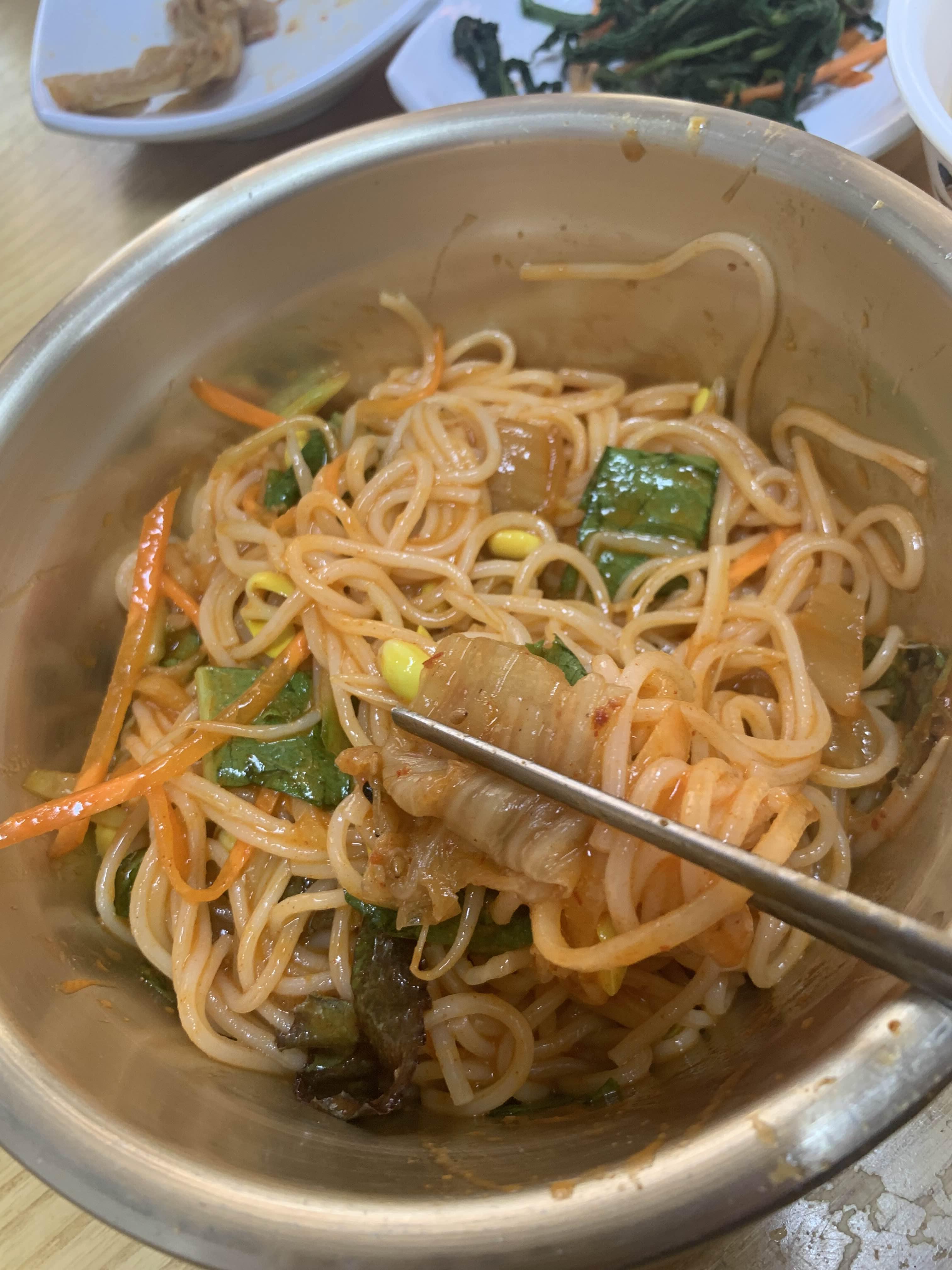 밍밍하게만 보였던 물국수!! 이 물국수를 아이들이 정말 좋아하더군요. 물국수 육수가 은근히 멸치육수가 살짝 나는데.. 멸치 육수와 다른 육수를 섞은듯한 느낌이 강하더군요. 그리고 비빔국수!! 이 비빔국수를 깻잎김치와 함께 맛보니 맛이 정말 맛나더군요.