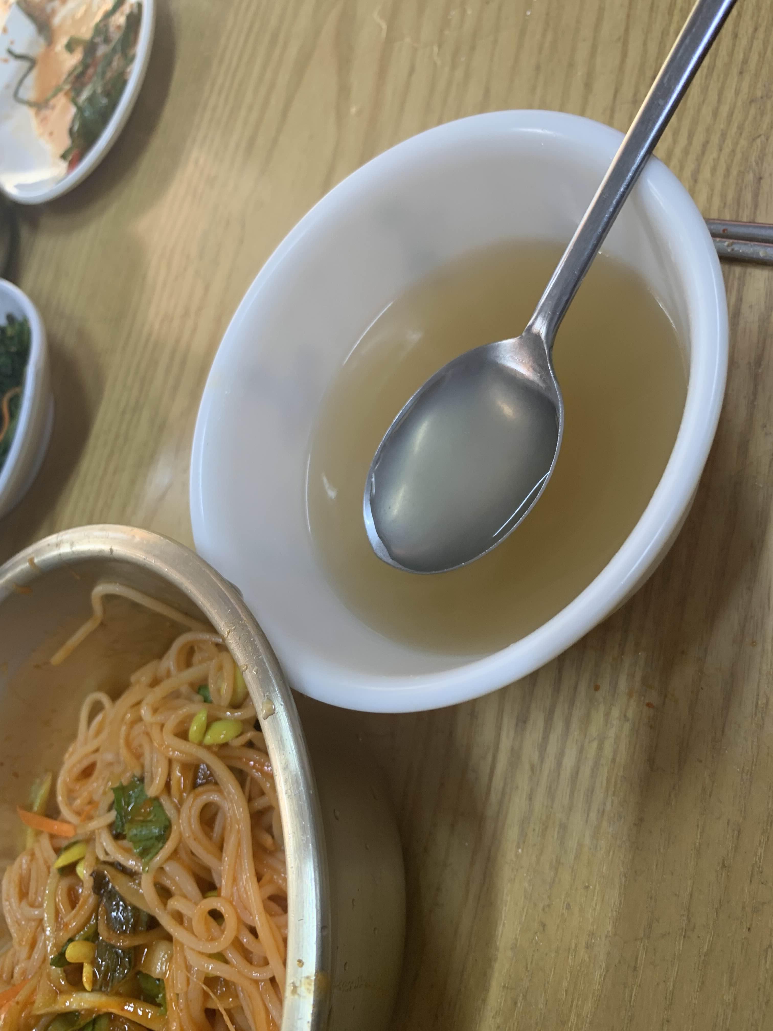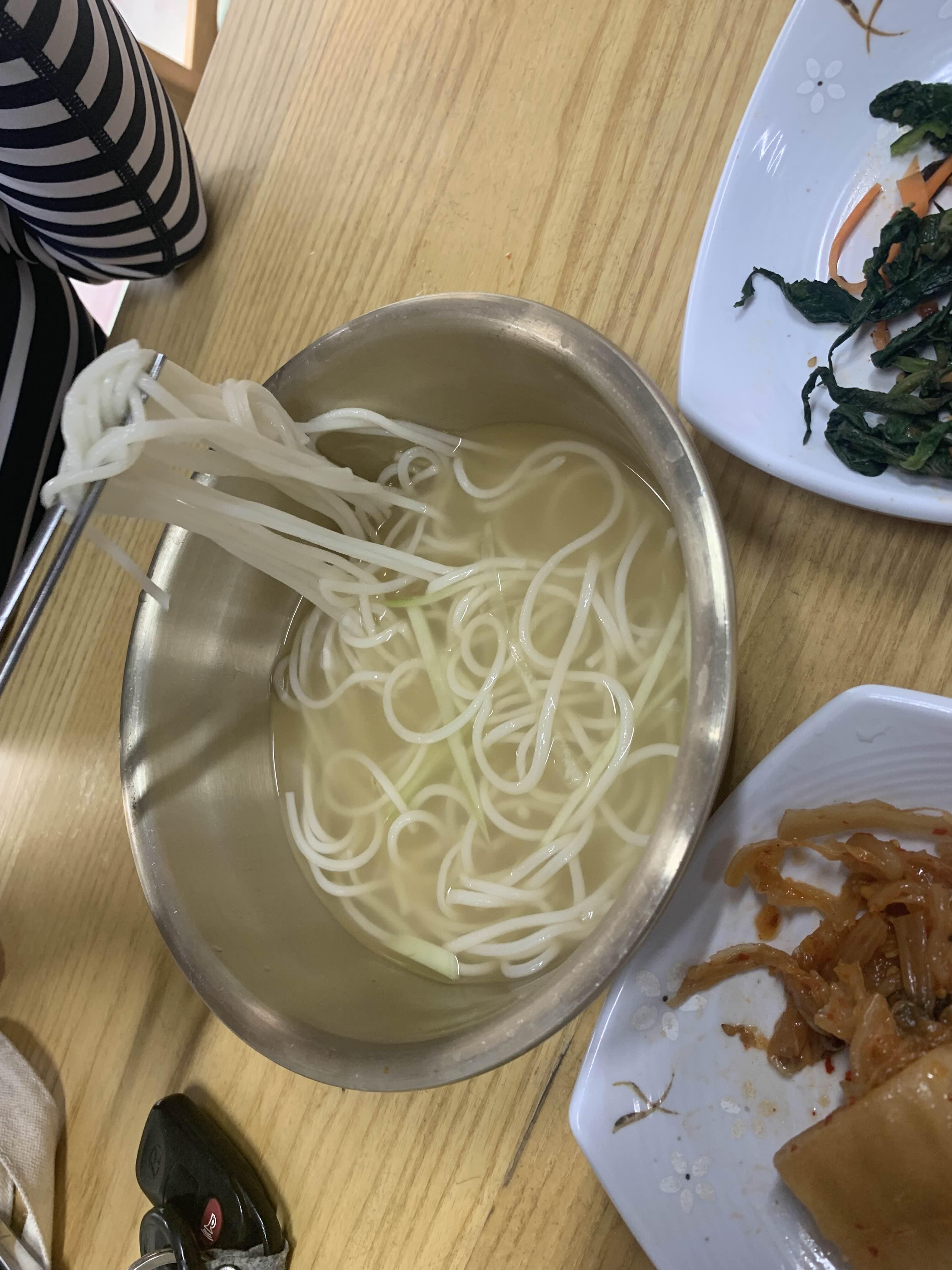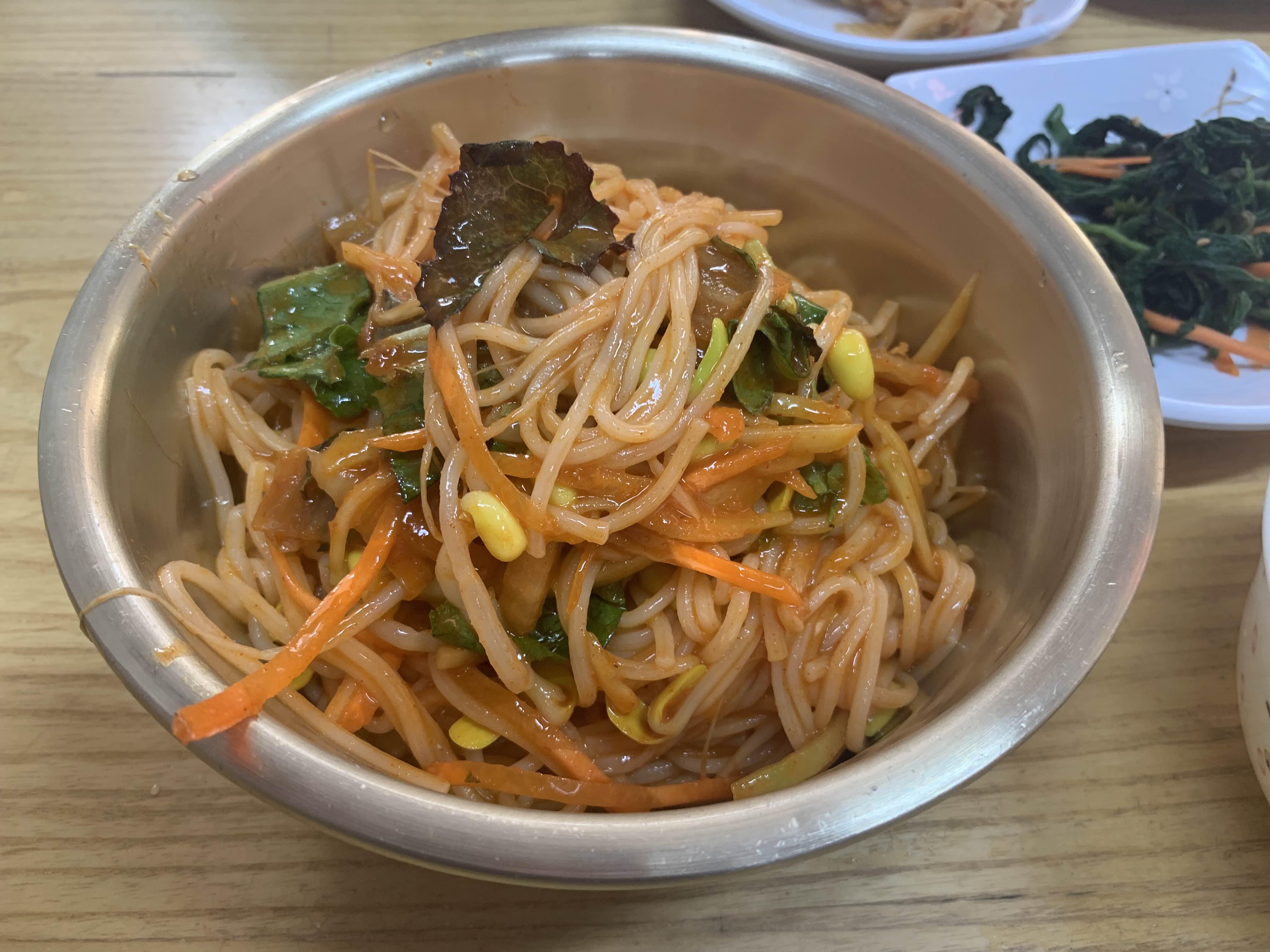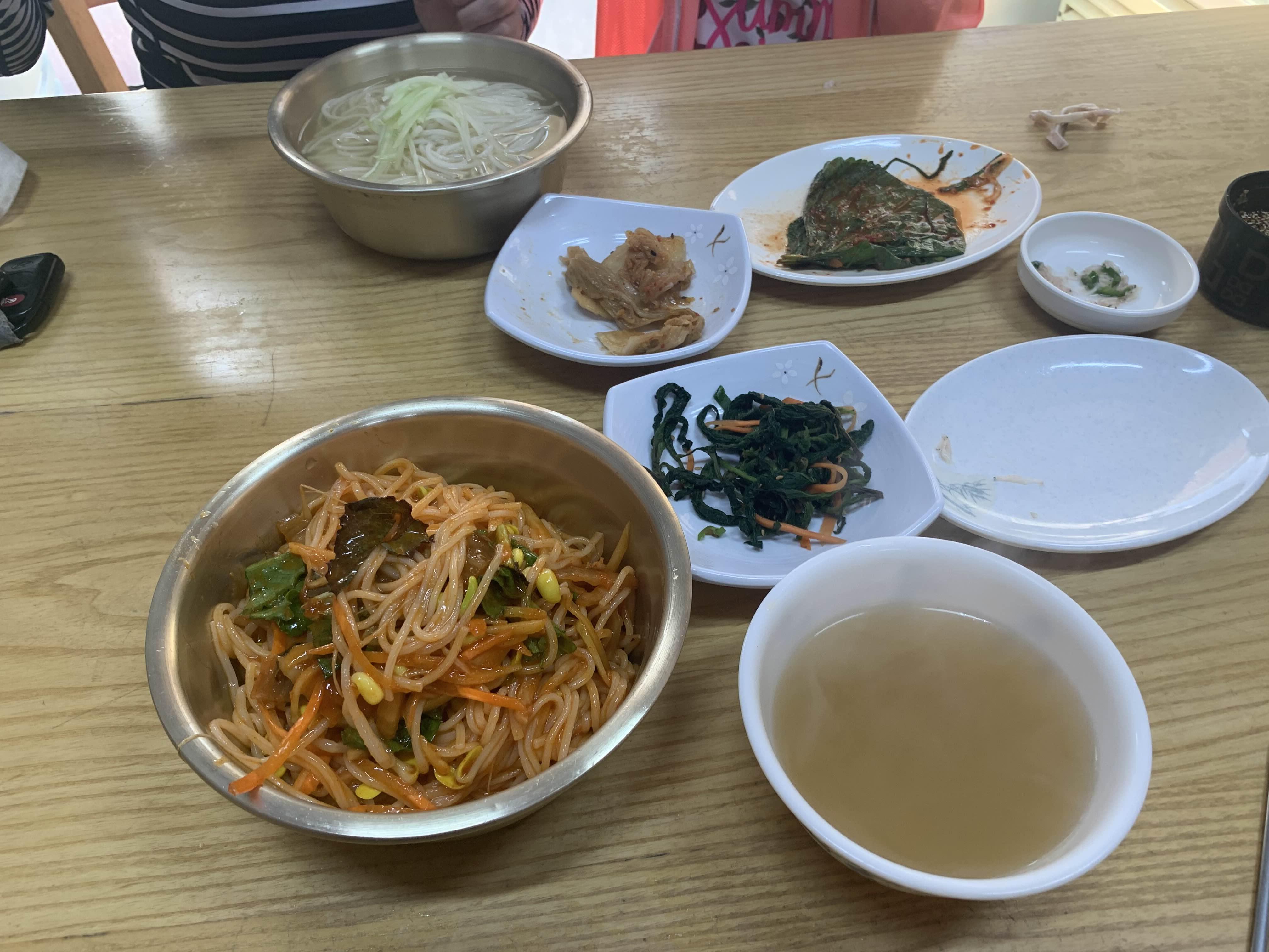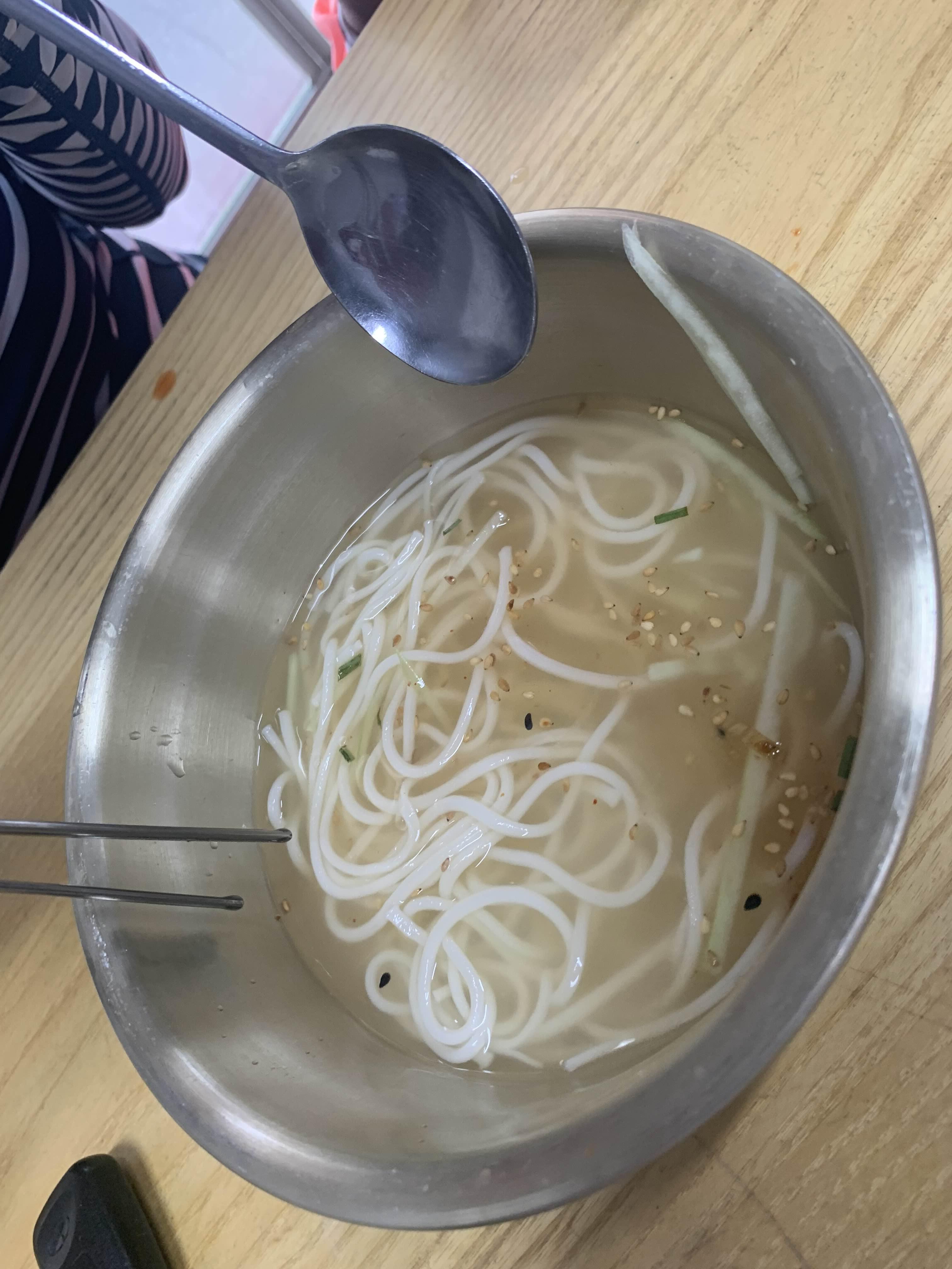 그리고 주문했던 메인 음식 비빔국수/물국수가 나왔습니다. 비빔국수는 모두 비벼서 나오는 스타일이고... 물국수는 고명으로 오이만 올라온 비주얼인데.... 비빔국수는 평소 많이 보았던 비주얼이라 패스! 이 물국수의 오이 고명!! 참 밍밍한 비주얼이라 무슨 맛이나 날까 생각이 들더군요.