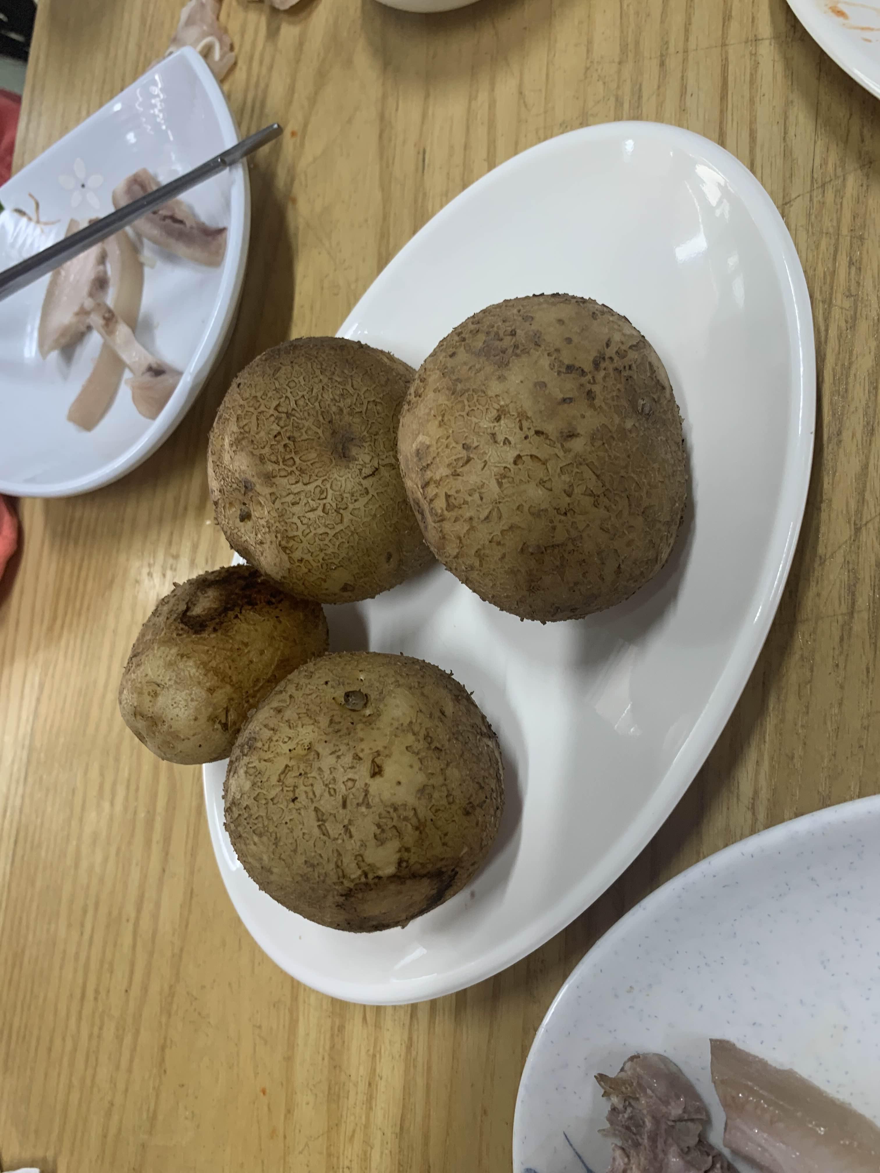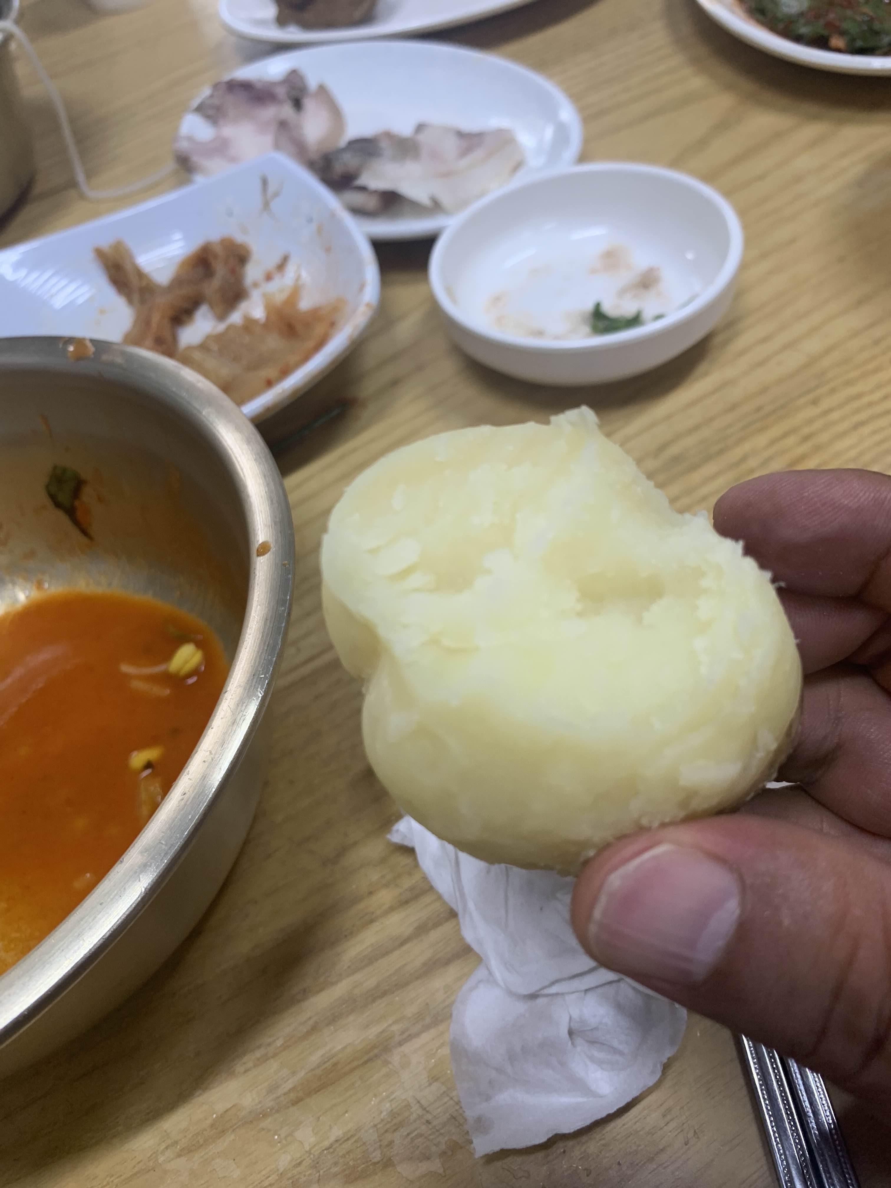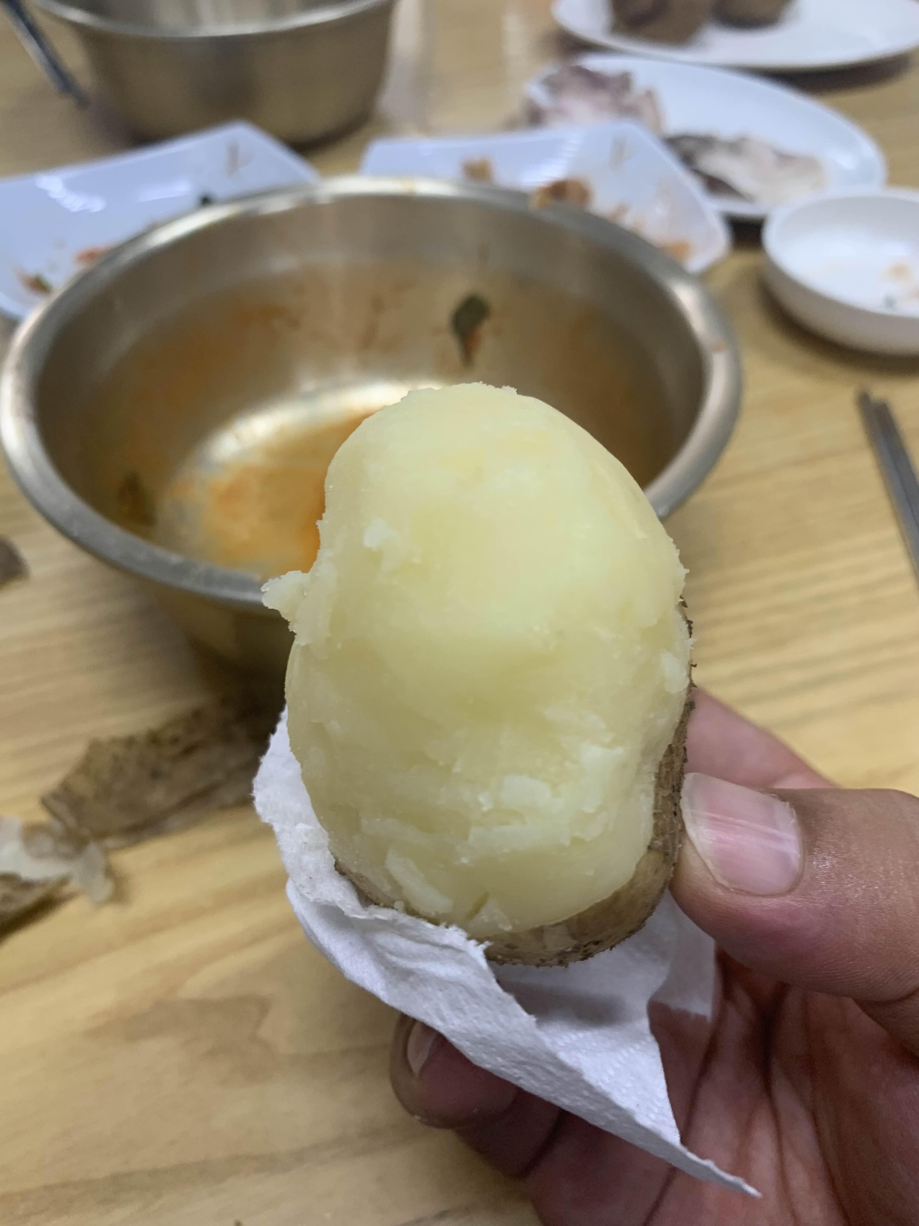 머리고기와 깻잎김치가 너무 맛나서.... 공깃밥이 있을 거 같아 주문했지만;;; 공깃밥은 없더군요. 깻잎 위 머리고기 한 점과 공깃밥 한 숟가락 올려서 쌈 싸 먹고 싶더군요. 국수도 맛있지만.... 술이 당기는 국숫집이더군요. 아래 감자는 공깃밥이 없다 하고... 나중에 나온 서비스! 감자도 맛나!ㅎㅎㅎ