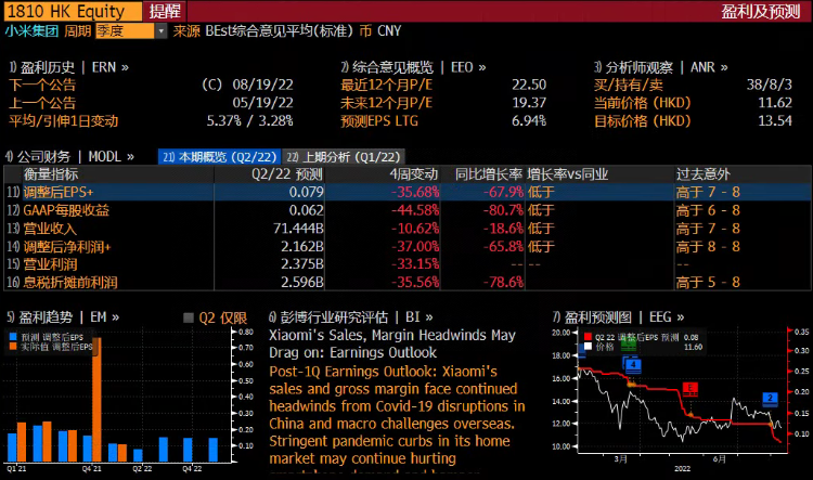 블룸버그 애널리스트들의 예상에 따르면 샤오미 그룹의 2022년 2분기 매출은 전년 동기 대비 18.6% 감소한 714억 4400만 위안, 조정 순이익은 21억 6200만 위안으로 전년 동기 대비 65.8%, 수정 EPS는 전년 동기 대비 65.8% 감소했다. 0.079위안이다.