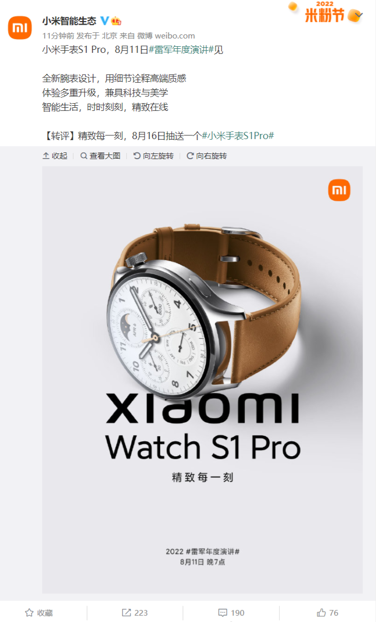 Xiaomi Watch S1 Pro는 오늘 오후 공식 발표되었으며 8월 11일 Lei Jun의 연례 연설에서 공개될 예정입니다.