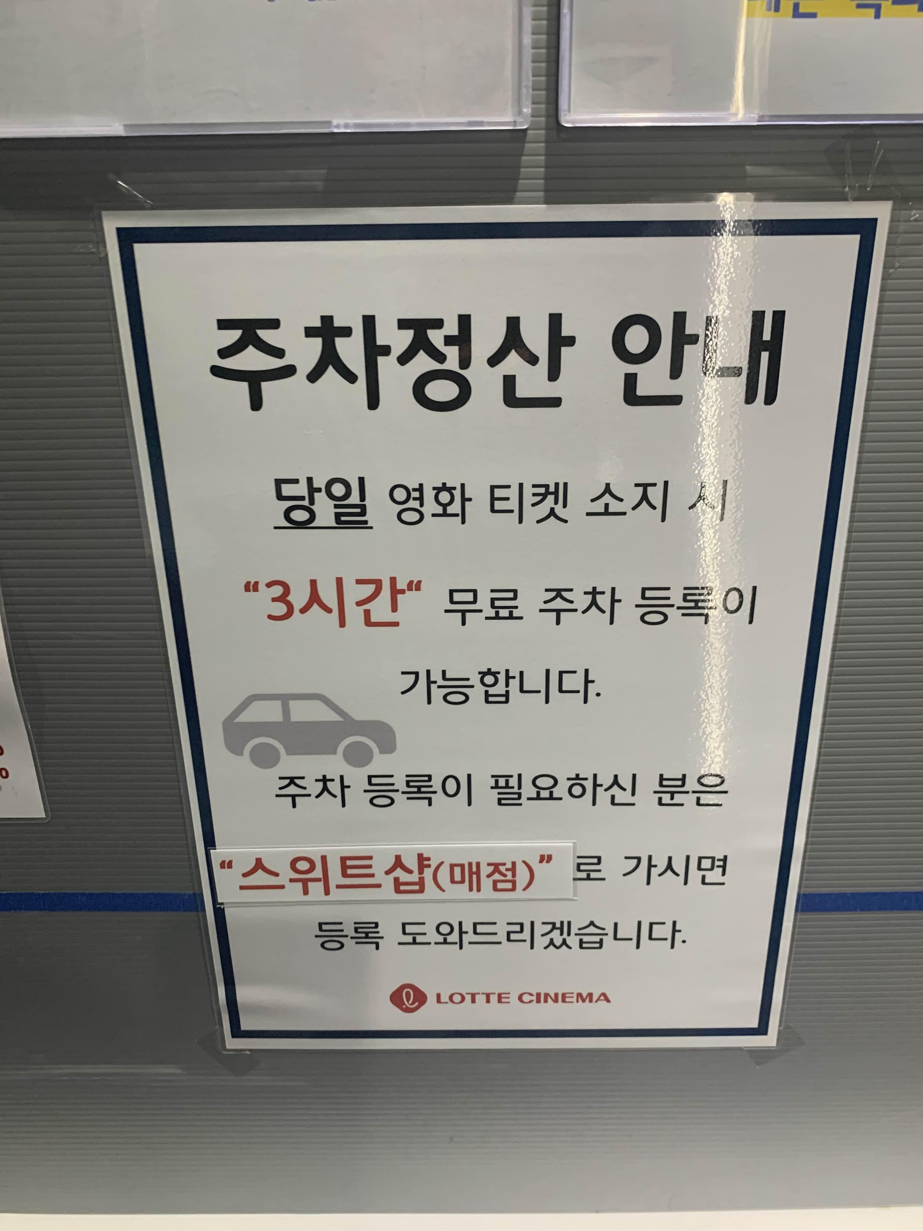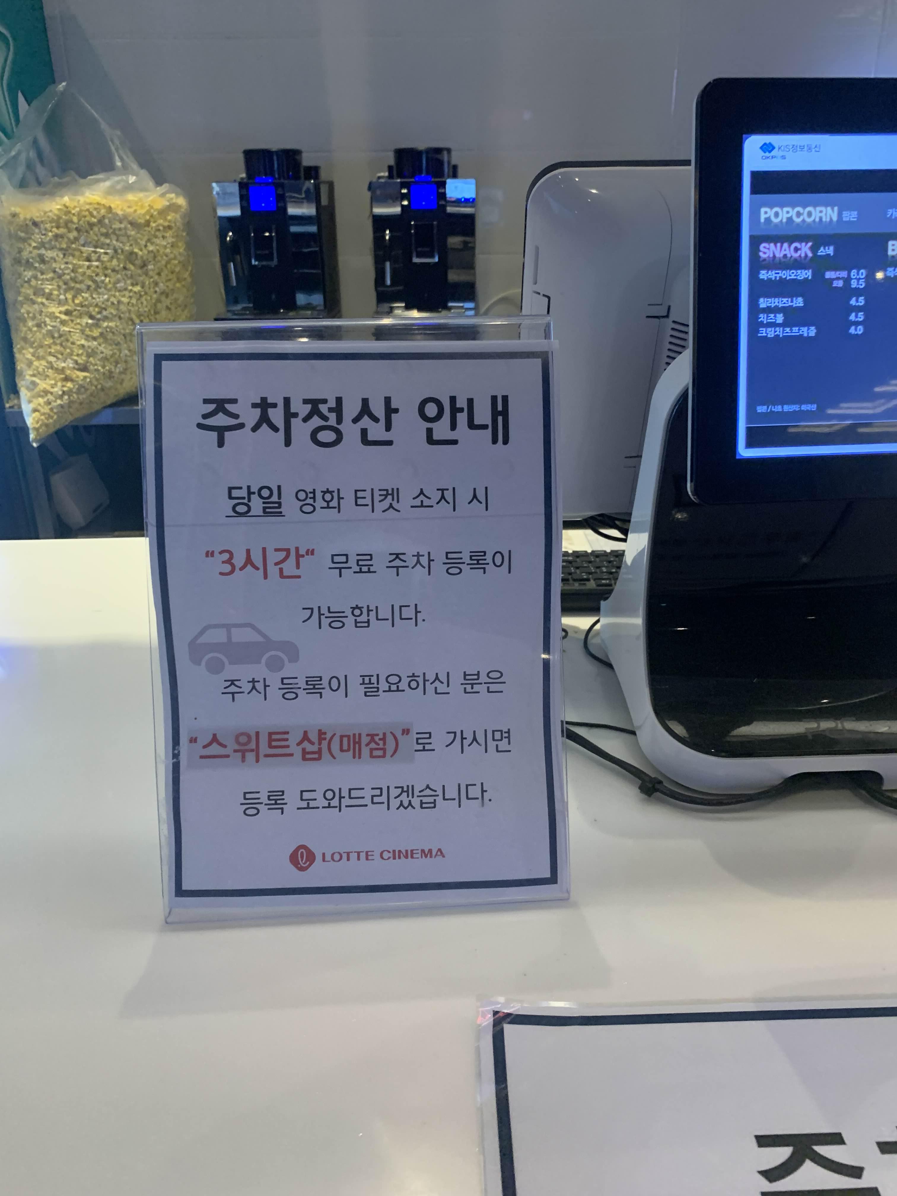영화가 끝나고 차량 등록을 위해 매점에 방문하여 차량 뒷 번호를 이야기해주었습니다. 차량등록 3시간!!! 3시간 등록해도... 영화관 말고 다른 매장 방문할 곳이 없어서.....