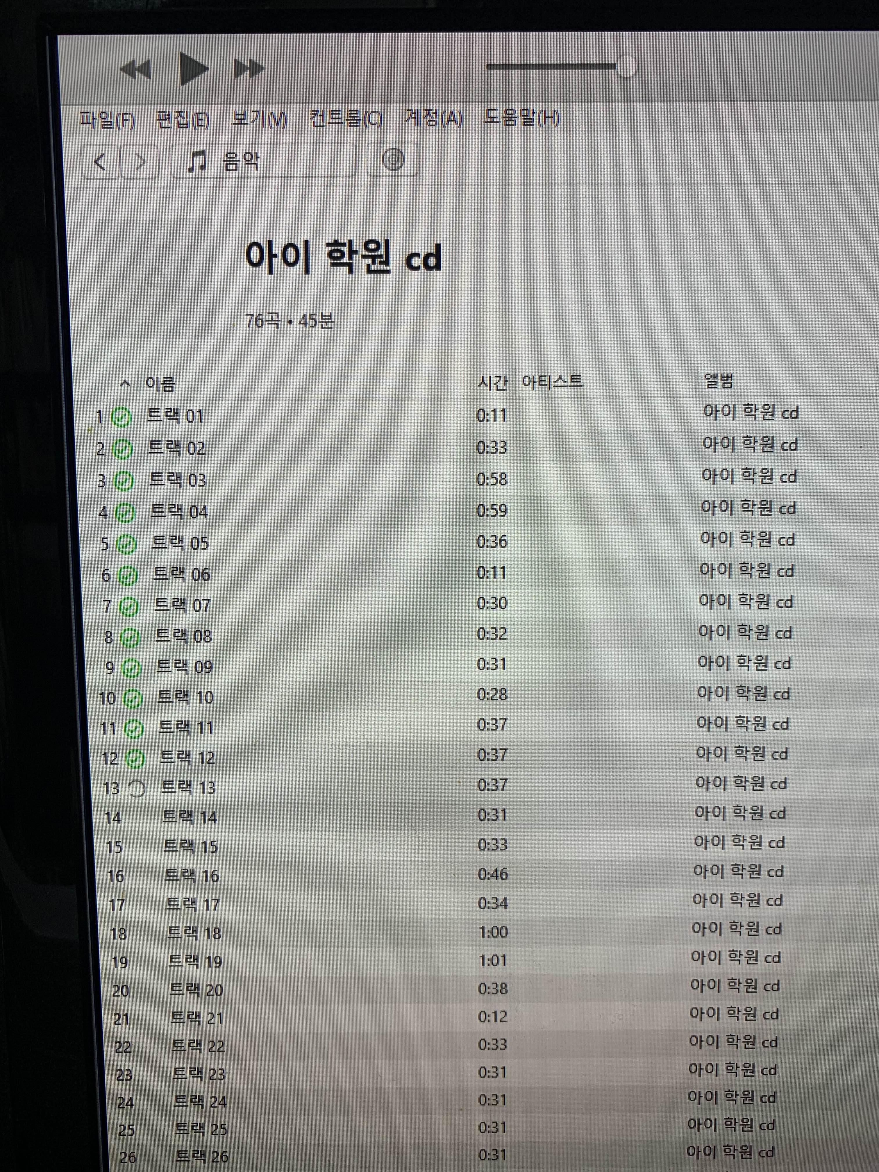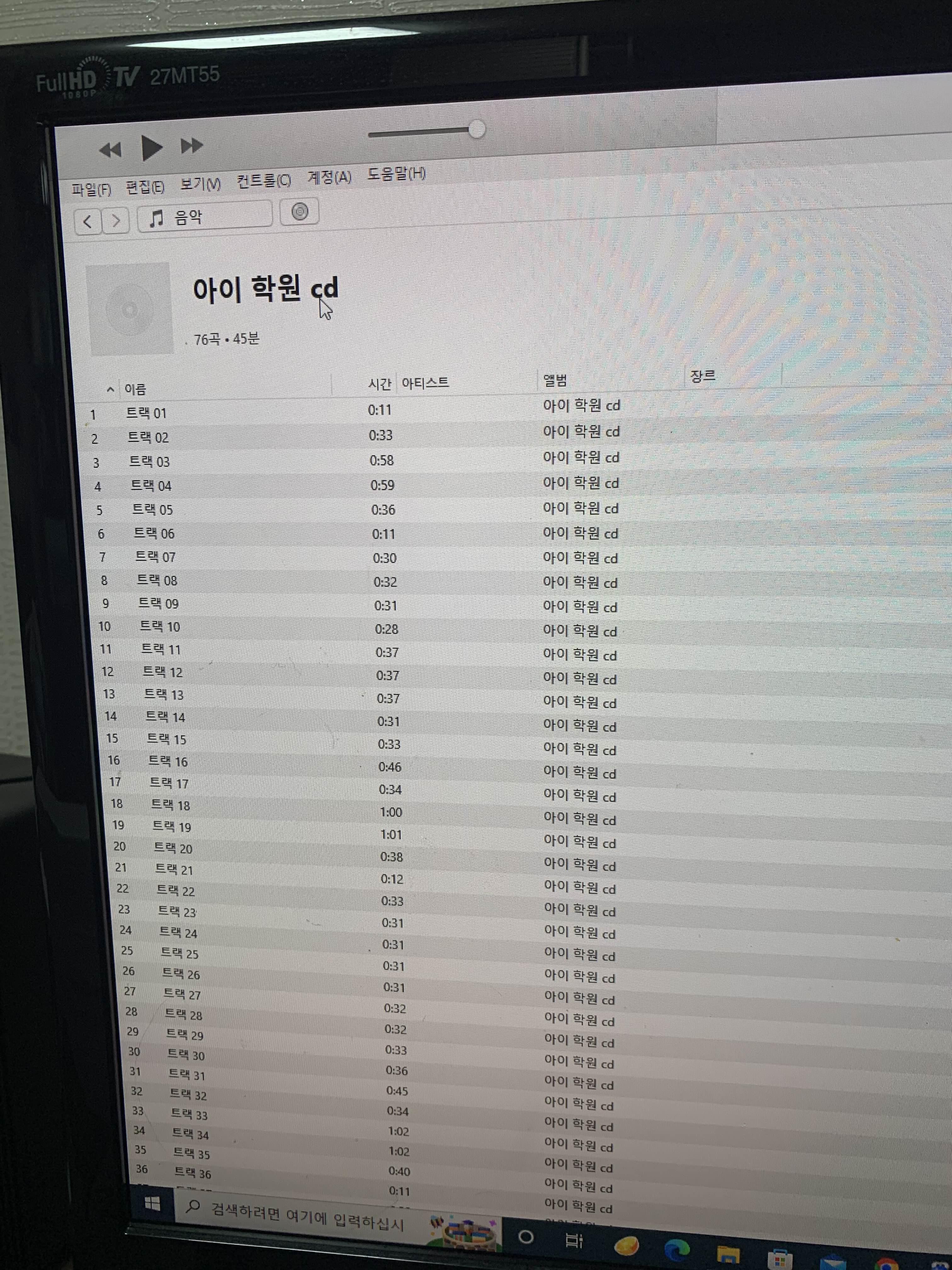CD롬을 인식하고 오디오 CD로 플레이해본다. 아이들 학습용 CD가 잘 플레이된다. 컴퓨터에서 잘 인신 되는 걸 확인했으니.. 이제 MP3 변환이 필요하니... 아이튠즈를 설치해 준다.