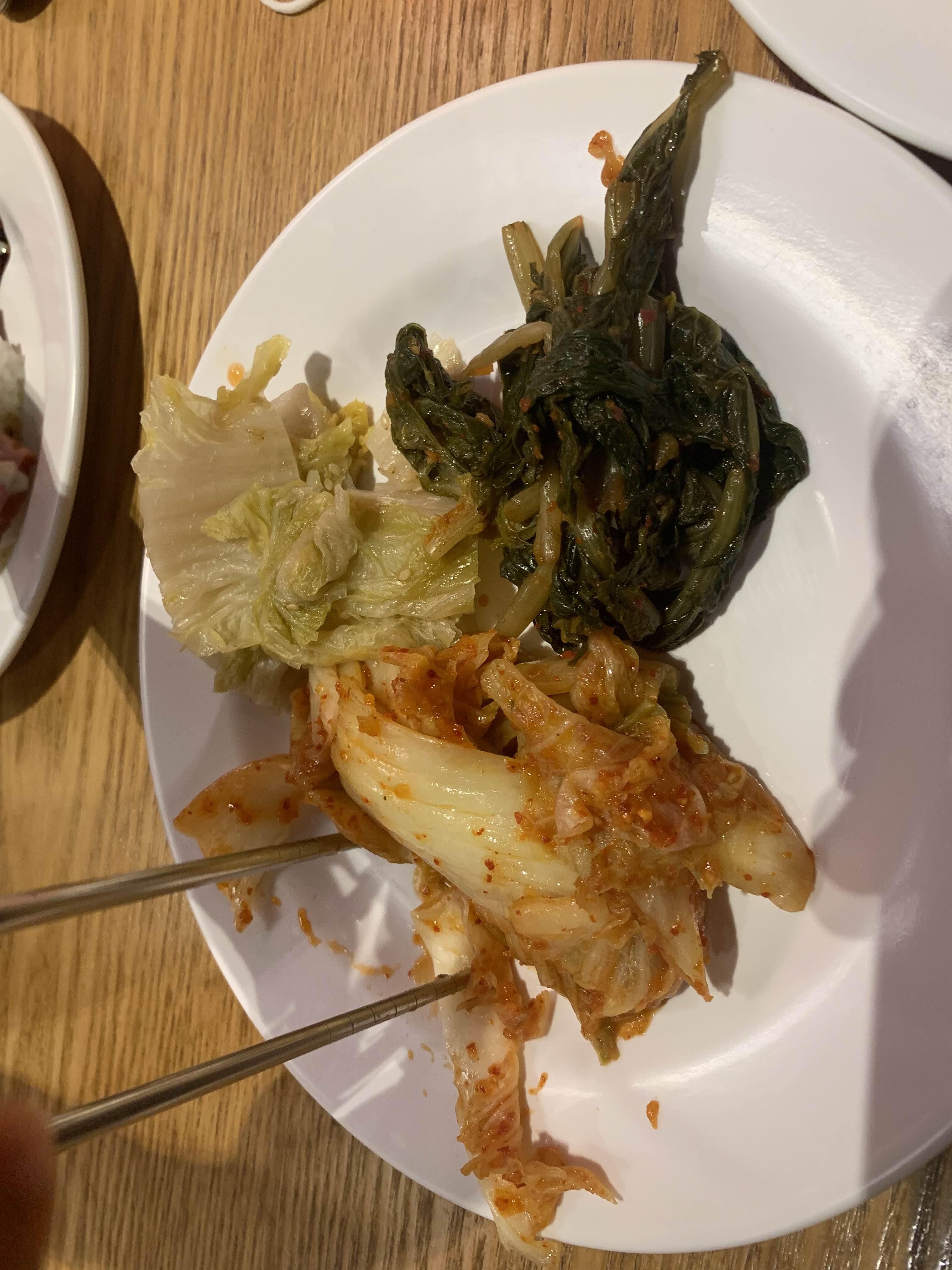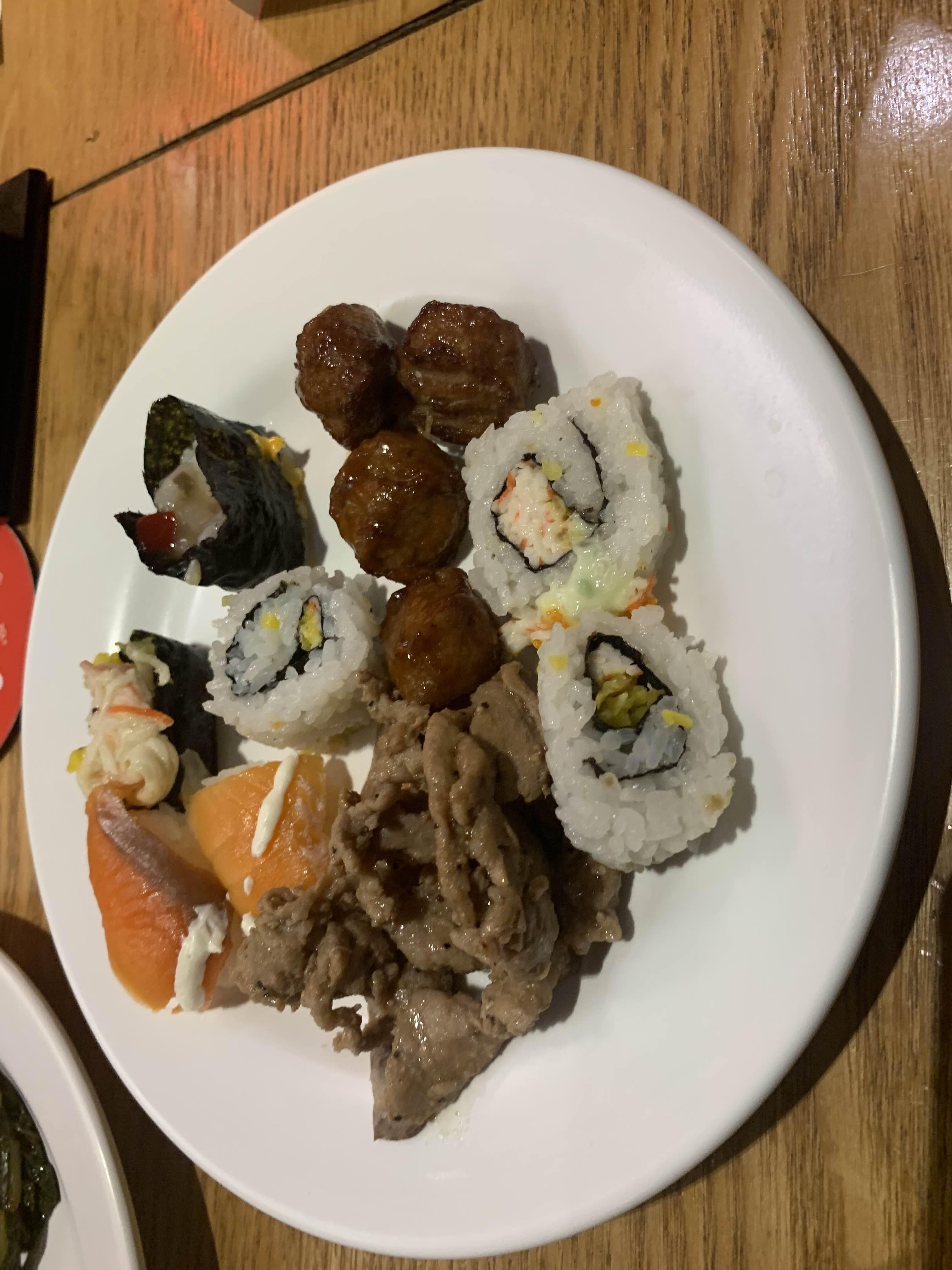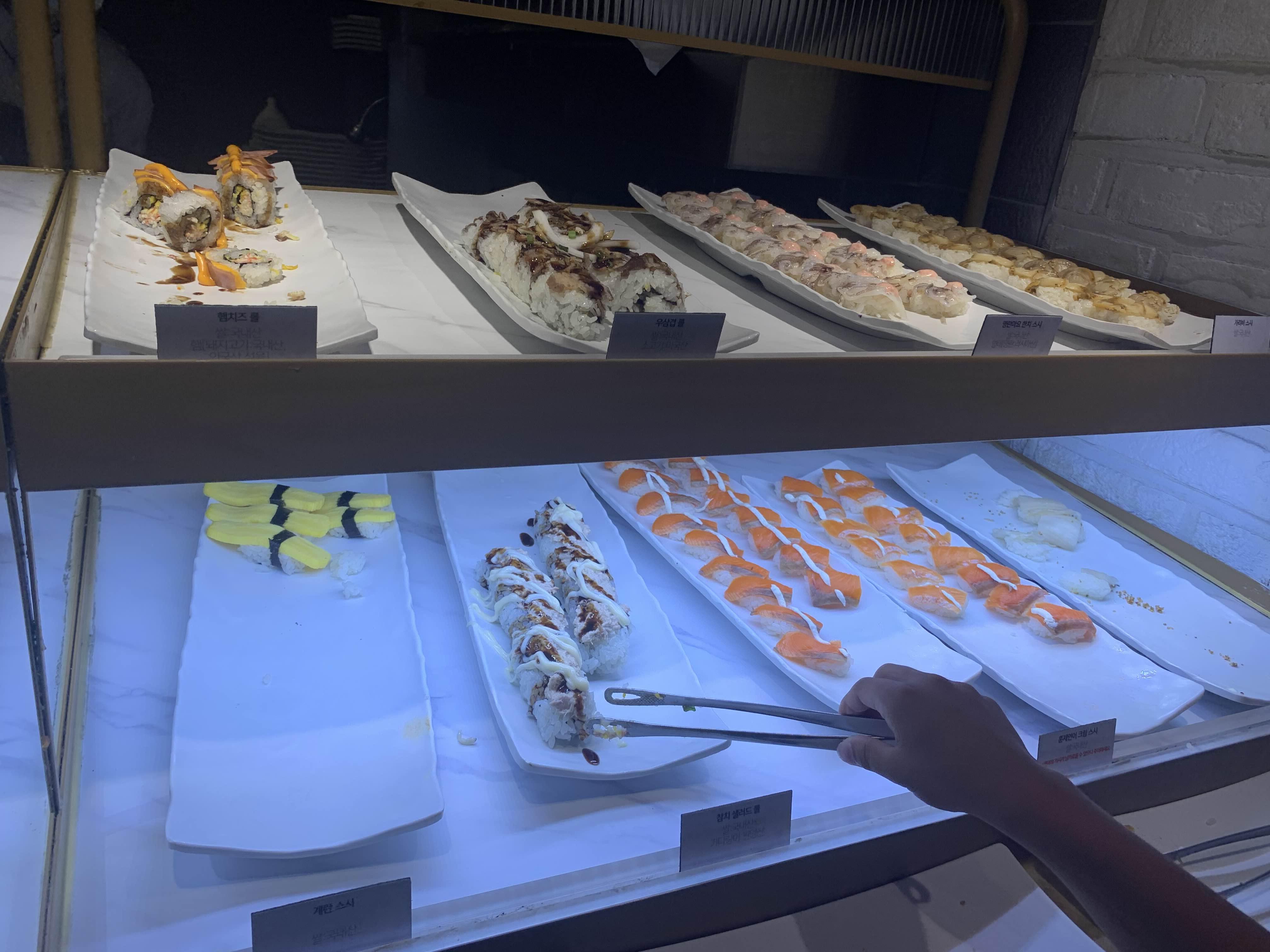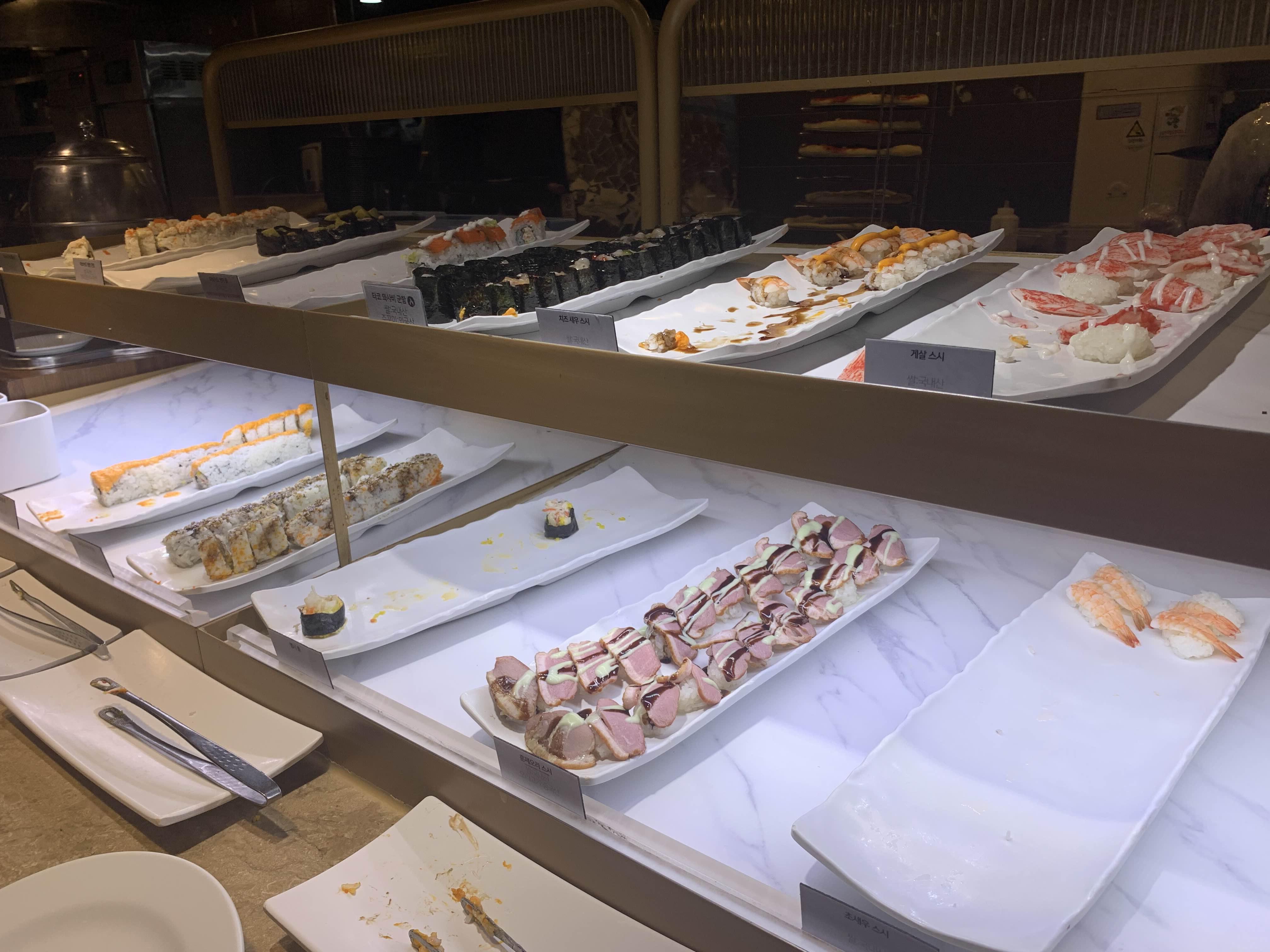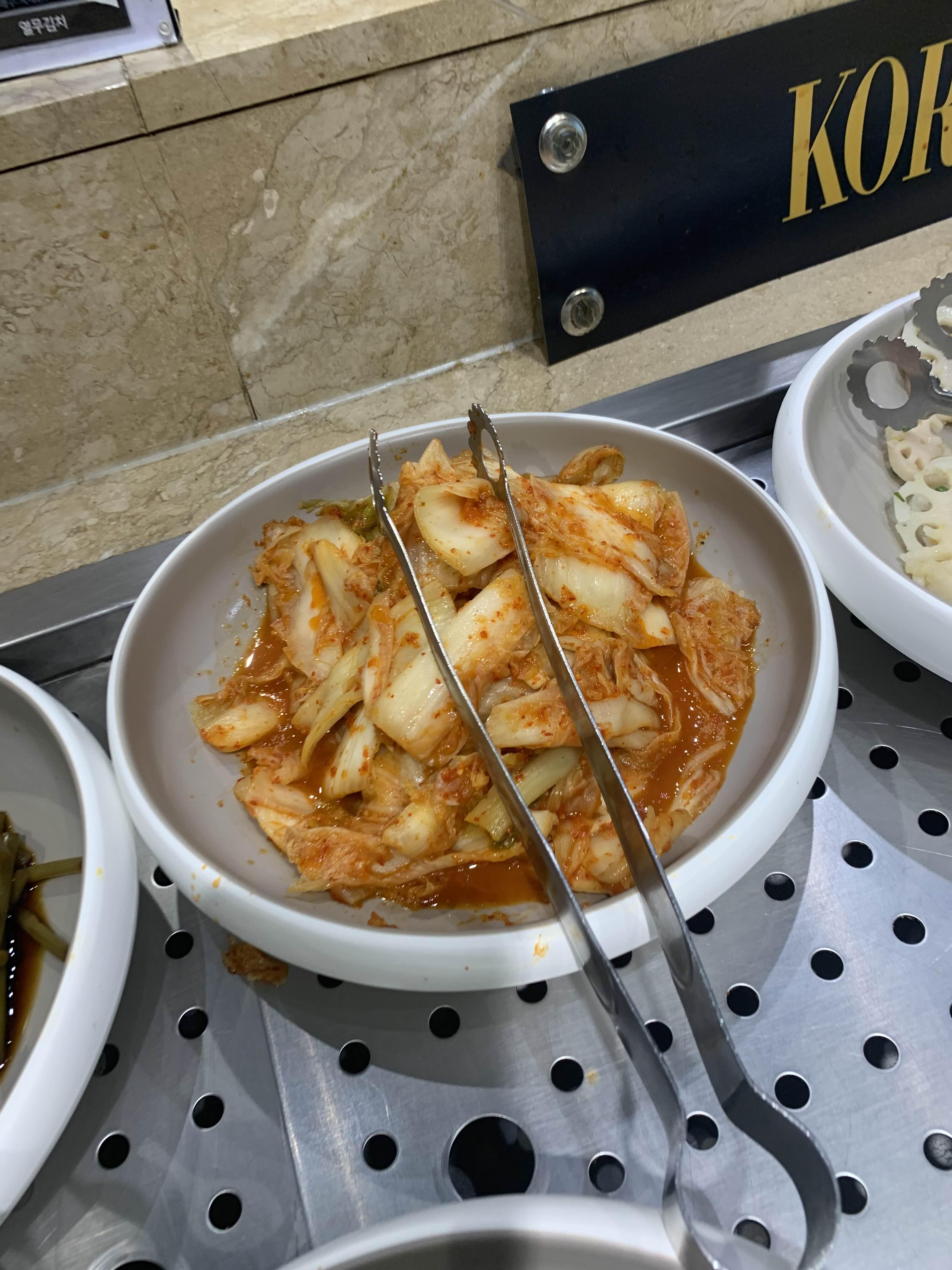 나에게 빠지지 말아야 할 음식은 바로 김치다!!! 뷔페를 먹기 위해서는 우리 한식의 기본! 김치가 있어야 한다. 먼저 김치를 한 접시 채워주고... 그 외 음식을 담아준다. 초밥이나 고기 나름 먹을만하다.