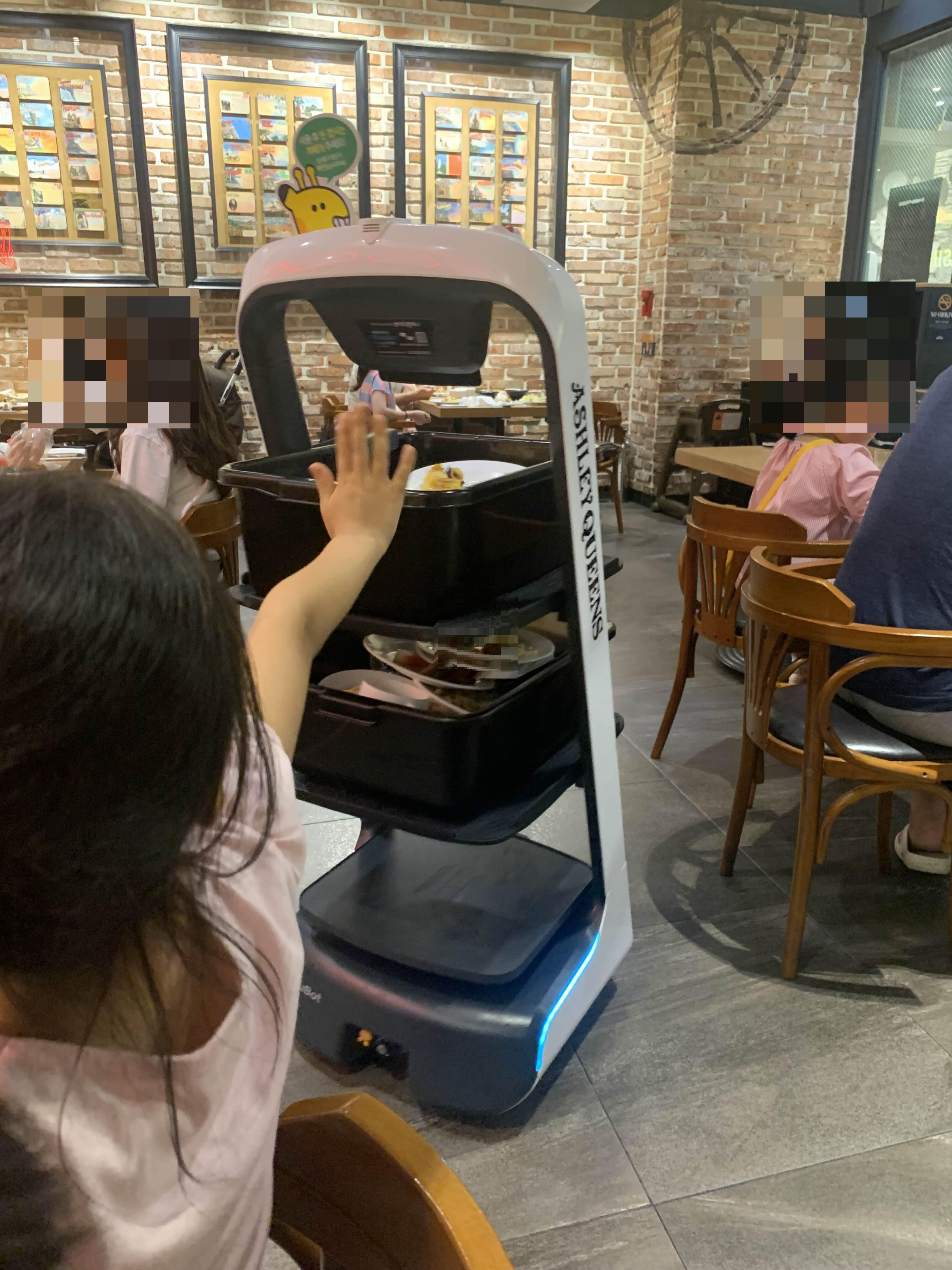 빈 접시는 로봇 호출 버튼을 누르면 로봇이 온다. 아이들이 좋아한다. 접시 하나씩 넣어서 확인하고 보내준다.