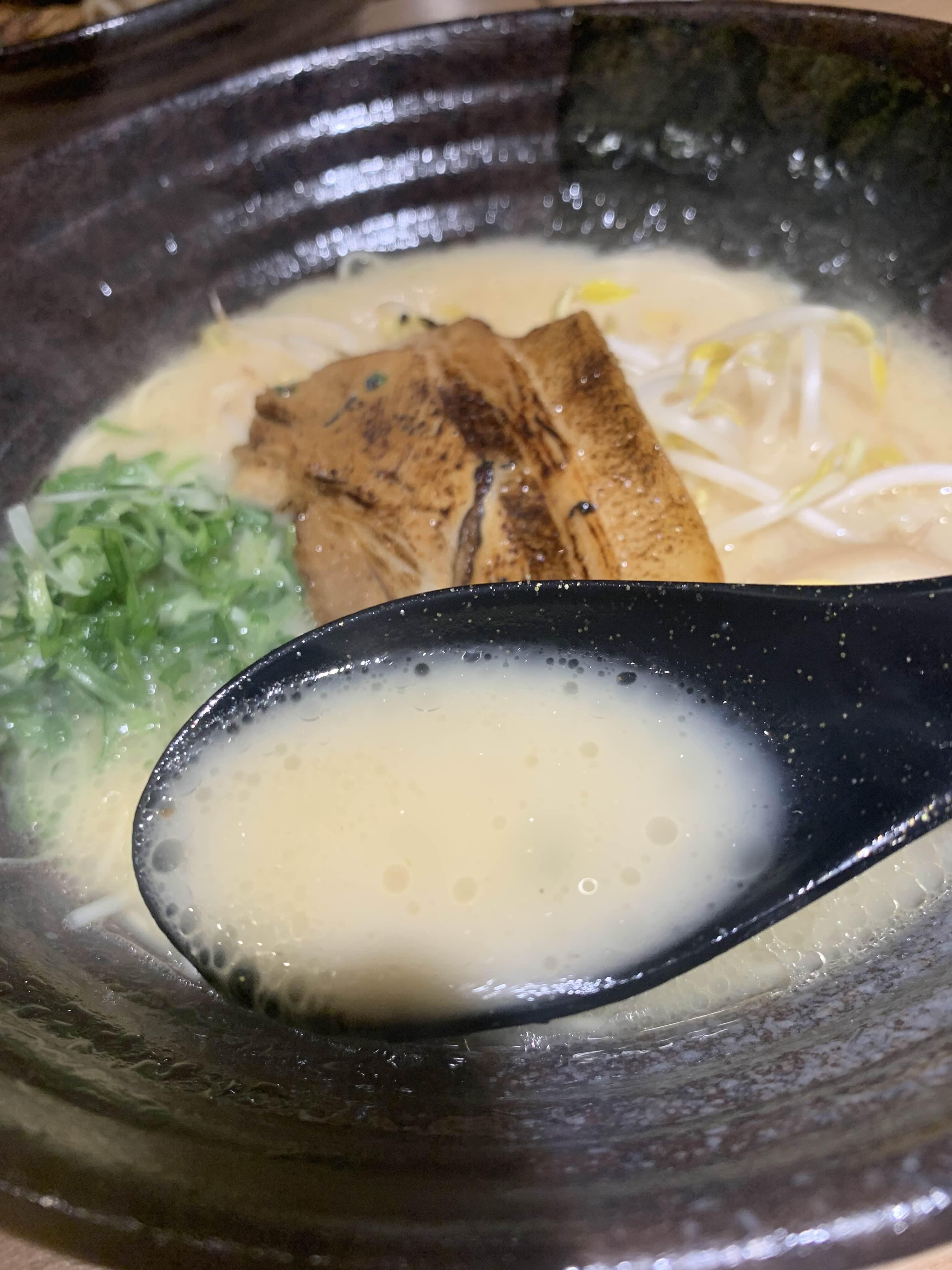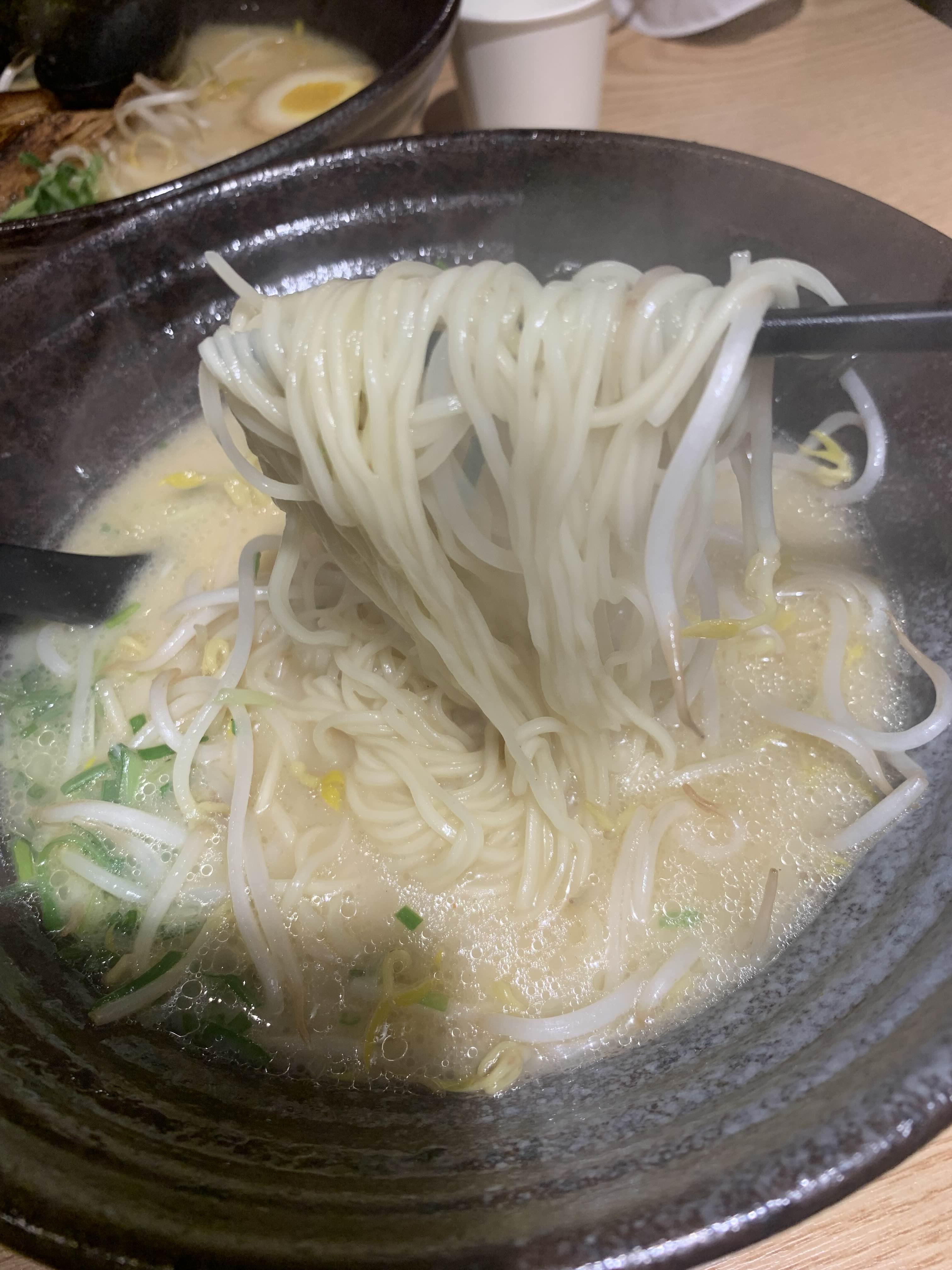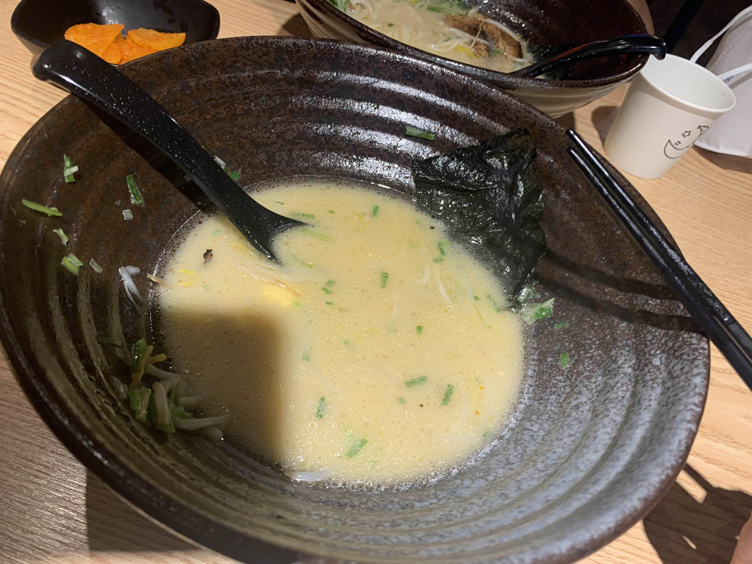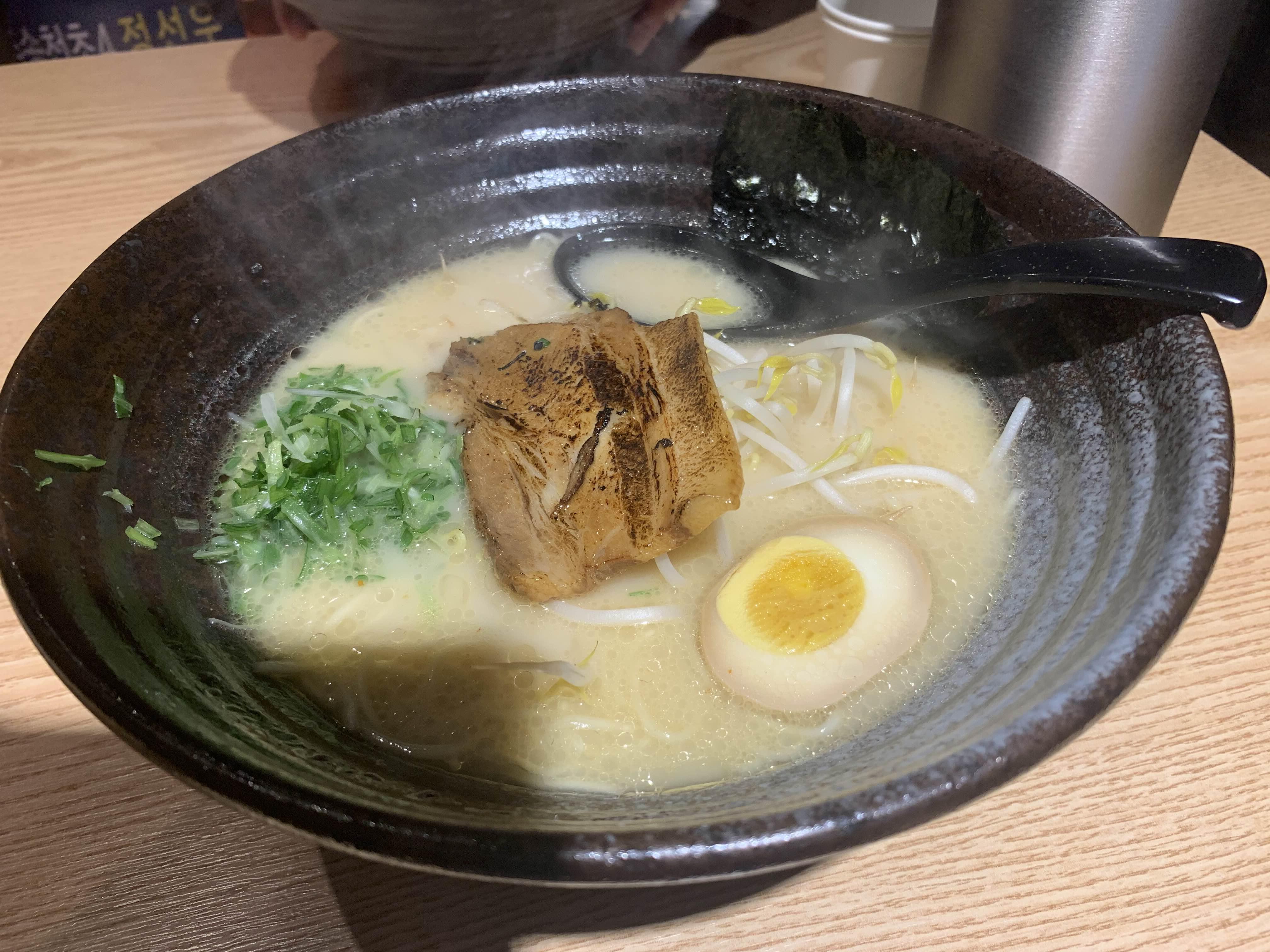 주문하고 오래되지 않아 돈코츠 라면이 나왔습니다. 라면 고명으로 숙주, 대파, 고기와 달걀 반절이 올라가 있습니다. 라면 국물은 너무 묵직하지 않은 깔끔한 돼지육수 향이 강하게 나더군요. 담백하니 맛이~~~ 입에 착착 달라붙어서...... 라면 두 젓가락질이면 끝날 정도의 양.....