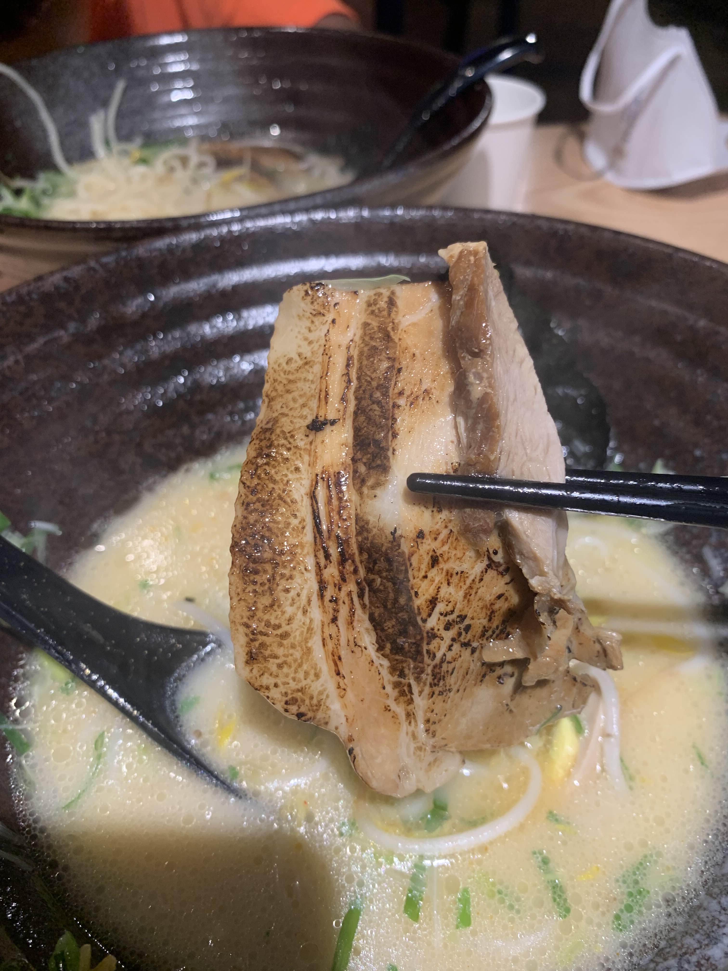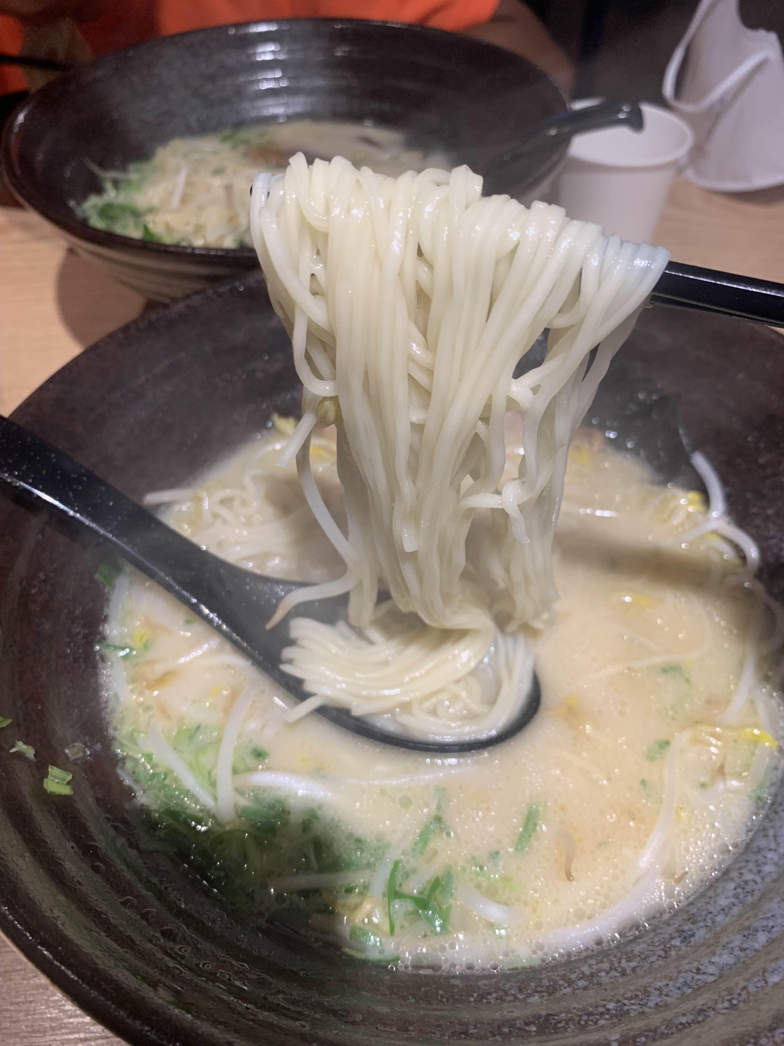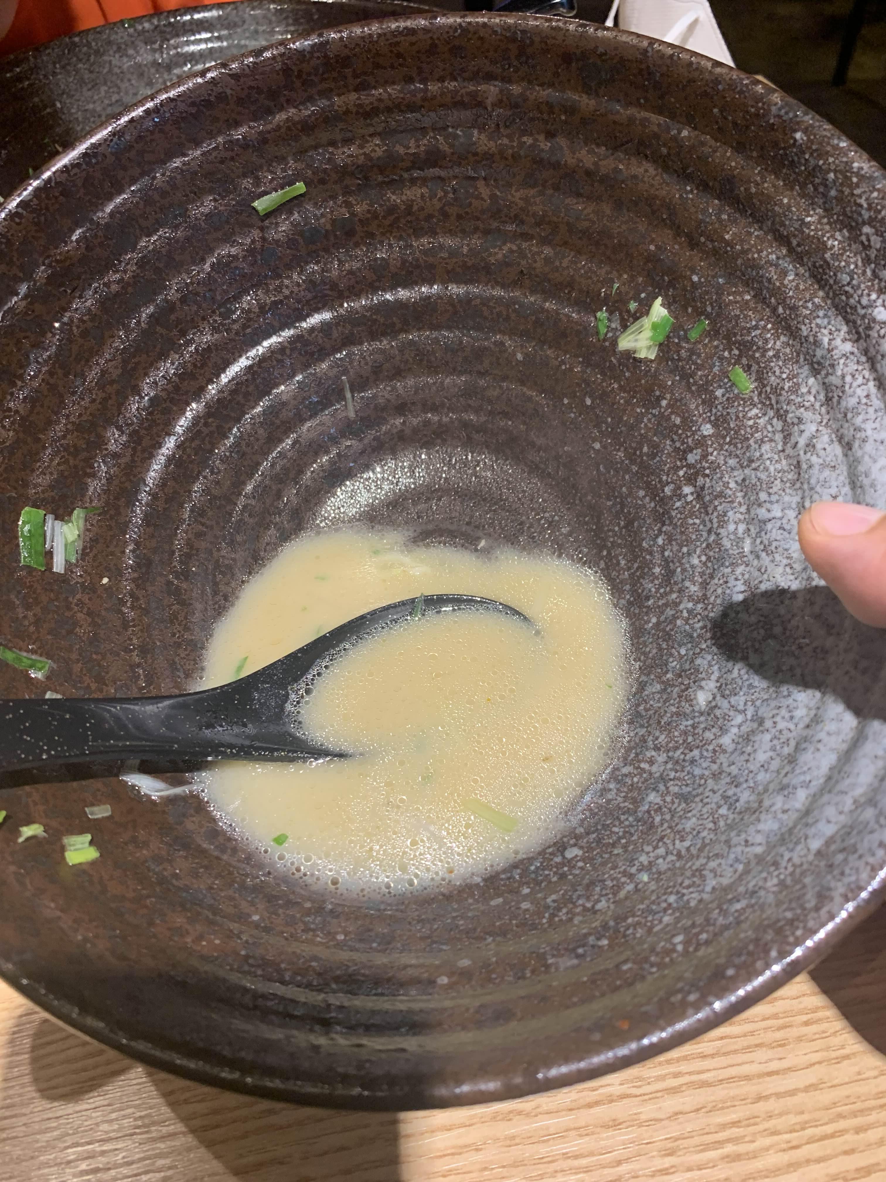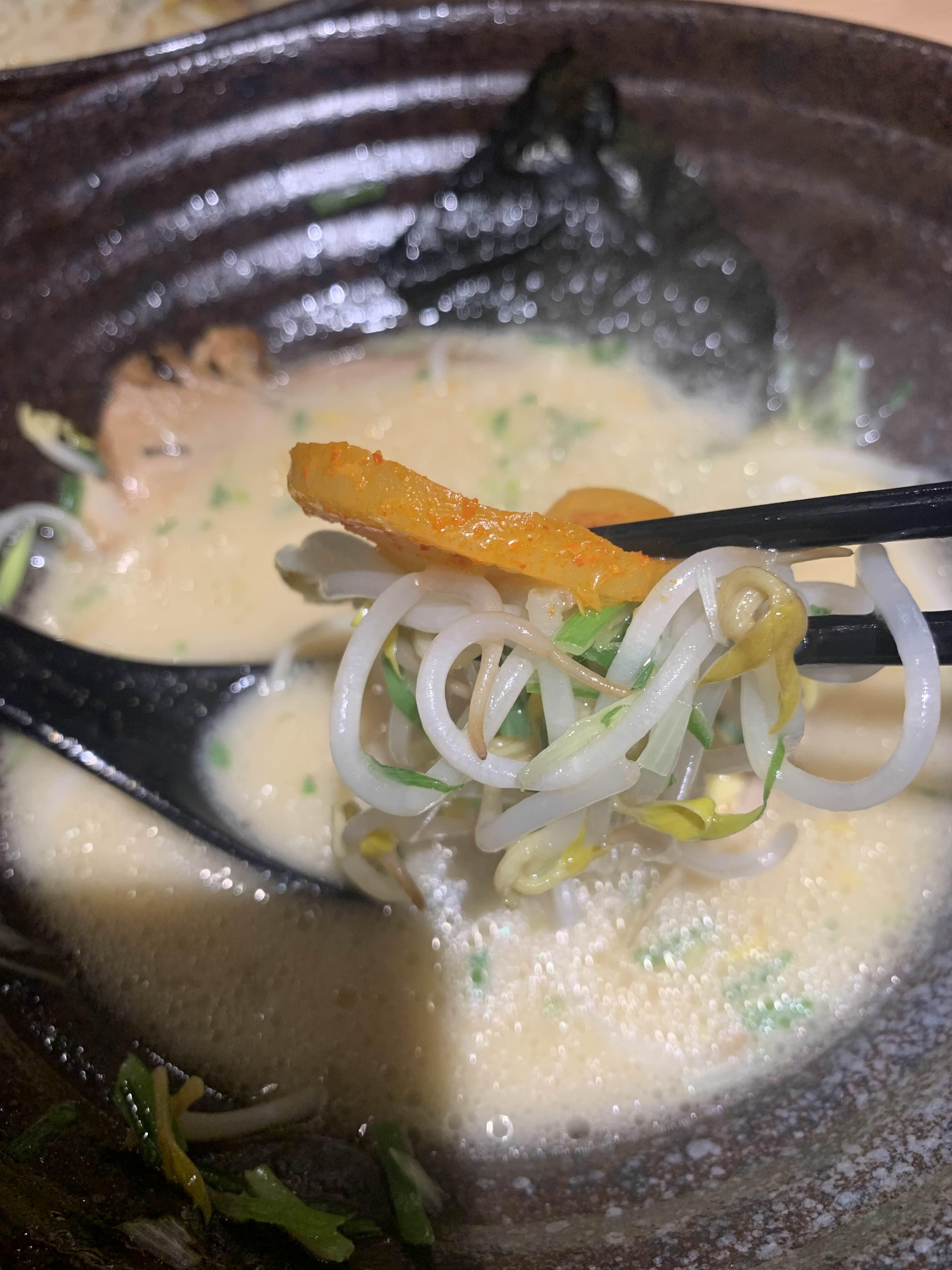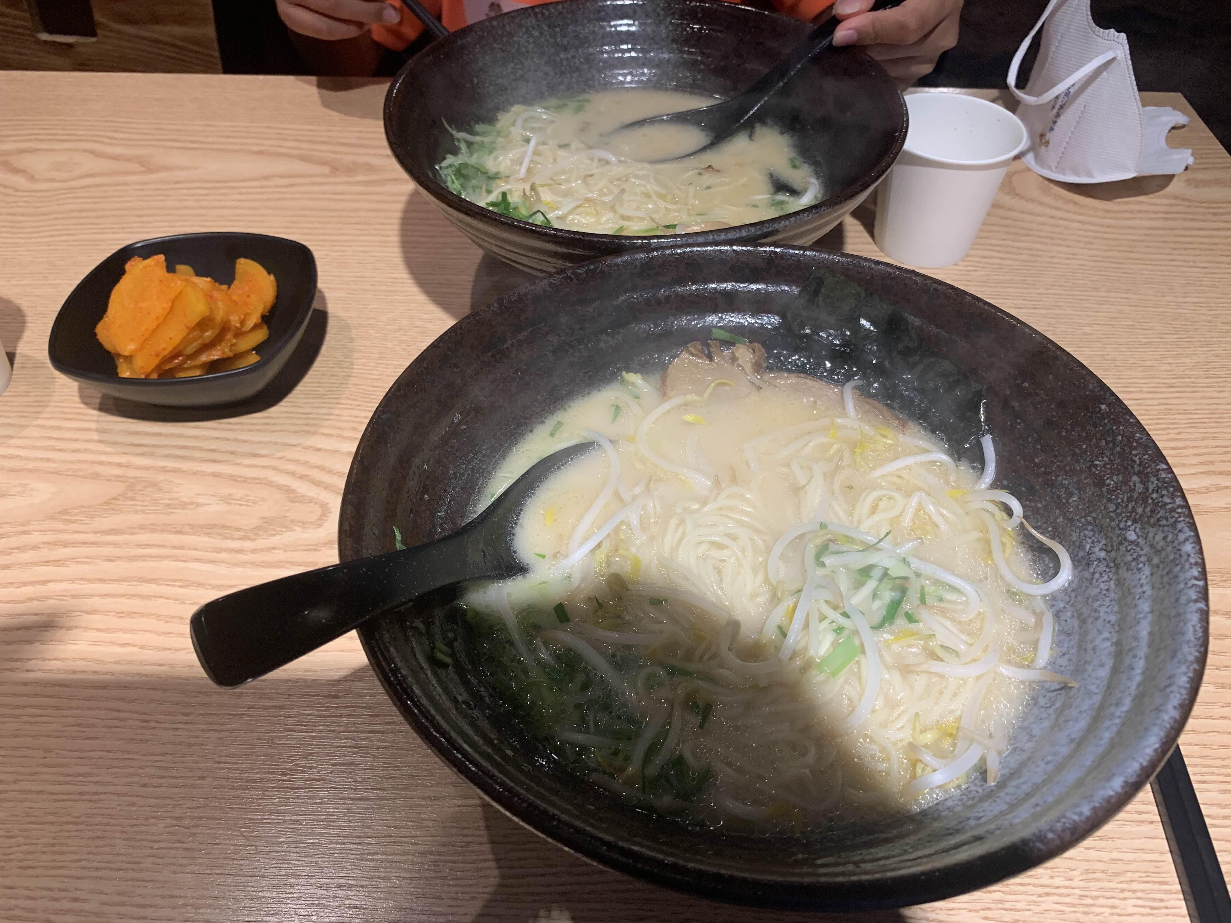 주문하고 오래되지 않아 돈코츠 라면이 나왔습니다. 라면 고명으로 숙주, 대파, 고기와 달걀 반절이 올라가 있습니다. 라면 국물은 너무 묵직하지 않은 깔끔한 돼지육수 향이 강하게 나더군요. 담백하니 맛이~~~ 입에 착착 달라붙어서...... 라면 두 젓가락질이면 끝날 정도의 양.....