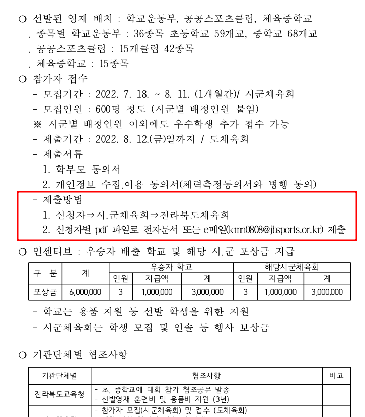 신청하는 방법은 제출서류 2개(학부모 동의서, 개인정보 동의서)를 이메일로 제출하는 방법이라는 안내문이 있습니다. 하지만..... 이렇게 신청하면, 신청서를 제출하라는 안내문이 있습니다. ㅎㅎ 그리고 신청서를 저 안내문의 메일이 아닌.... 각 시군 체육회 메일로 보내야 합니다. ㅎㅎ 암튼, 저 전라북도 체육회 담당자분께서 처리해주심^^