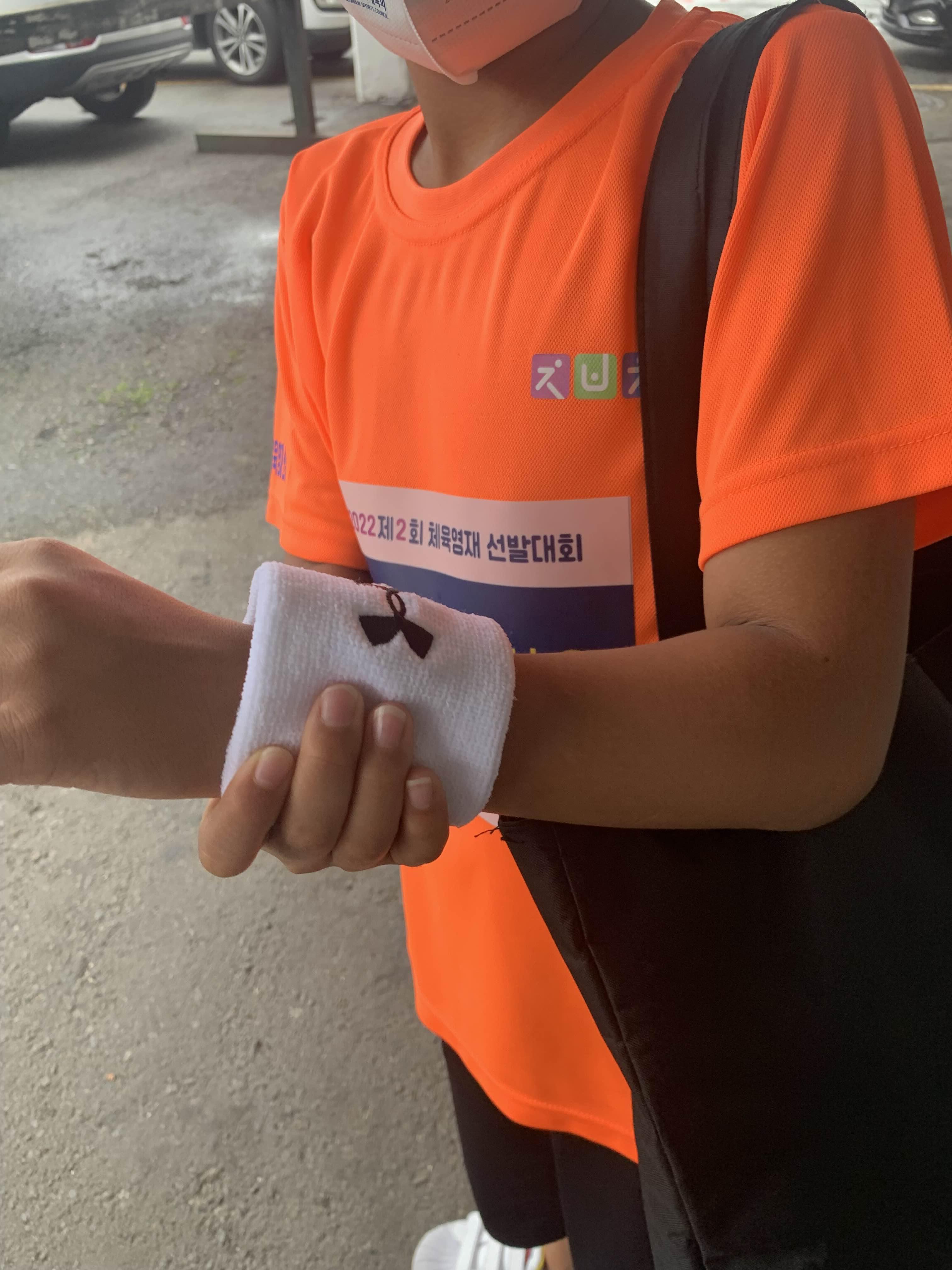 대회가 끝나고 아이가 도착했다..... 출발 복장과 도착 복장이 다르다. 대회에 참가한 아이들에게 티셔츠를 한벌씩 나누어 주었나 보다. 티 셔터가 나름 괜찮다. 그리고 마스크와 손목아대를 지급하였는데, 대회 기념품으로 간직하기 좋은 물품인 거 같다. 체육회에서 나름 대회 준비를 많이 하신 거 같다.