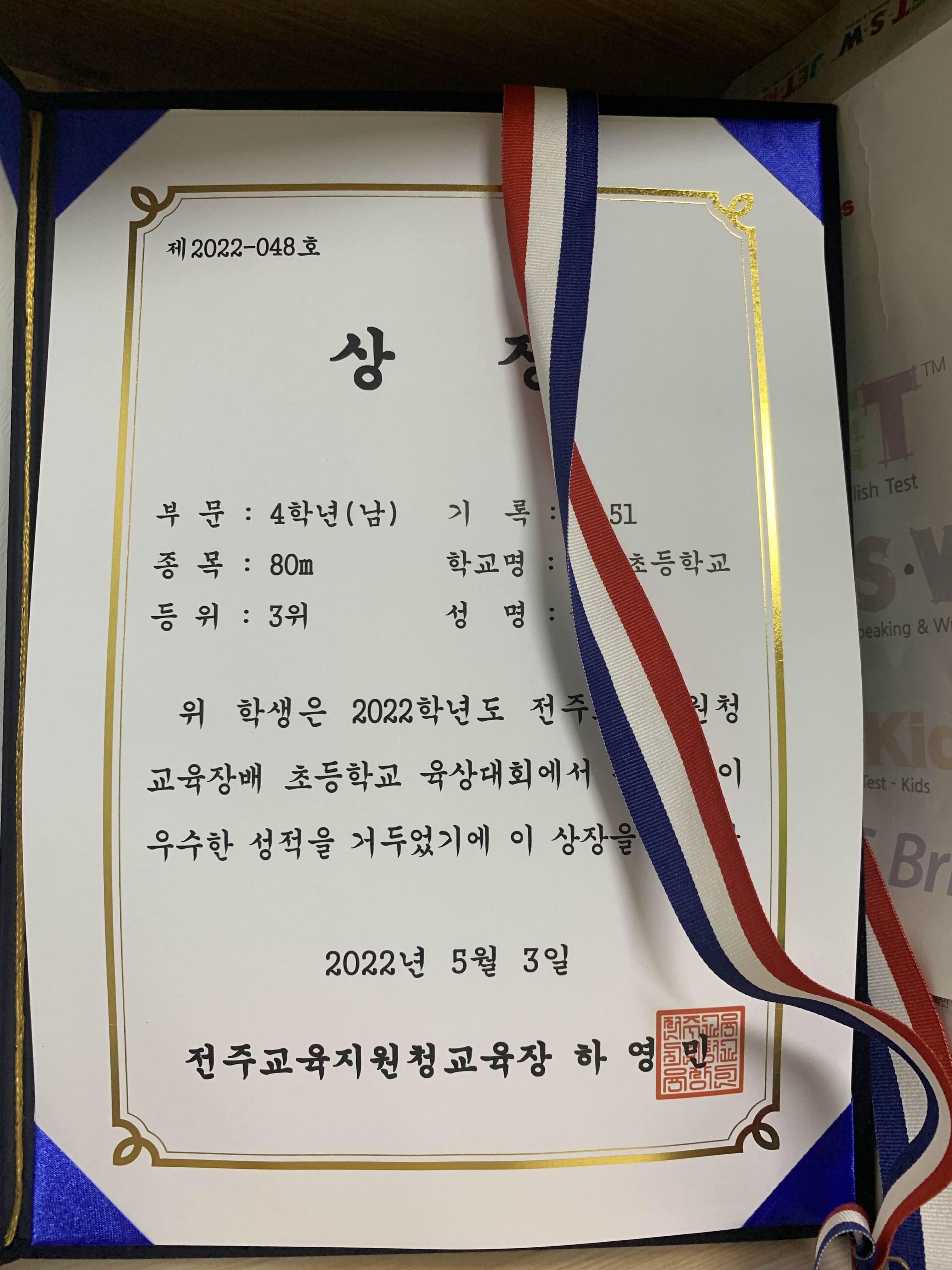자녀가 나를 닮아서 그런지.... 운동을 잘한다. 무슨 운동이든..... 그냥 잘한다. 그렇다고, 체육인이 될 정도는 아니고.... 보통의 아이들보다 잘하는 정도라... 운동은 연습을 통해서 잘해지는 부분도 있지만, 기본적으로 신체능력이 뒷받침해주어야 한다. 올해 전주시 달리기 대회에서 3위~~~ 음... 나보다 좀 잘하는 거 같은 느낌이..ㅎㅎ