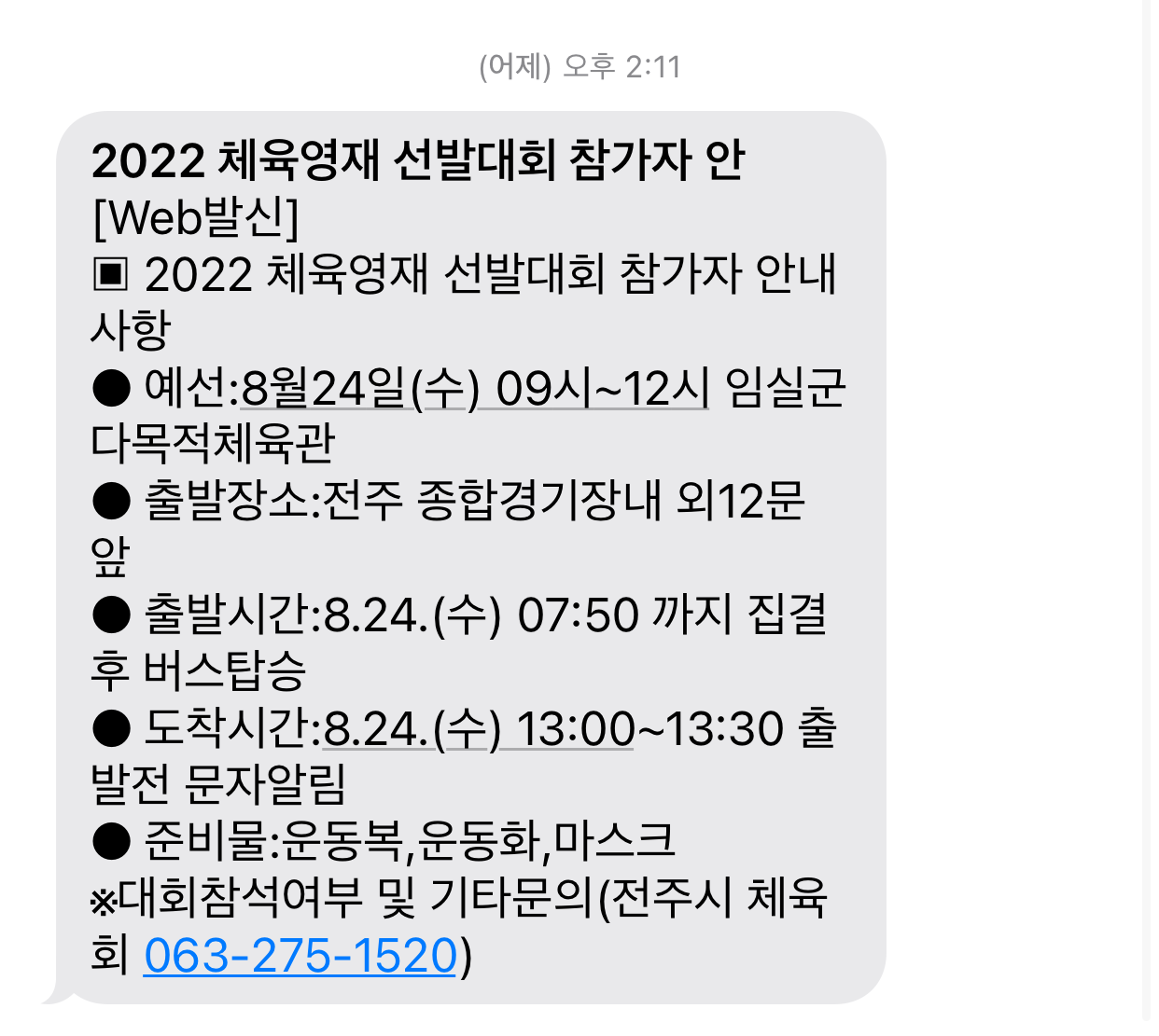 대회 며칠 전.... 안내 문자가 발송됩니다. 참가자 집결장소와 시간입니다. 집결장소는 전주 종합경기장 내 외 12 문 앞으로 해당 장소는 전주시체육회 사무실이 있는 장소이더군요. 집결시간은 7시 50분까지.... 임실까지 가야 하니.... 좀 일찍 집결하는 거 같습니다. 근데!!! 이 행사를 전주에서 하지 왜 임실까지 가서 하는 건지? 무슨 이유가 있나? 전주에서 했으면.. 아이 선발대회 참가해서 하는 모습 사진 좀 찍어주는 건데.....