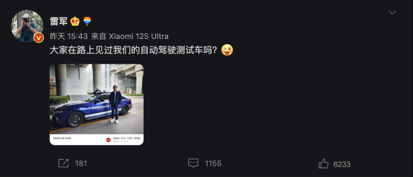 최근 샤오미 레이쥔(Lei Jun) 회장은 자신의 SNS에 "길에서 우리 자율주행 테스트카 본 적 있어?"라는 글과 함께 샤오미 자율주행 테스트카와 함께 찍은 사진을 올렸다. 샤오미는 지난 6월 스마트 전기차 사업 진출을 발표하면서 "내 인생의 마지막 메이저 기업 프로젝트다. 내 인생에 내 모든 명성을 걸고, 개인적으로 팀을 이끌고, 샤오미를 위해 싸울 의향이 있다"라고 말했다.