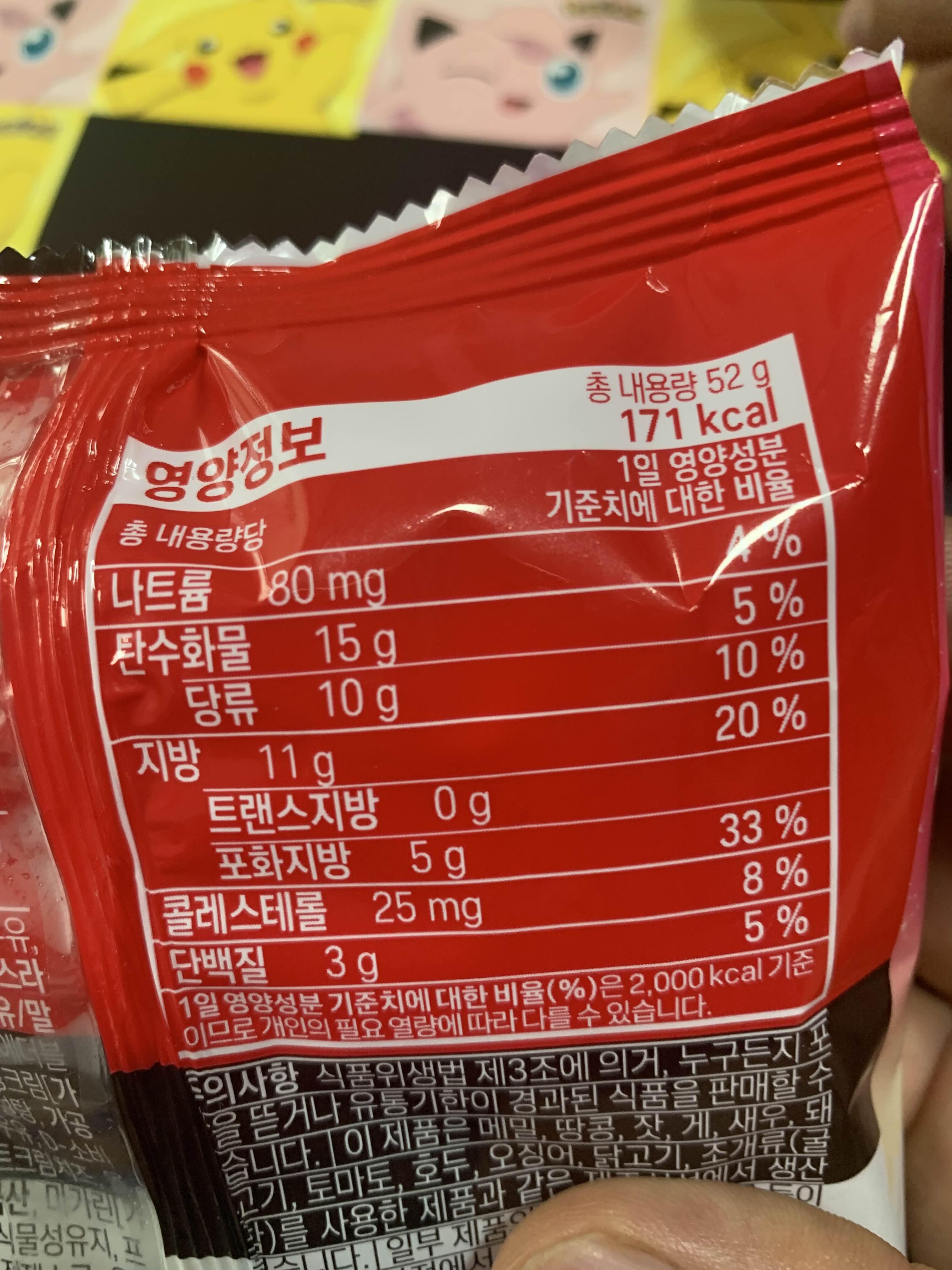 더욱이 다이어트를 하고 있는 나에게 171칼로리는 포켓몬빵 중 가장 적은 칼로리 릴 가지고 있습니다. 이 빵의 최대 단점이라고 해야 하나? 단점은!!! 냉장보관이라 그런지? 빵 제작 수량이 적어서 그런지? 대형마트에서 판매하지 않고 있습니다. 포켓몬빵을 주로 대형마트에서 구입하는 나에게는 구입하기 어려운 빵!!! 편의점에서 구입해야 합니다.
