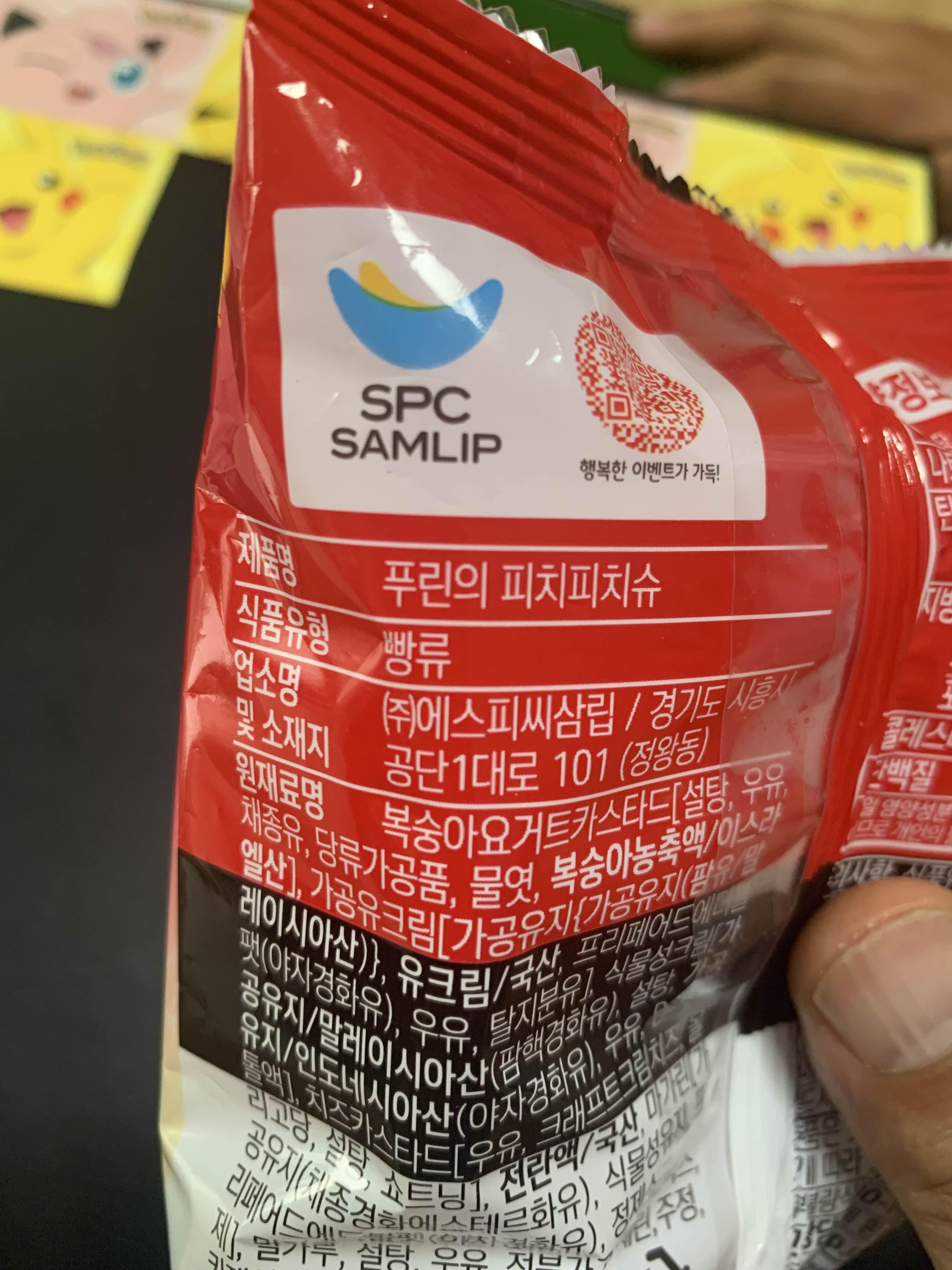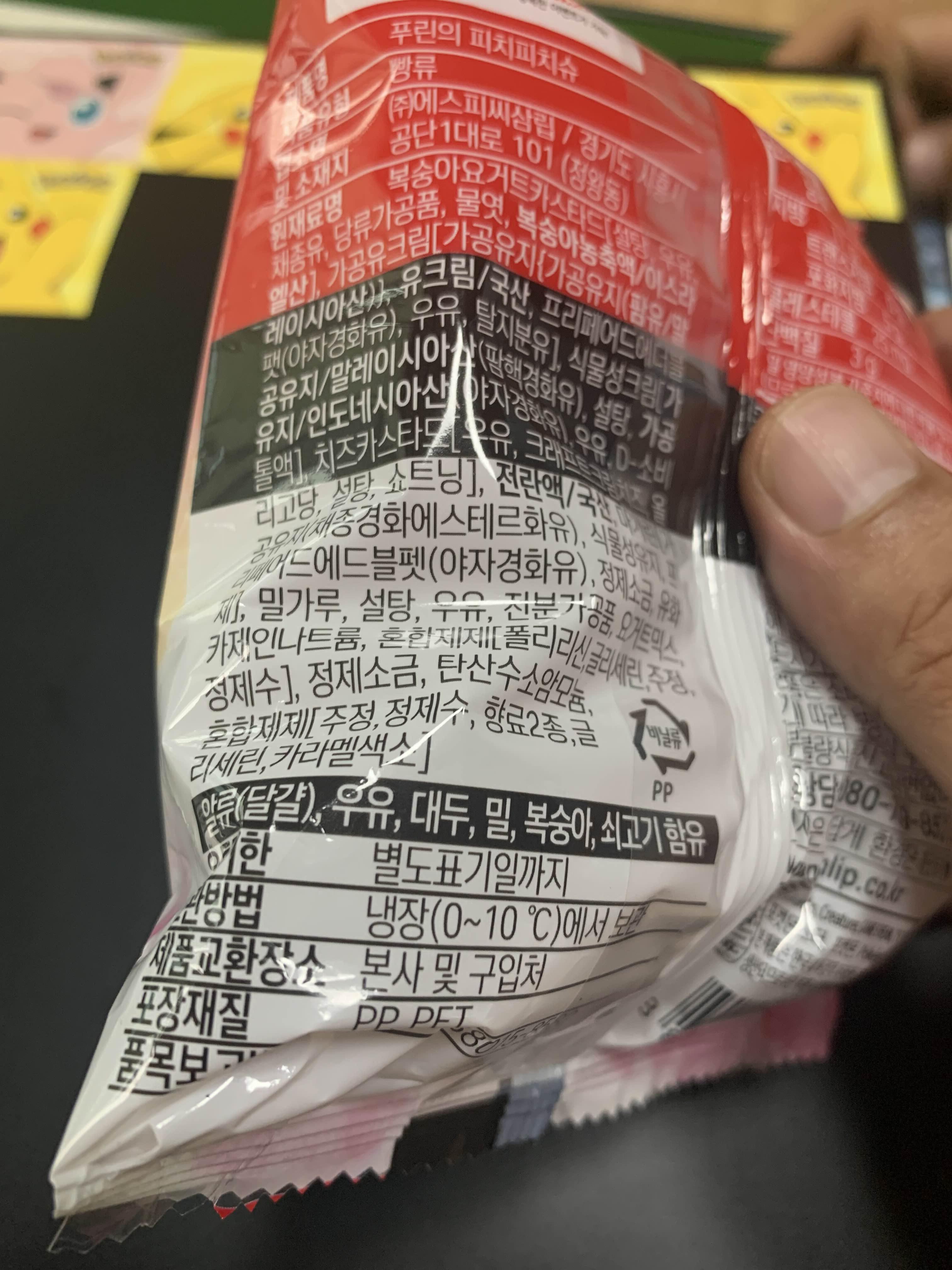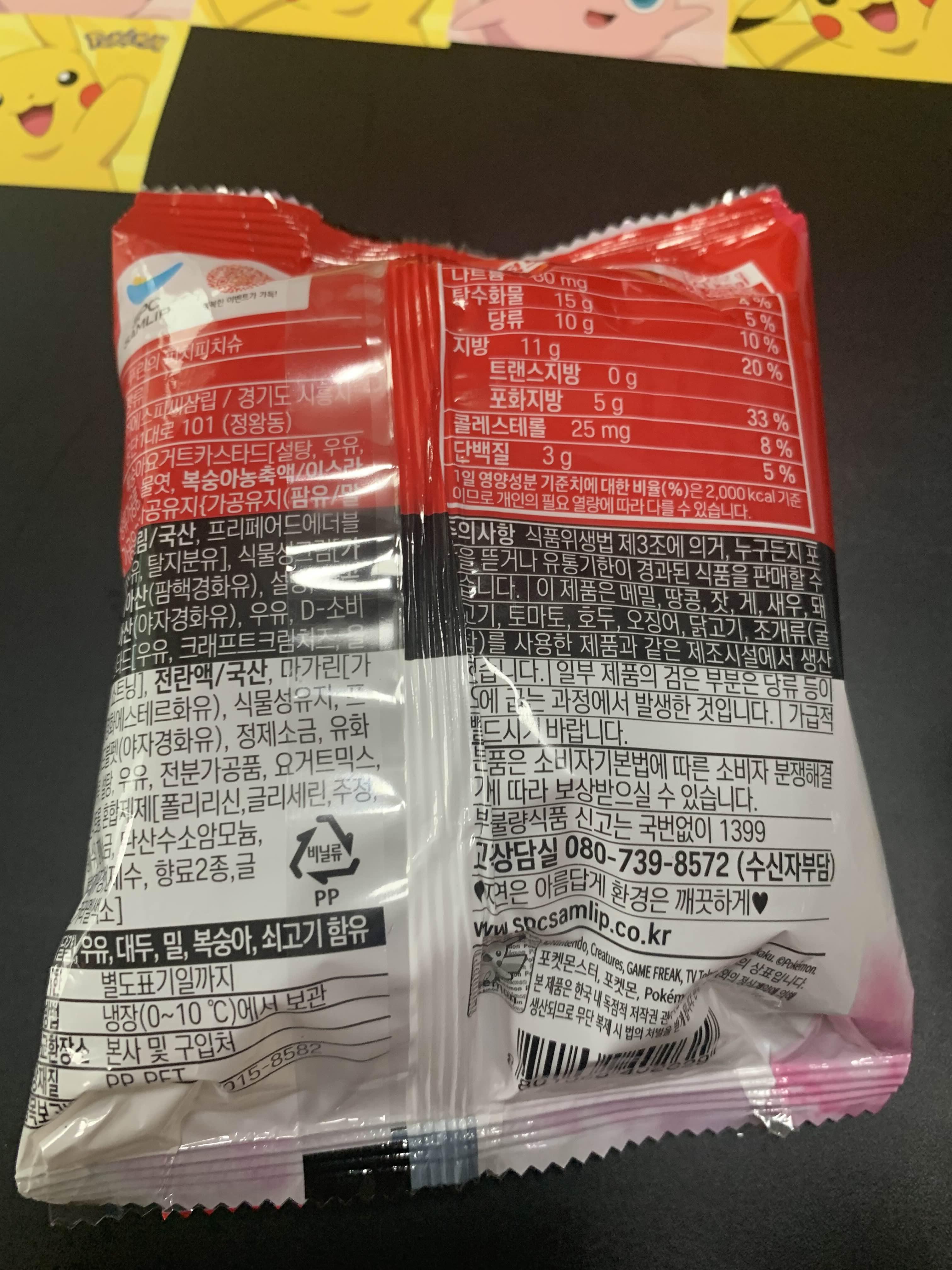포장지 뒷면에 제품명에는 "푸린의 피치피치 슈"라고 명시되어 있습니다. ㅎㅎ 다른 빵에는 다른 명칭이 있는 빵도 있기는 하지만^^ 푸린의 피치피치 슈의 최대 단점이라고 하면... 냉장보관입니다. 포켓몬빵을 되판 매 하는 사람들에게는 안 좋겠지만!! 직접 구입하여 먹어야 하는 나에게는 최고의 빵입니다.