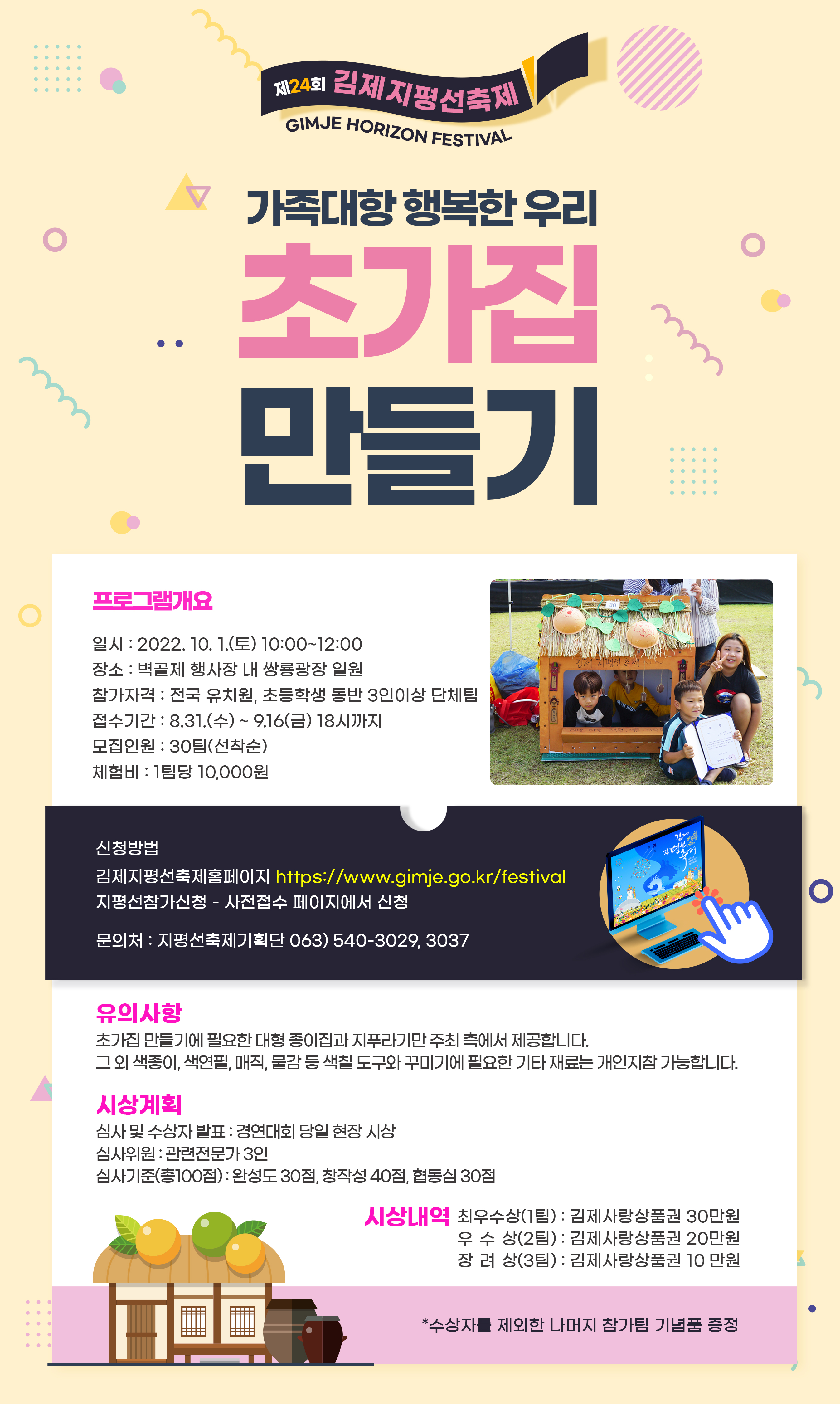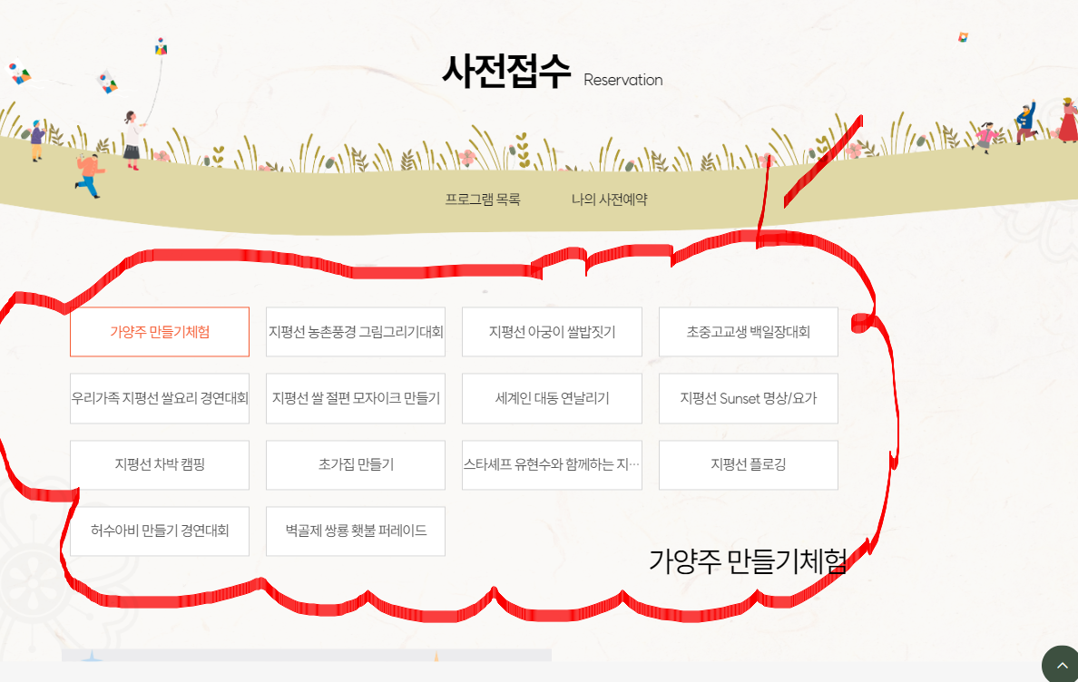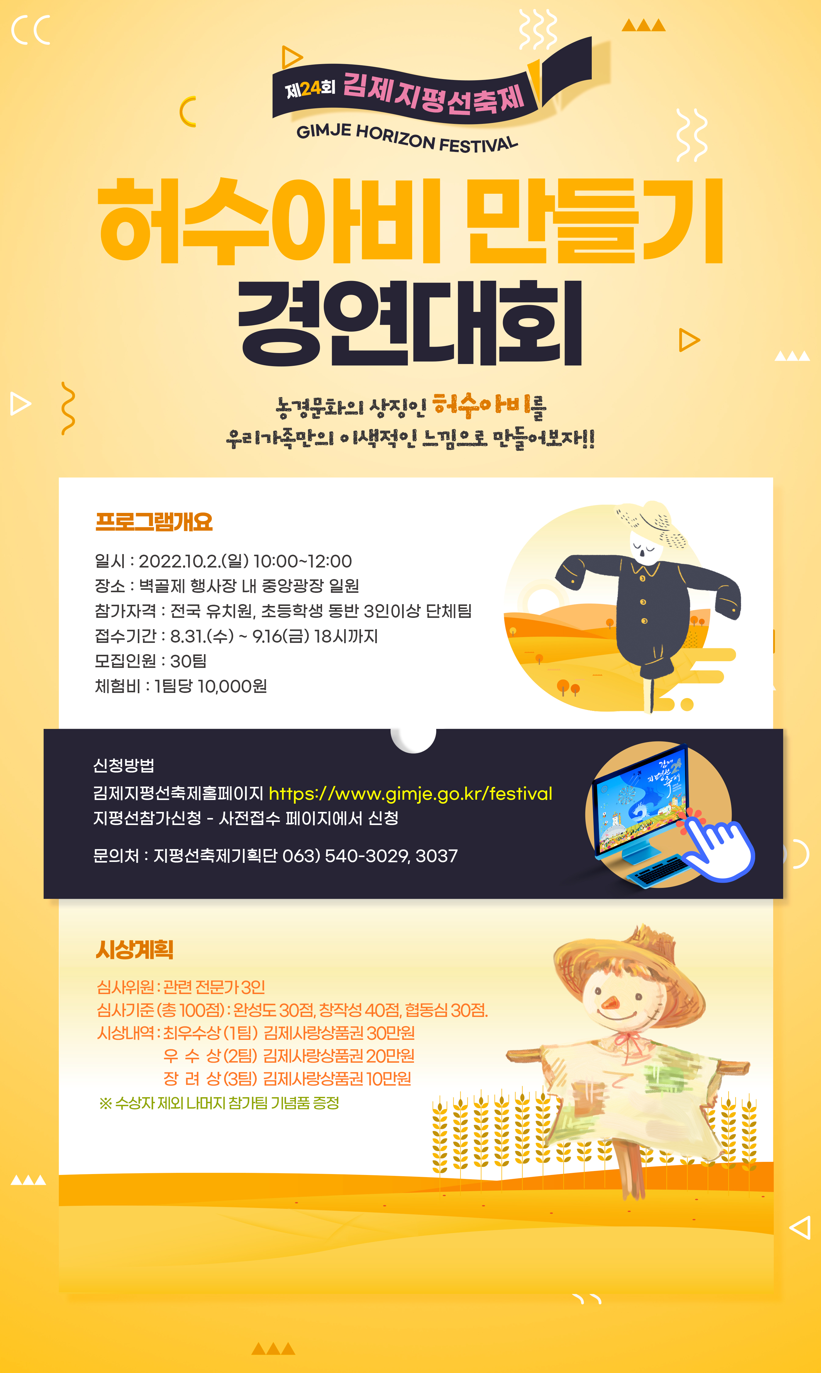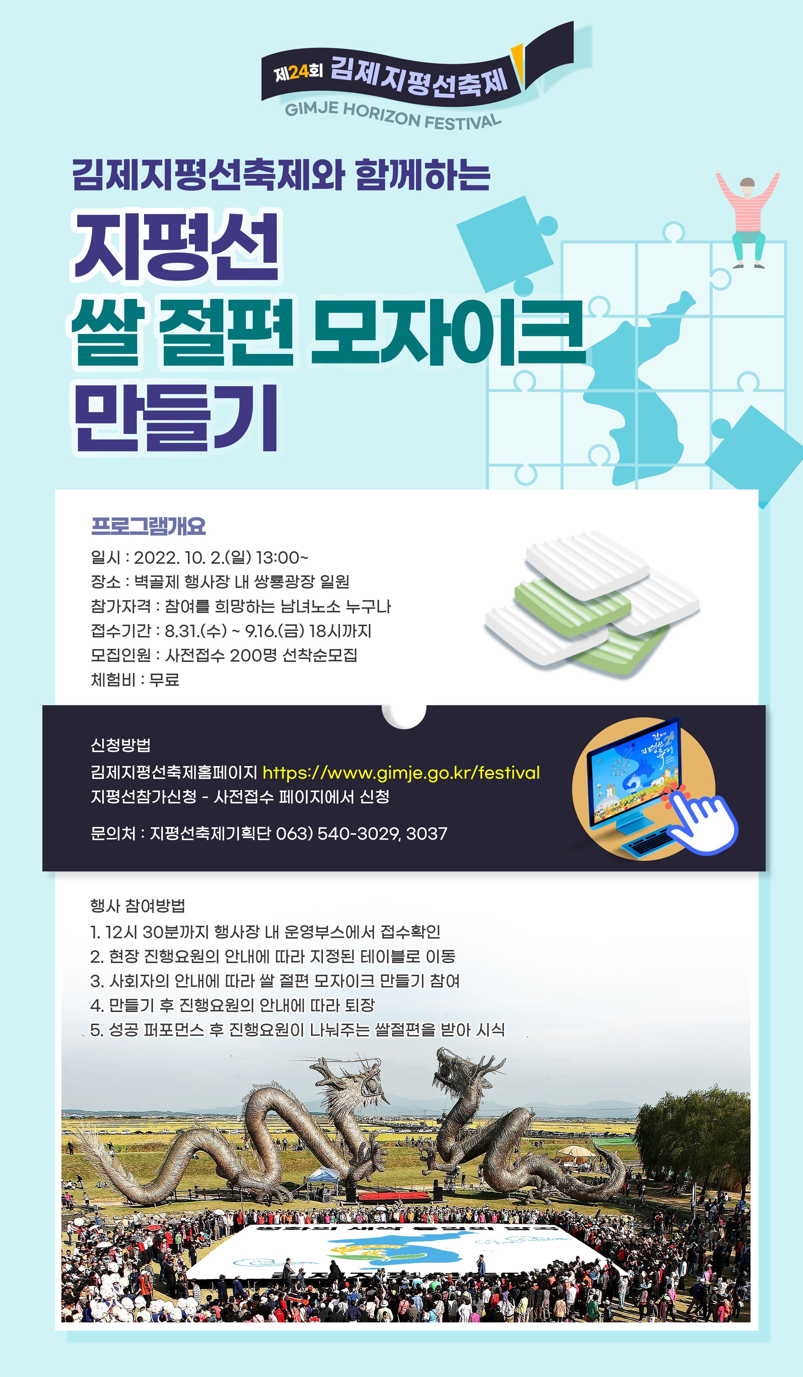 코로나19 여파로 행사가 진행되지 않았던, 김제 지평선 축제가.... 드시어 올해 다시 진행하게 되었습니다. 축제의 다양한 프로그램을 자녀들과 체험하고자 사전예약을 진행하였습니다.