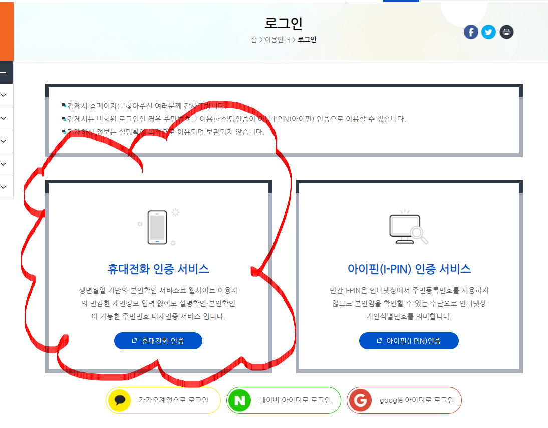 그리고 본인인증이 필요합니다. 로그인하는 방법은 휴대전화 인증 서비스 또는 아이핀 인증 서비스를 이용하여 인증하시면 됩니다. 저는 평소 휴대전화 인증을 자주 사용하여 휴대전화 인증으로 들어갔습니다.