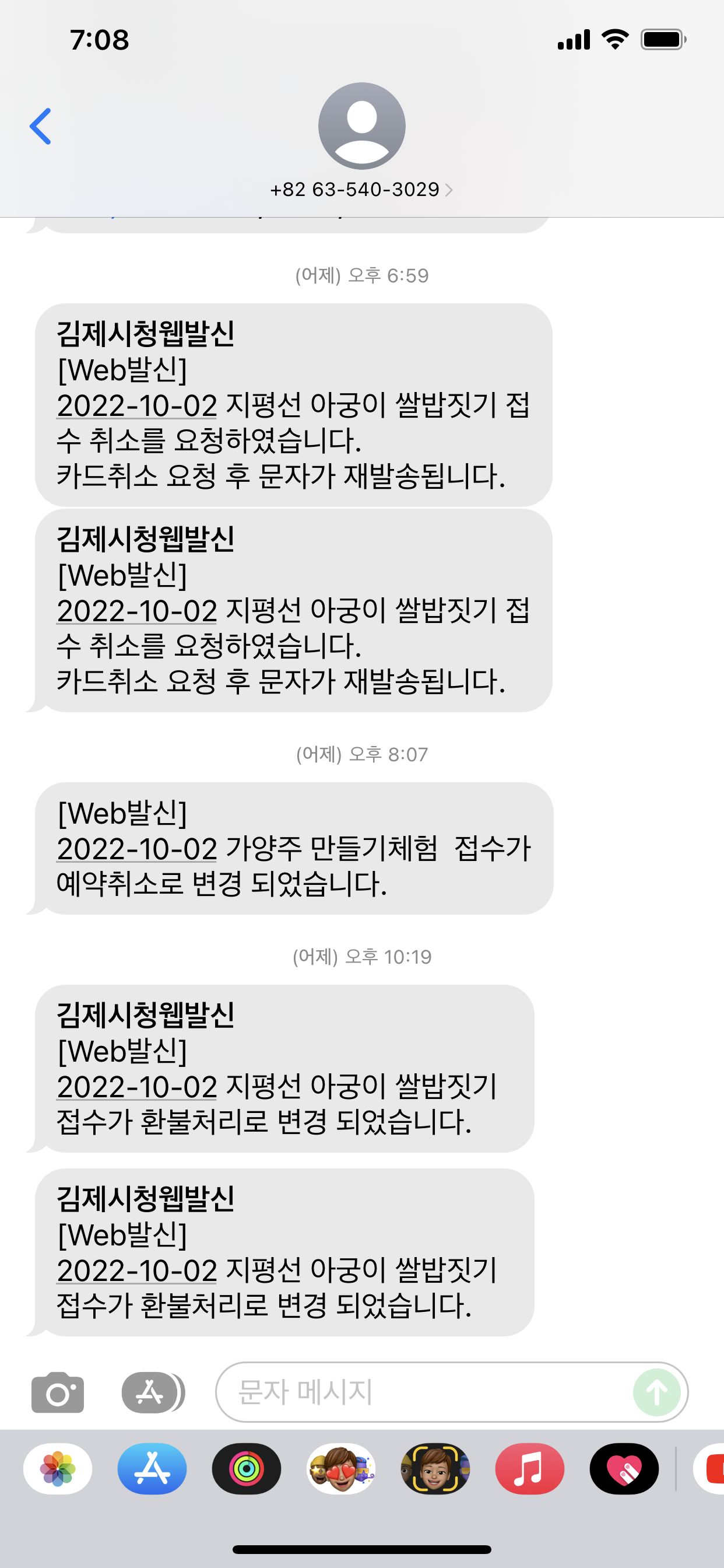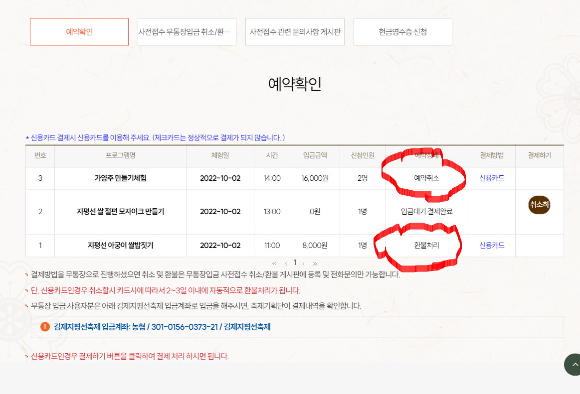 사전예약을 하고.... 전화가 오더군요. 예약사이트 오류로 인해 취소를 하셔야 한다는.... 취소하고 다시 예약을 해야 한다고 하더군요. 그래서, 알았다고 전화를 끊고서 저녁에 취소하고 예약해야지 했는데.... 취소를 하는 게 아니고, 취소를 당했습니다. ㅠㅠ 문자에는 "2022-10-02 지평선 아궁이 쌀밥 짓기 접수 취소를 요청하였습니다."인데... 요청인데, 주체 측에서 취소를 해버렸더군요.ㅠㅠㅠ
