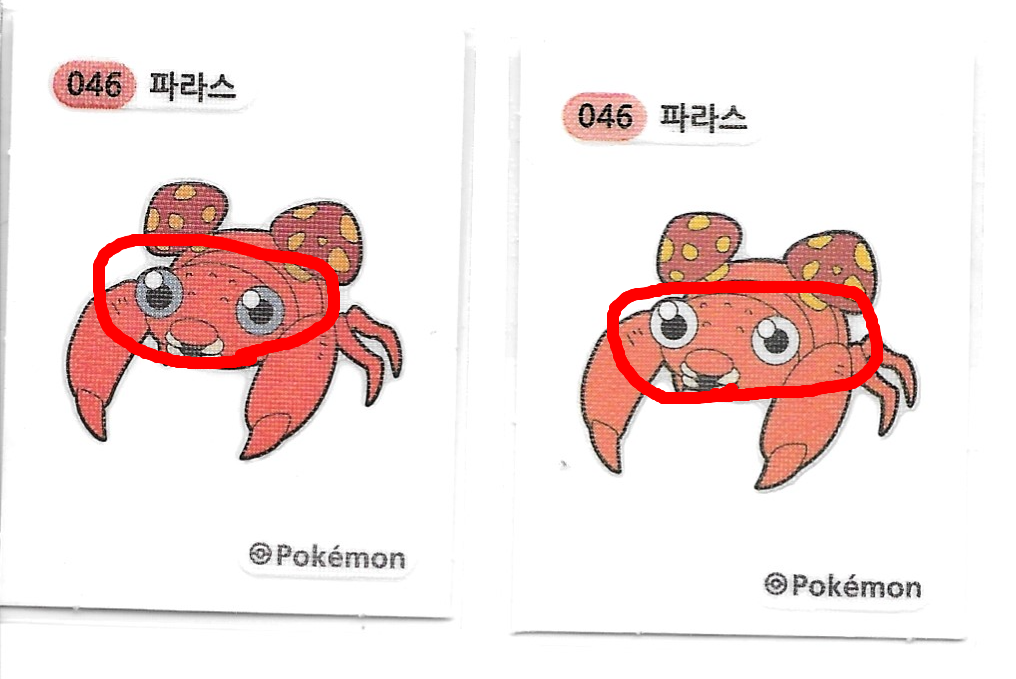 2차 검증은 포켓몬 공식 사이트의 도감 색상으로 확인하였습니다. 눈동자의 가장자리 색상은 흰색이더군요. 기존의 띠 부실 색상이 약 청색이 잘 못되어... 신규 띠 부실 제작하며 수정하였나 봅니다. 오류 씰의 가치는 희소성인데... 파라스는 이미 많은 띠 부실이 만들어져서... 희소성의 가치가 있을지는 의문이 드는군요.ㅎㅎ 가치를 떠나서 오류실이 맞기는 하겠네요.ㅎ