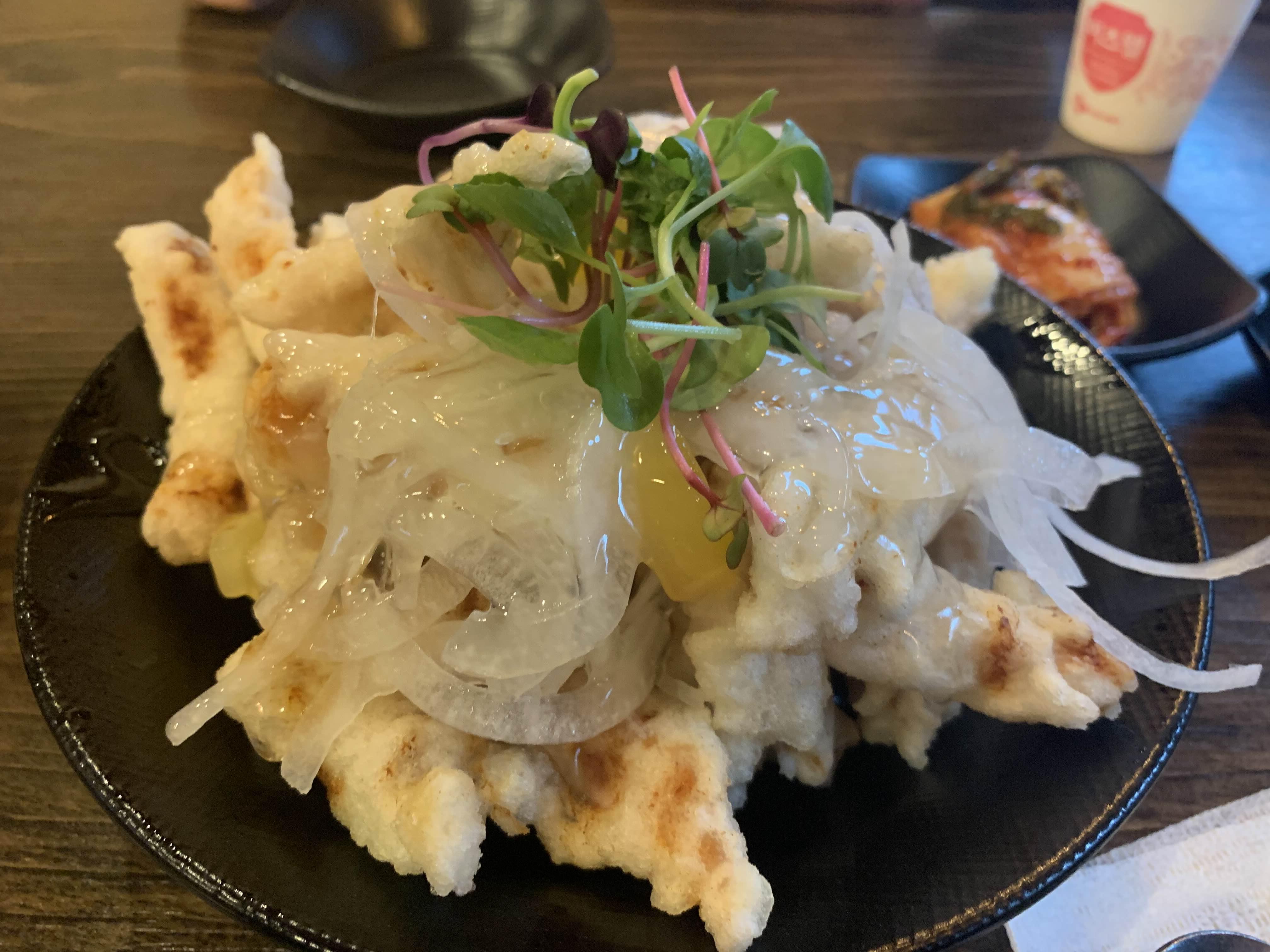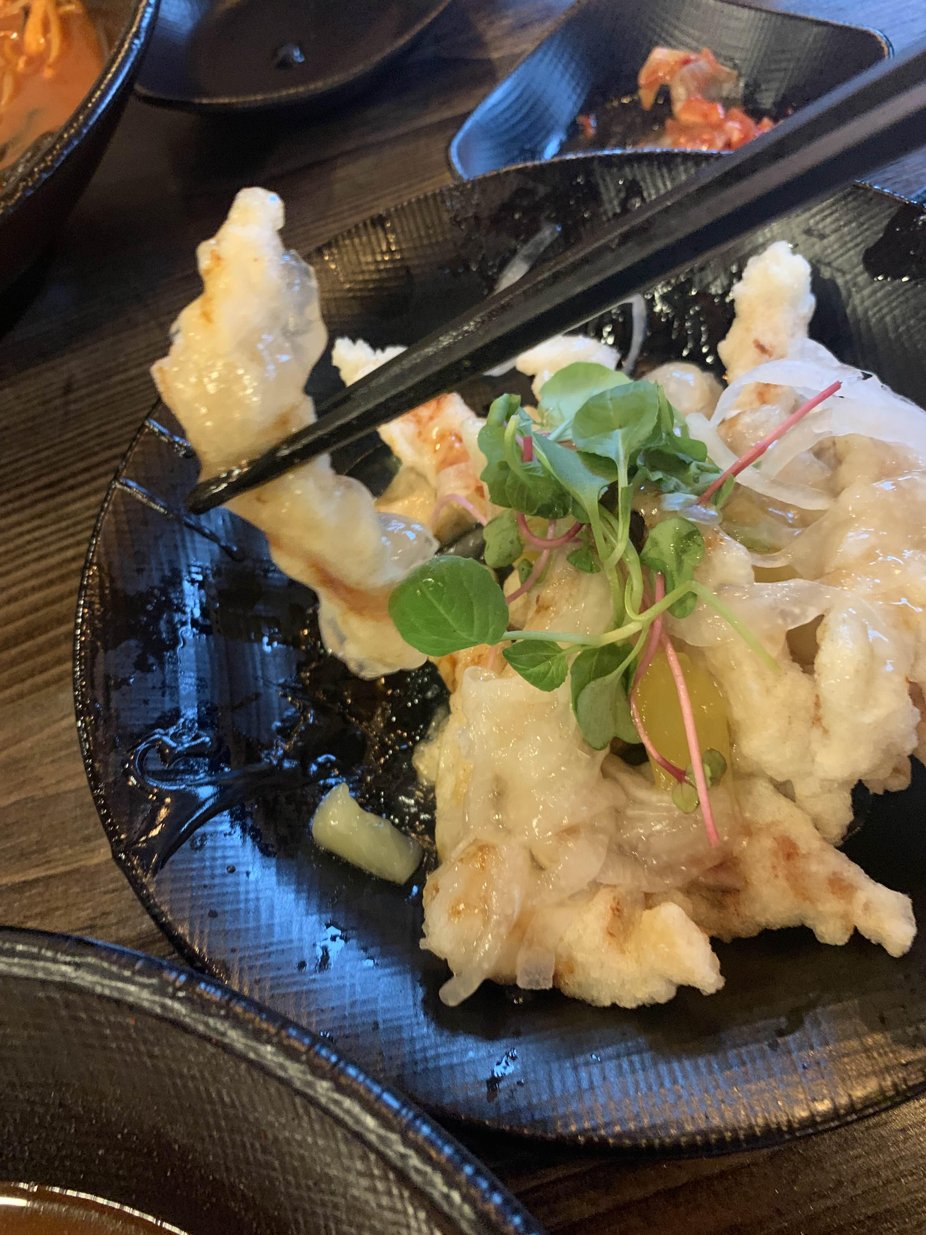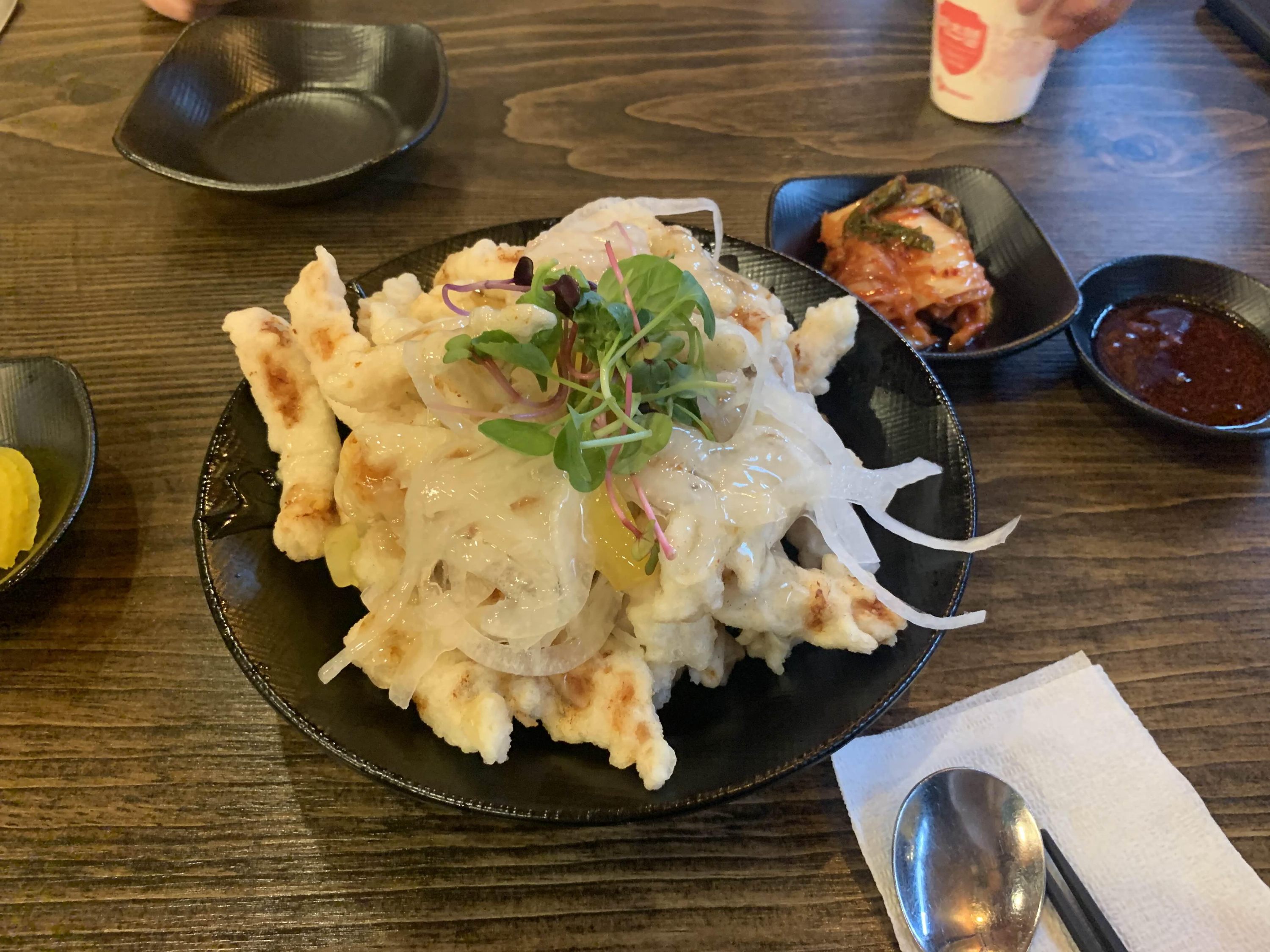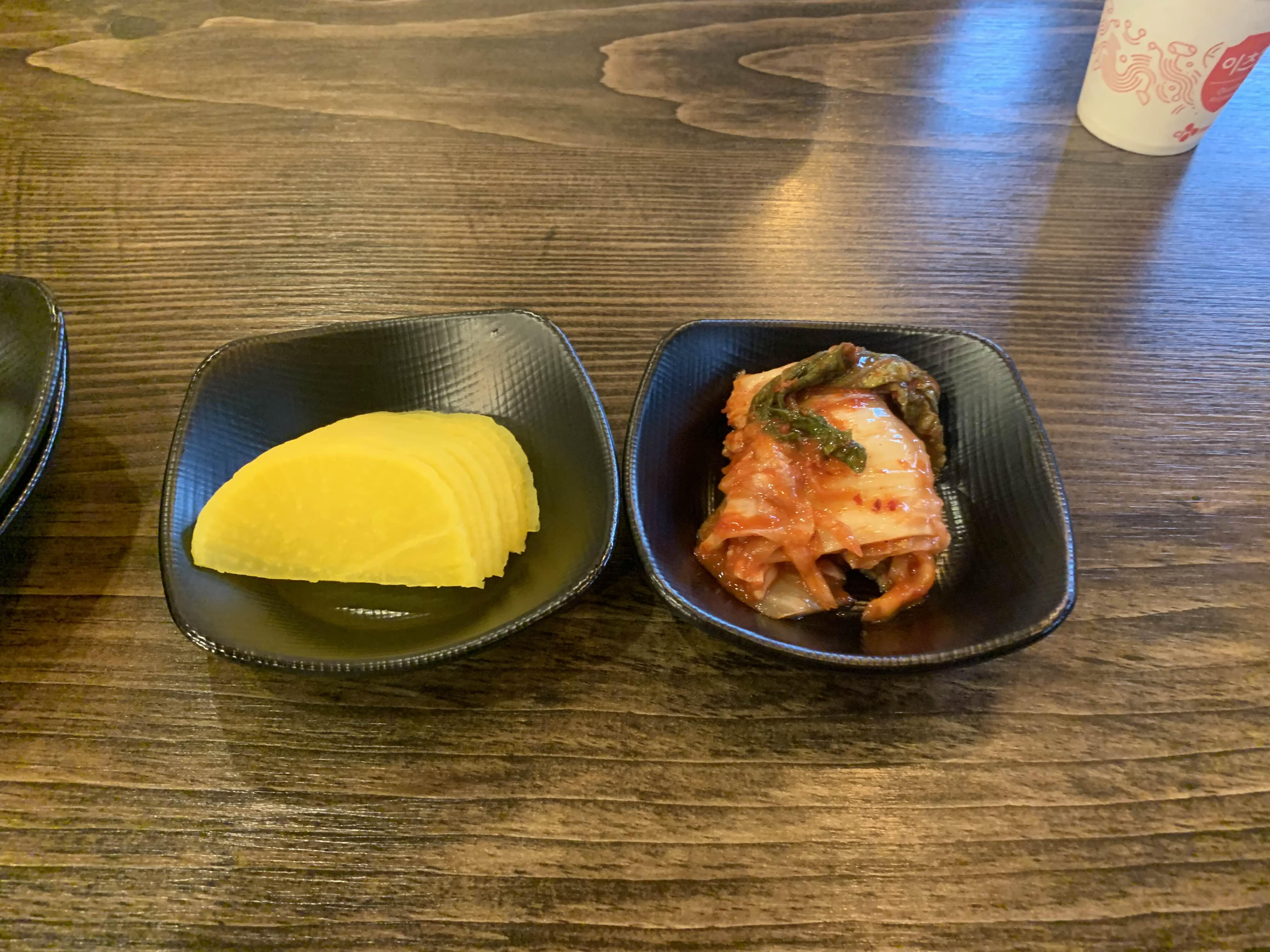 사전에 음식을 주문하여... 테이블에 앉아마자 음식이 나오더군요. 우선 기본 세팅은 밑반찬으로 단무지와 배추김치!! 그리고 탕수육이 바로 나왔습니다. 탕수육은 부먹/찍먹 선택할 수 없는.... 부먹으로 나옵니다. ㅎㅎ
