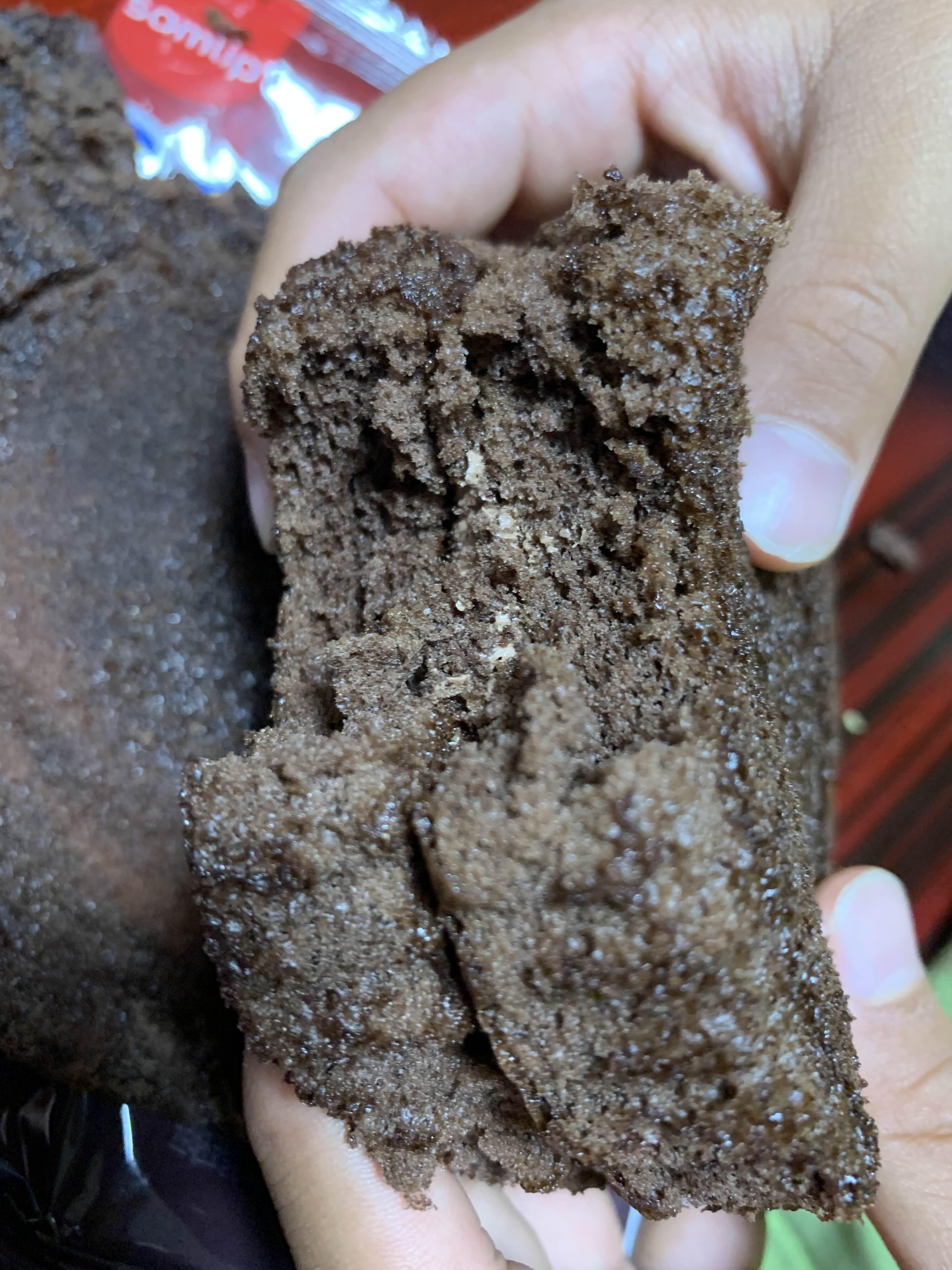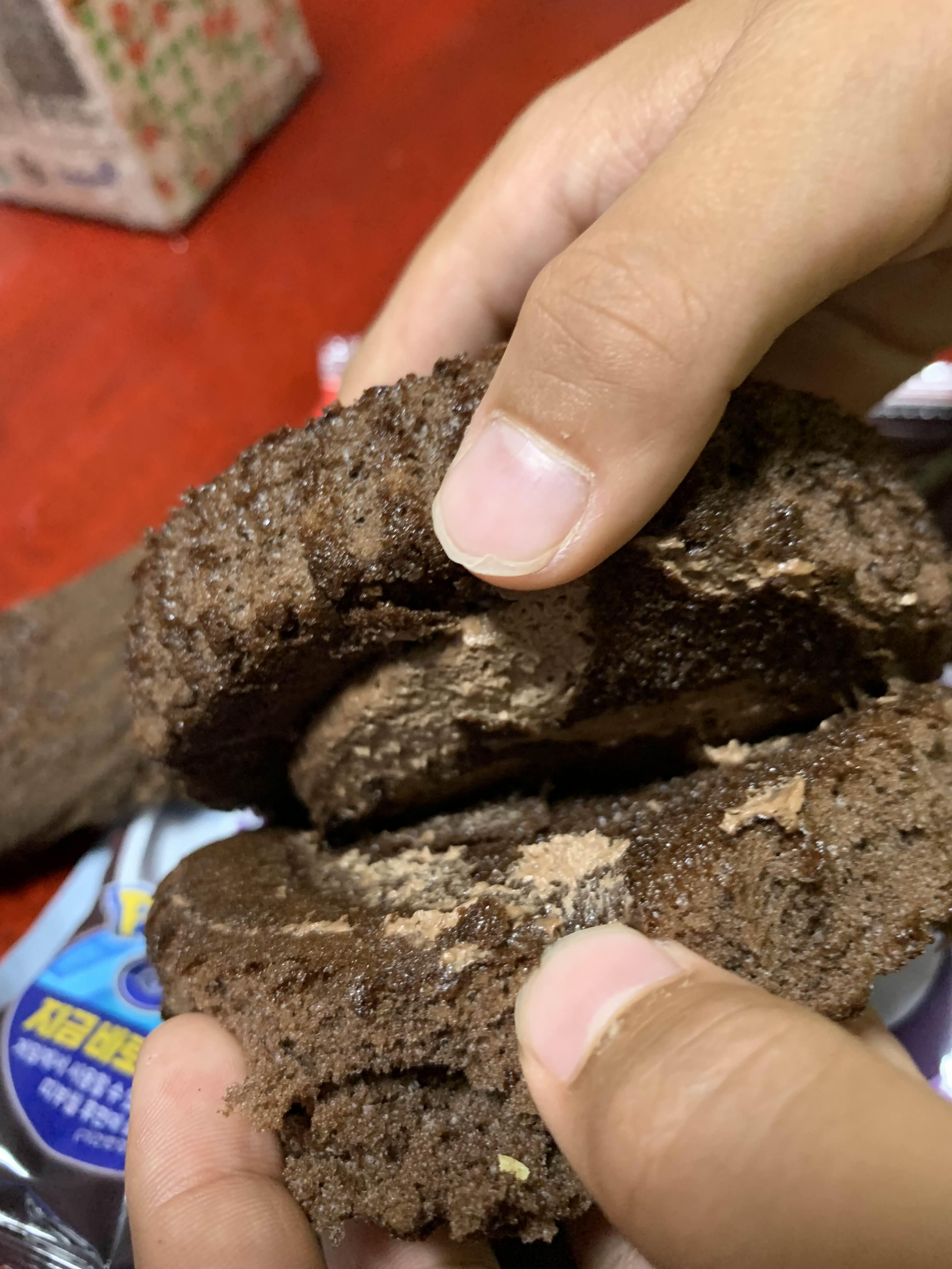 초콜릿 케이크의 종이를 모조리 제거하고 빵 중앙의 크림을 확인하며.... 입맛을 다져주고!!! 먹을 준비 완료해 줍니다. ㅎㅎ 그리고 한입에 초콜릿 케이크를 꿀꺽!!