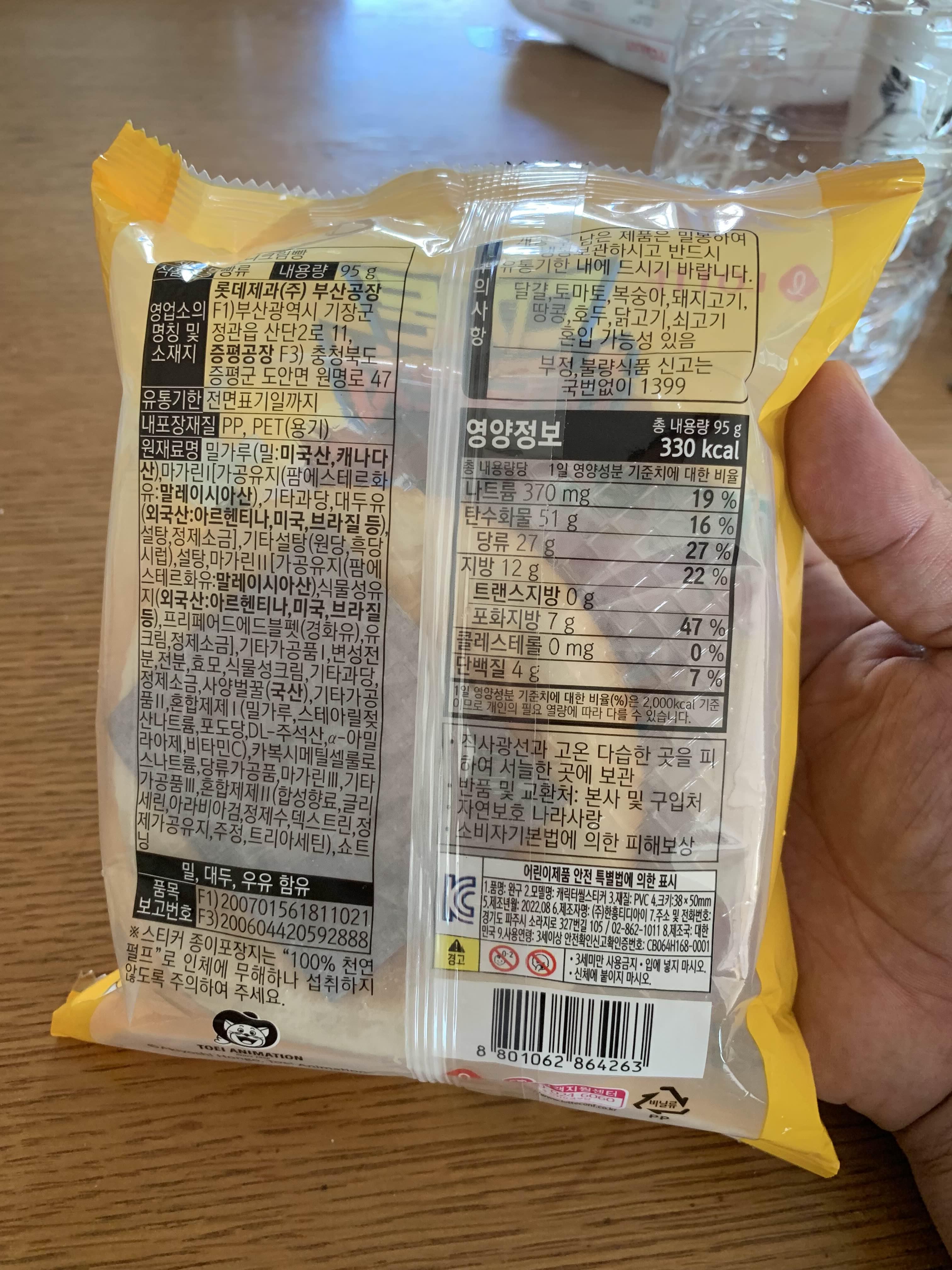 롯데 빵의 띠 부실은 띠 부실이라 부르지 않고, 스티커라고 부르더군요. 띠었다 부였다 될까라는 생각이 들더군요.ㅎㅎ 빵의 무게는 95g 열량은 330칼로리로 무게와 열량은 봉지빵의 일반적을 수준으로 보이더군요.