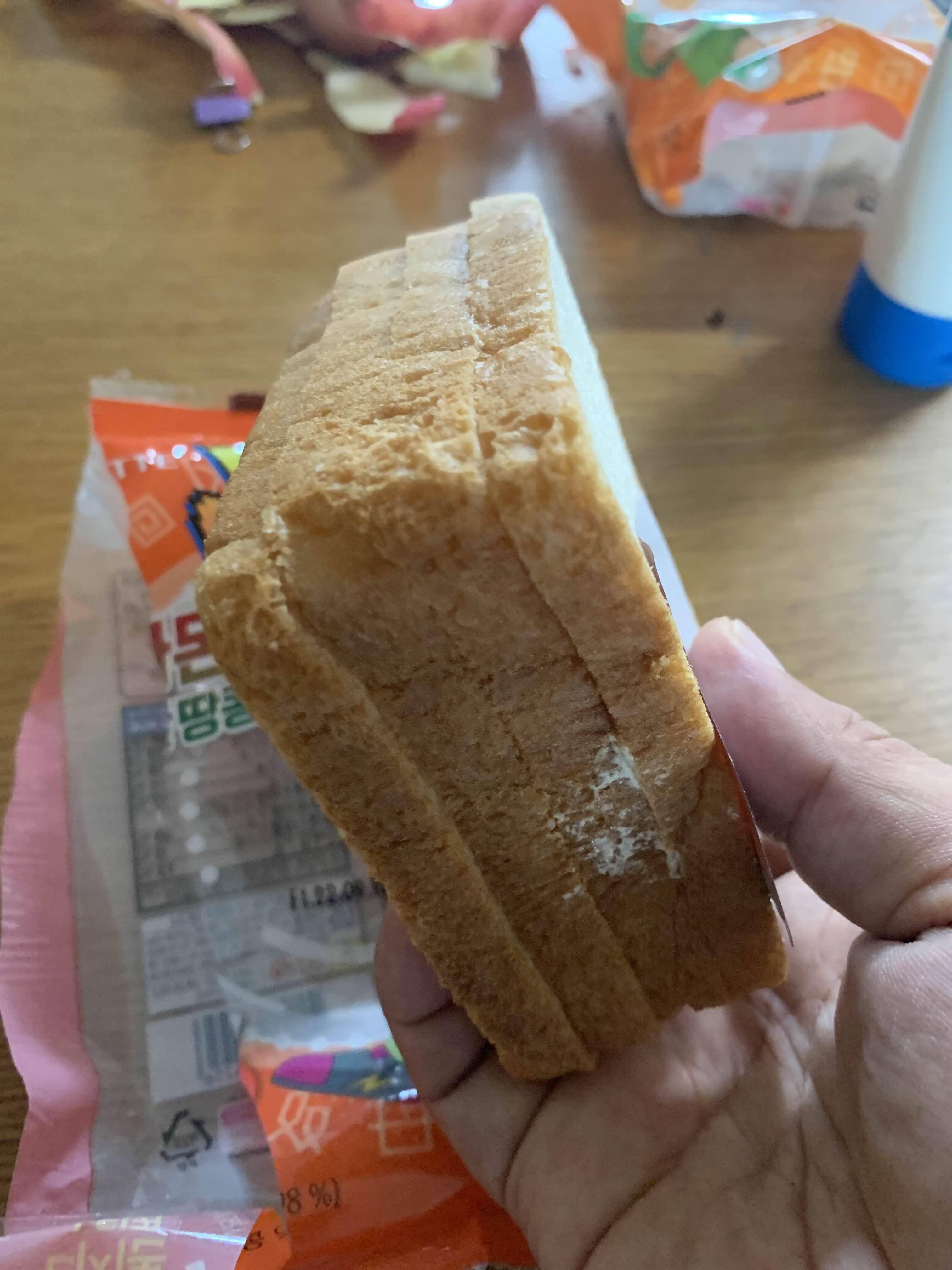 땅콩샌드가 얼마나 들어 있는 확인을 위해 빵을 반으로 갈라 보았습니다. 이건 뭐지?? 땅콩 샌드가 왜 이리 적게 들었음?ㅎㅎ 어떻게 먹으라고 빵도 푸석이는데, 앙꼬까지 적게 들어있으면;;;