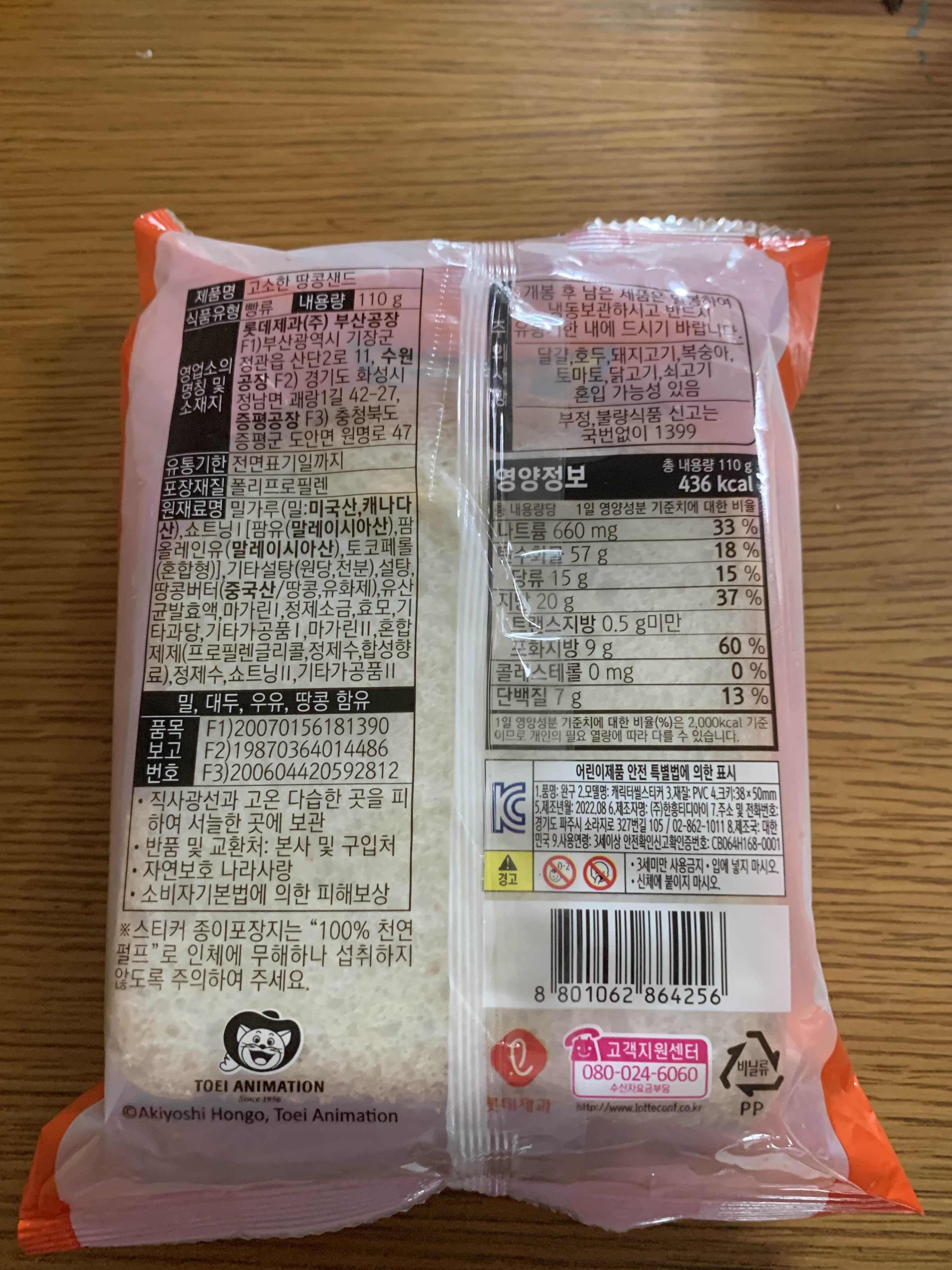 그리고 2번째 특징이 있다면.... 제품명이 다르다!! 앞의 포장지와 뒤 포장지의 제품명이 다르다는 것이다. 뒤 포장지에는 "고소한 땅콩샌드" 디지몬 이름이 없다. 포켓몬은 포켓몬 캐릭터 이름이 뒷 포장지에도 있는 것과 상반된다.(포켓 폰빵에서도 제품명이 다른 빵이 1개 있긴 있다.)