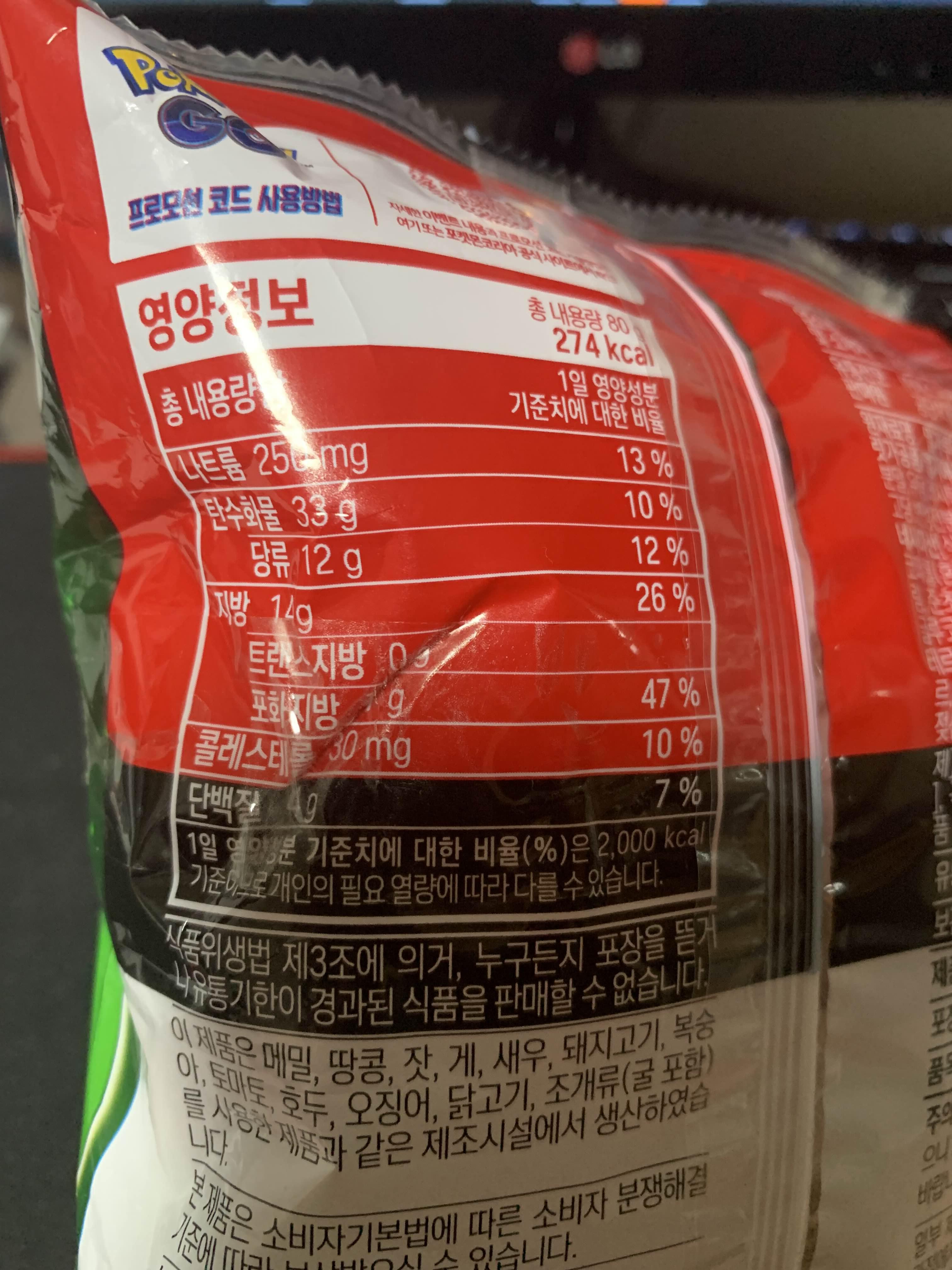 빵의 중량은 80g으로 다른 포켓몬빵에 비해 용량이 크지는 않습니다. 하지만, 빵 봉지는 다른 빵(로켓단, 파이리, 고오스)에 비해서 포장지가 크더군요. 그리고, 초코빵에 비해서 열량이 그리 높지 않은 274칼로리로 표기되어 있더군요.