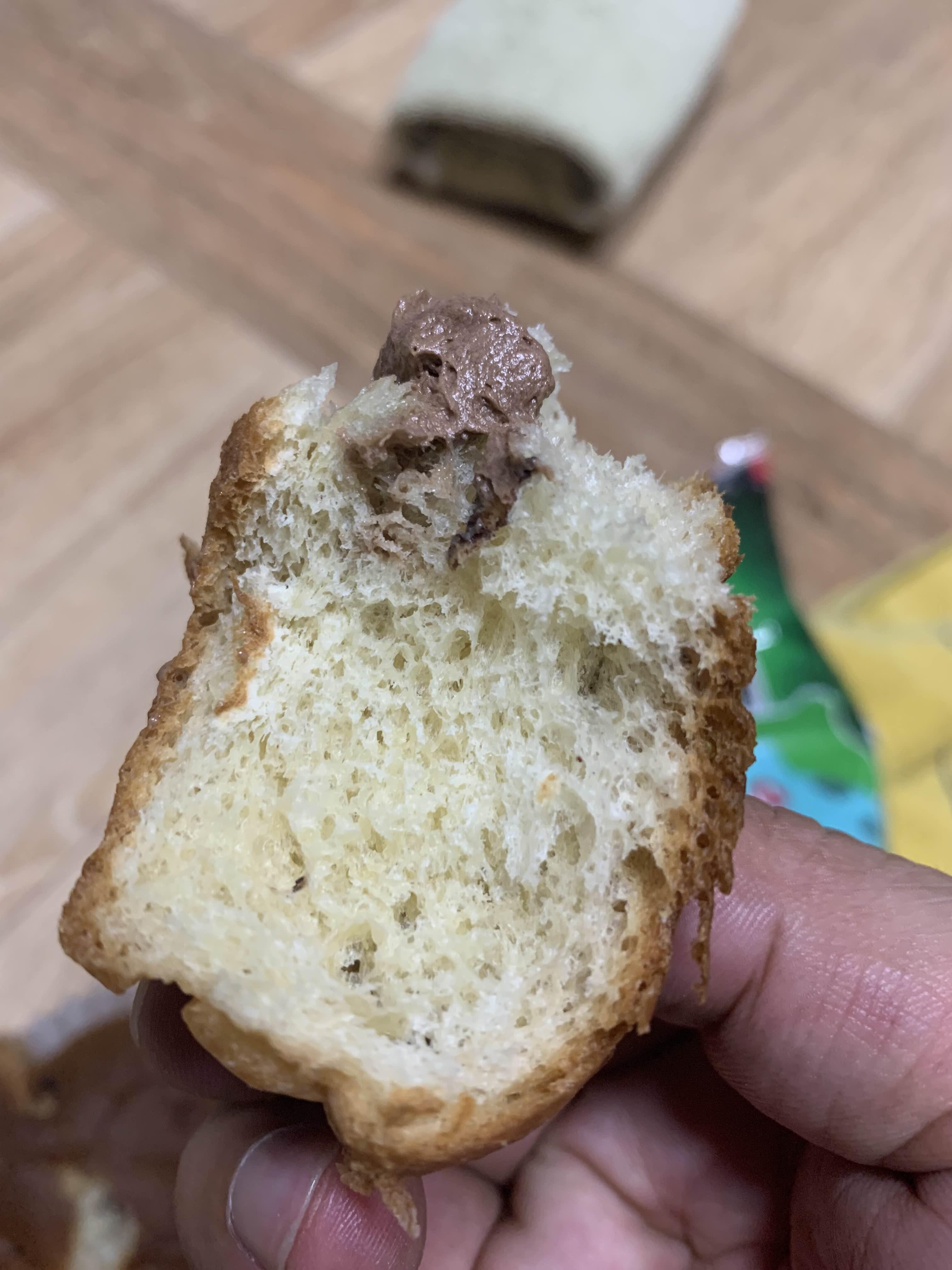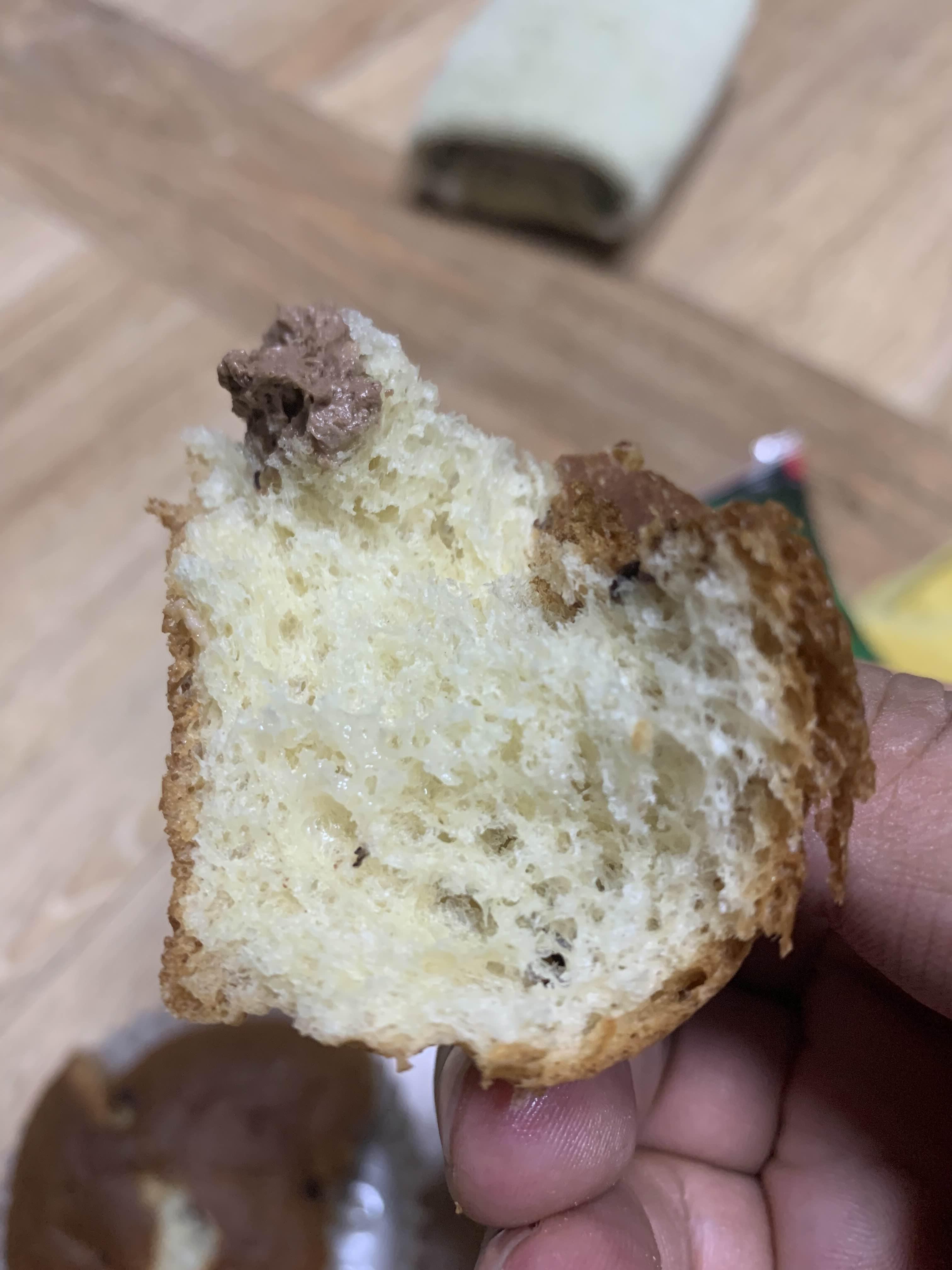 빵을 반으로 갈라서 내용물을 확인해보니, 중앙에 초코 생크림이 들어있더군요. 로켓단이나 고오스의 초콜릿과는 다른 부드러운 생크림!!! 맛도 괜찮더군요. 생크림이 없는 빵 부위에는 초콜릿이 곳곳 녹아 있어서 빵 부분도 나쁘지 않더군요.