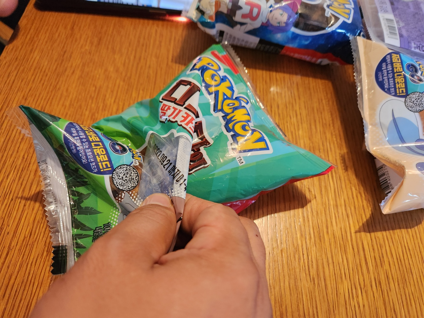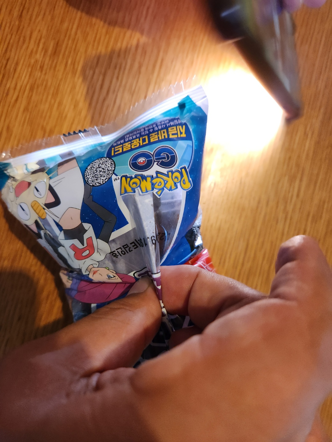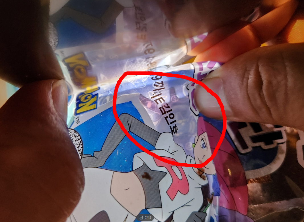포켓몬빵 중 띠 부실 확인이 좀 어려운 로켓단 초콜릿입니다. 내가 포켓몬 이미지를 잘 모르니 어렵지만.... 포켓몬 이미지를 모두 아는 아이나 어른들에게는 무지 쉬운 난이도입니다. ㅎㅎ 위 사진처럼 빵 봉지와 띠부씰을 함께 잡아주고(도감을 잘 아는 사람들은 잡을 필요 없이... 포켓몬빵을 거꾸로 들어 띠 부실과 봉지를 붙여주고, 렌턴으로 쉽게 확인하더군요.