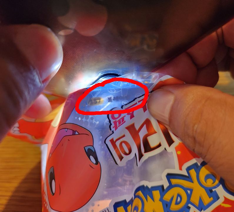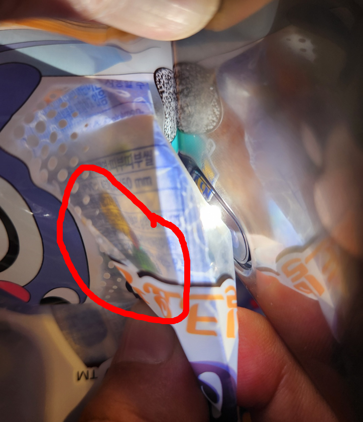 발챙이 빵도 띠부씰 확인이 쉬운 빵입니다. 포켓몬빵 봉지와 띠부씰을 함께 잡고서 핸드폰 렌턴으로 비추어 주면!!! 짜잔!!!