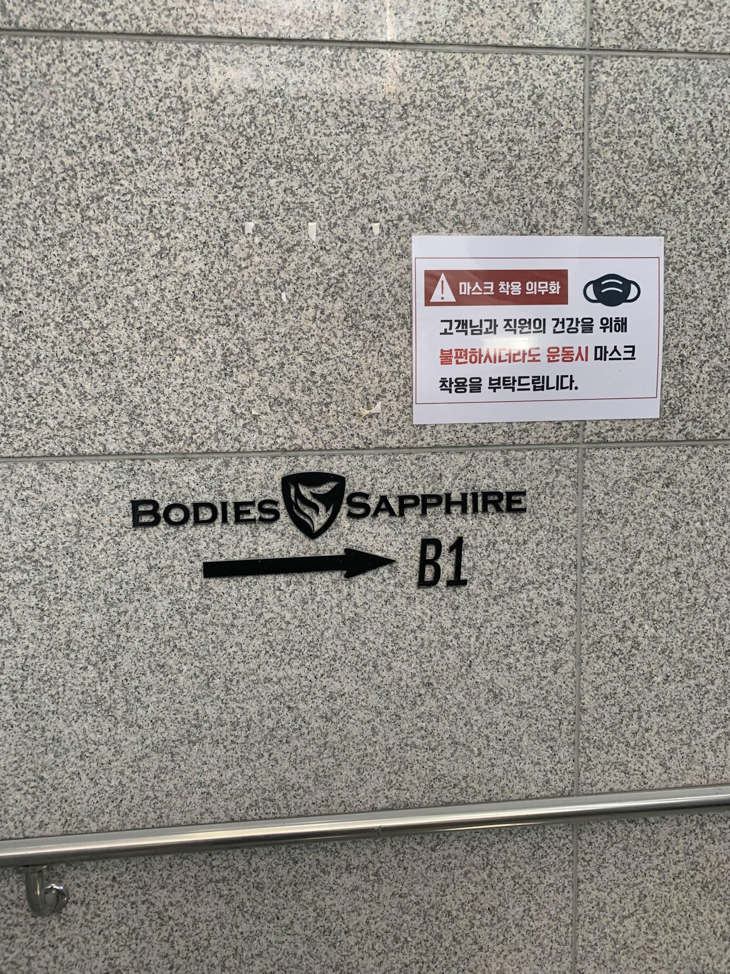 스포츠센터는 기존과 동일하게 지하 1층, 2층에 운영하고 있습니다. 예전은 지하 1층은 골프연습장과 스포츠센터로 운영하였고, 지하 2층은 수영장과 사우나로 운영하였습니다. 지하로 내려가는 계단실에는 예전 보디스 사파이어 안내문구가 보이더군요. 왠지 친숙한 "보디스 사파이어" 문구!