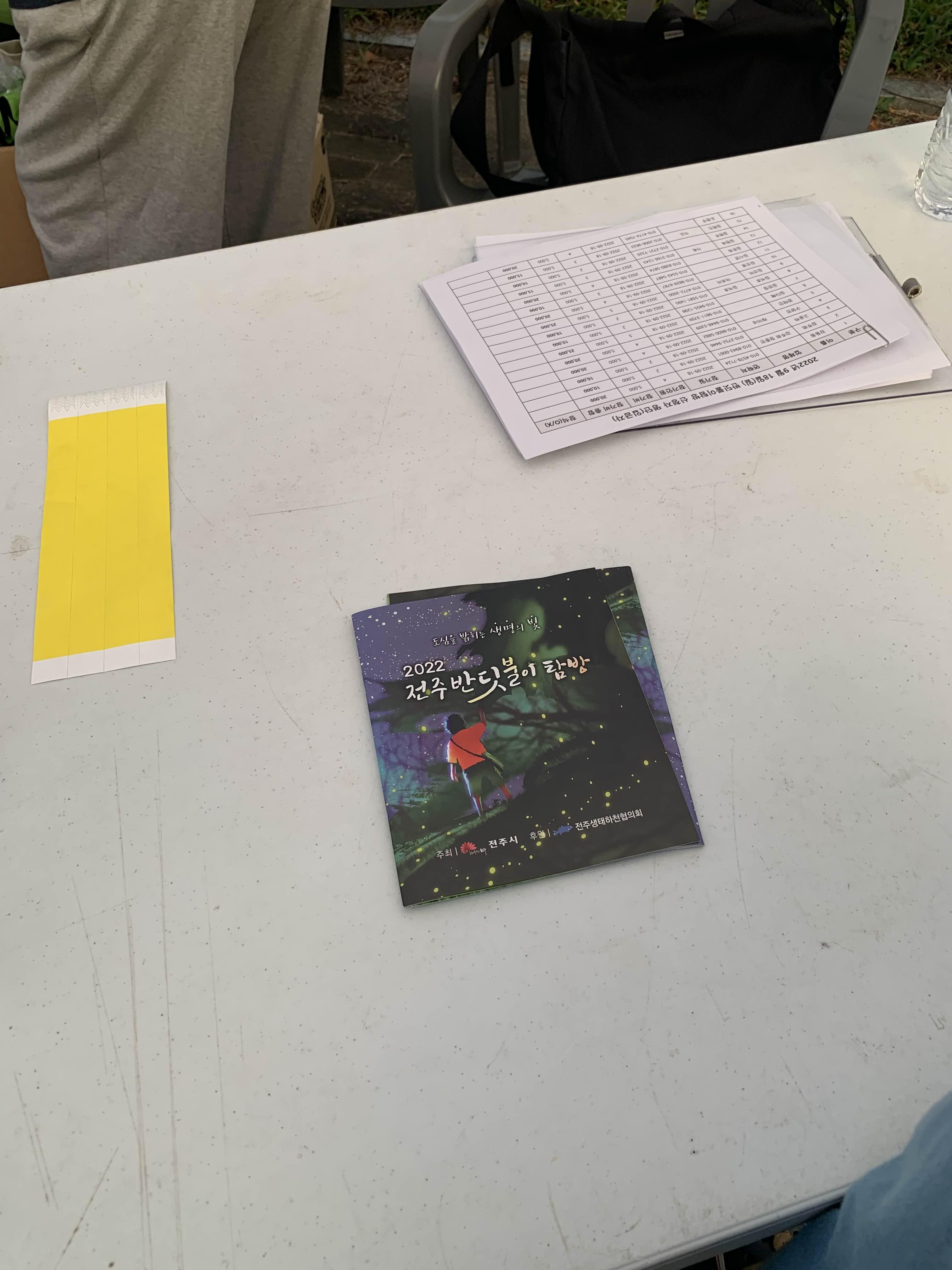 반딧불이 탐방 장소에 도착하면 입구에 있는 참가자 등록 부스에서 참가자 등록을 진행합니다. 등록하면, 손목에 종이띠와 기념품을 지급하는데... 기념품은 연필!ㅎ