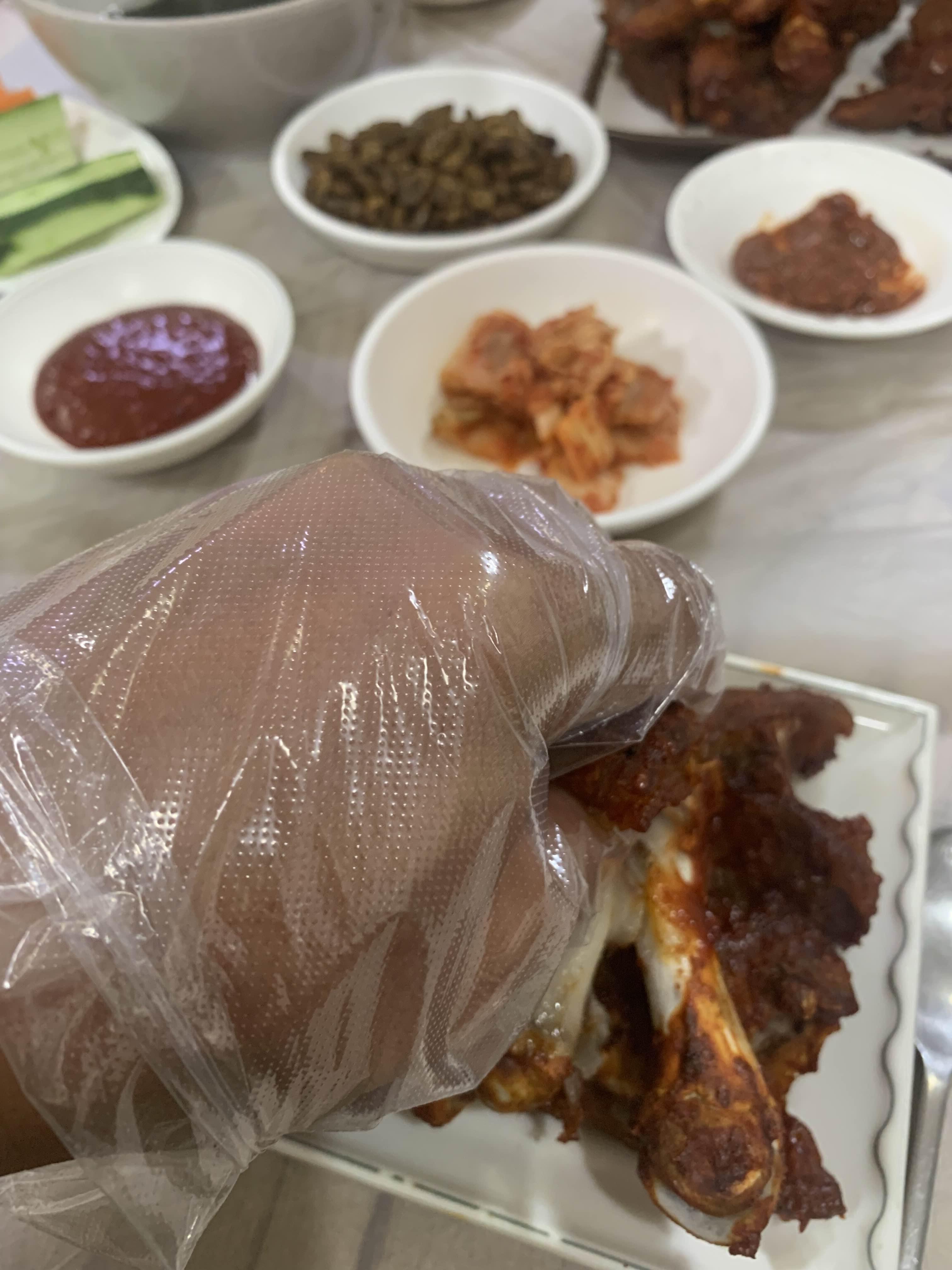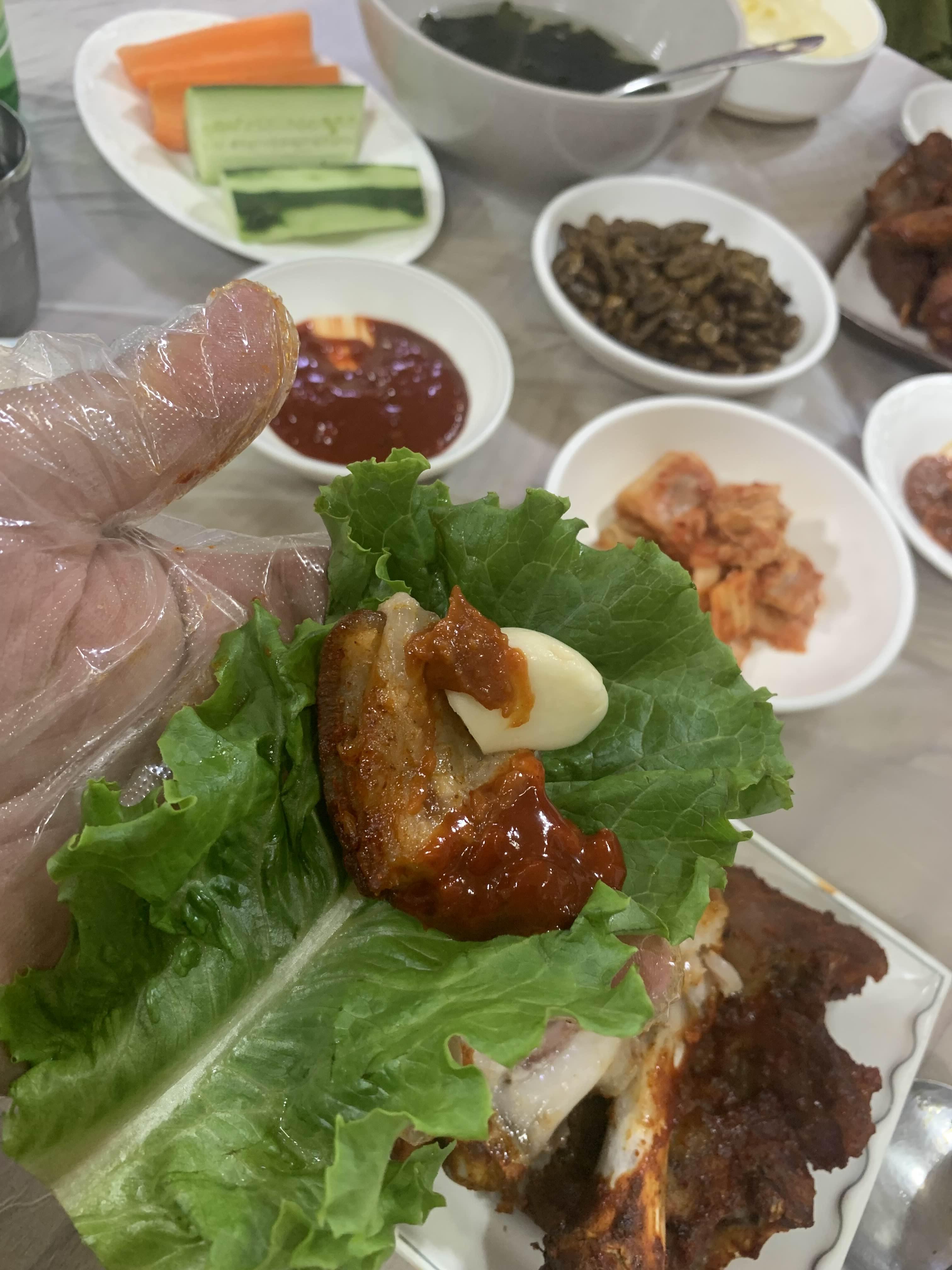 통으로 된 족발을 먹기 위한 필수품!! 바로 위생장갑!!! 위생장급을 끼고 족발의 껍데기를 띄어서 상추와 마늘을 곁들여 쌈 해서 맛보아 줍니다. 그러면 요들 요들!!! 이렇게 몇 점 먹어주고 그다음은 족을 잡고서 뜯기 실시!!