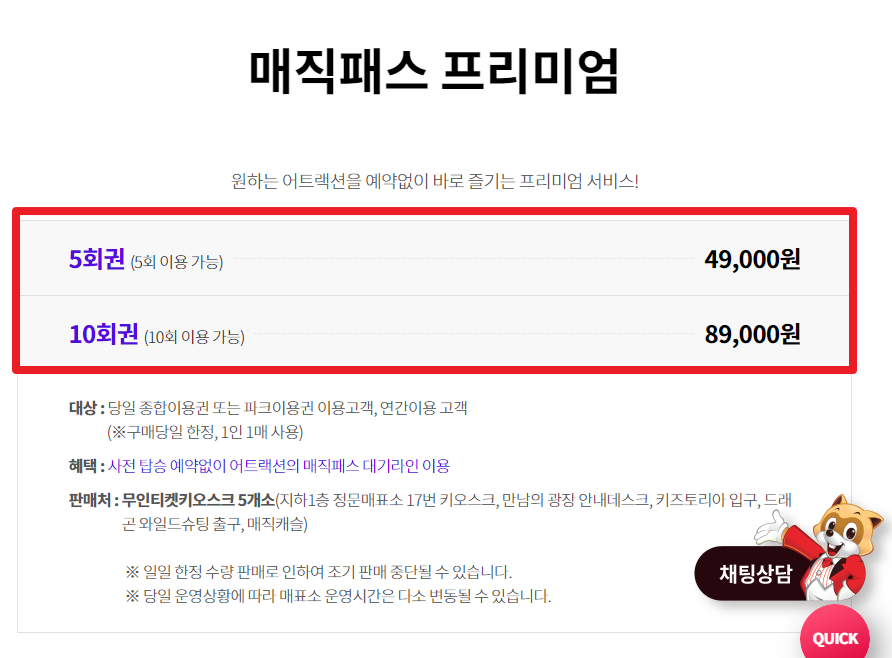 하지만, 이제는 그런 매직패스 제도는 없어졌더군요. 무조건 대기해야 하더군요. 매직패스를 이용하기 위해서는... 자유이용권 구입하고, 추가로 매직패스 이용권을 구입해야 합니다. 매직패스 5회 이용권은 49,000원, 10회 이용권은 89,000원이더군요. 자유이용권 5만 원 구입하고, 매직패스 5회권 4.9만 원 구입하면.... 놀이동산 이용권만 10만 원이 들어가는.... 그렇다고 대기하면 3~4개 탑승후 끝나는 롯데월드!!