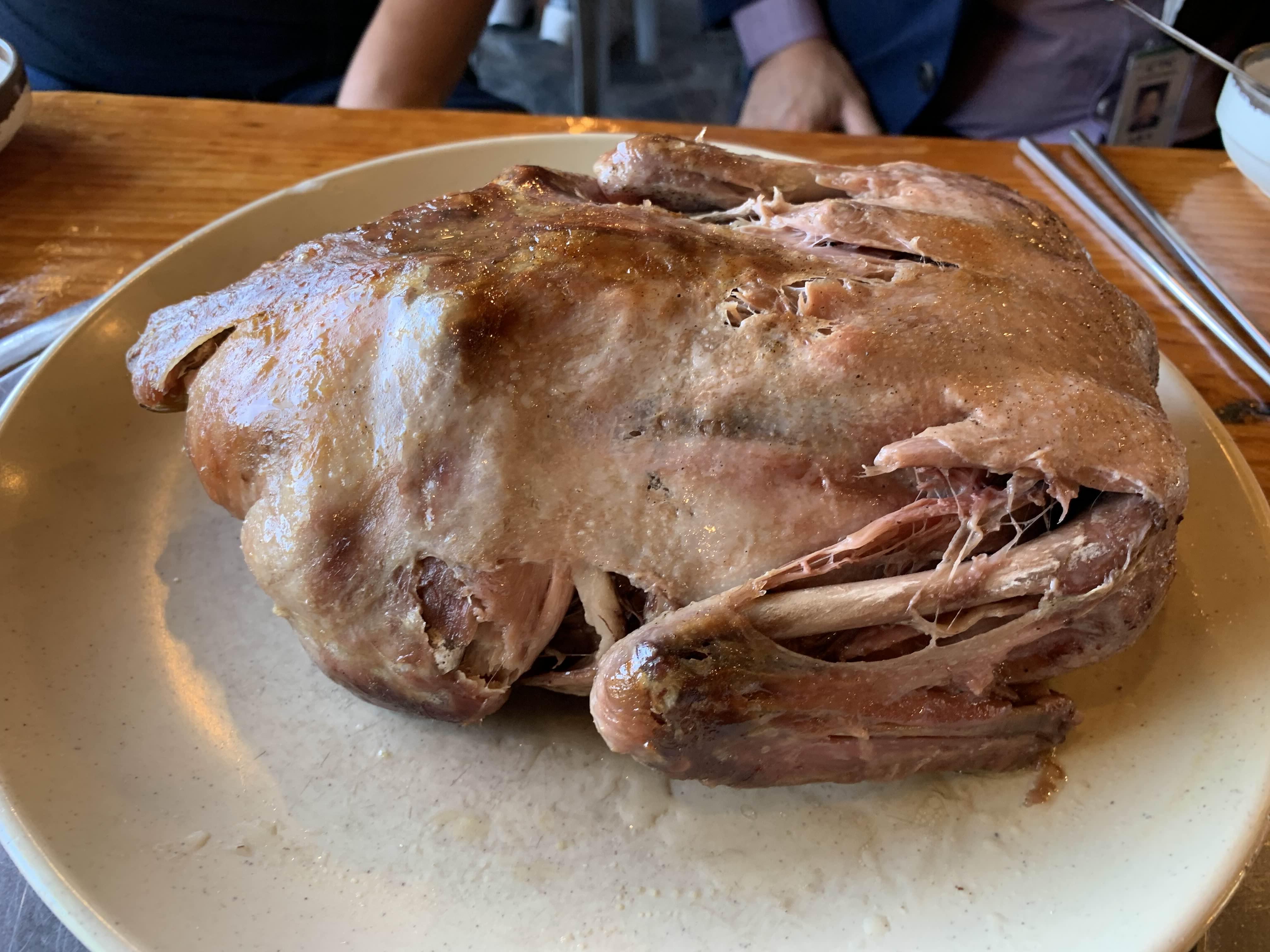 드디어 기다리고 기다리던 음식이 나왔습니다. 진흙구이라고 했는데... 진흙 냄새는 그리 나지는 않더군요.ㅎㅎ 진흙에 쌓여있으리라 생각했는데, 진흙이 보이지도 않더군요.ㅎㅎ 오리구이 통통하니 한 마리 잘 구워서 나왔더군요. 오리의 비주얼이 먼저 시선을 뺴았더군요.ㅎㅎ