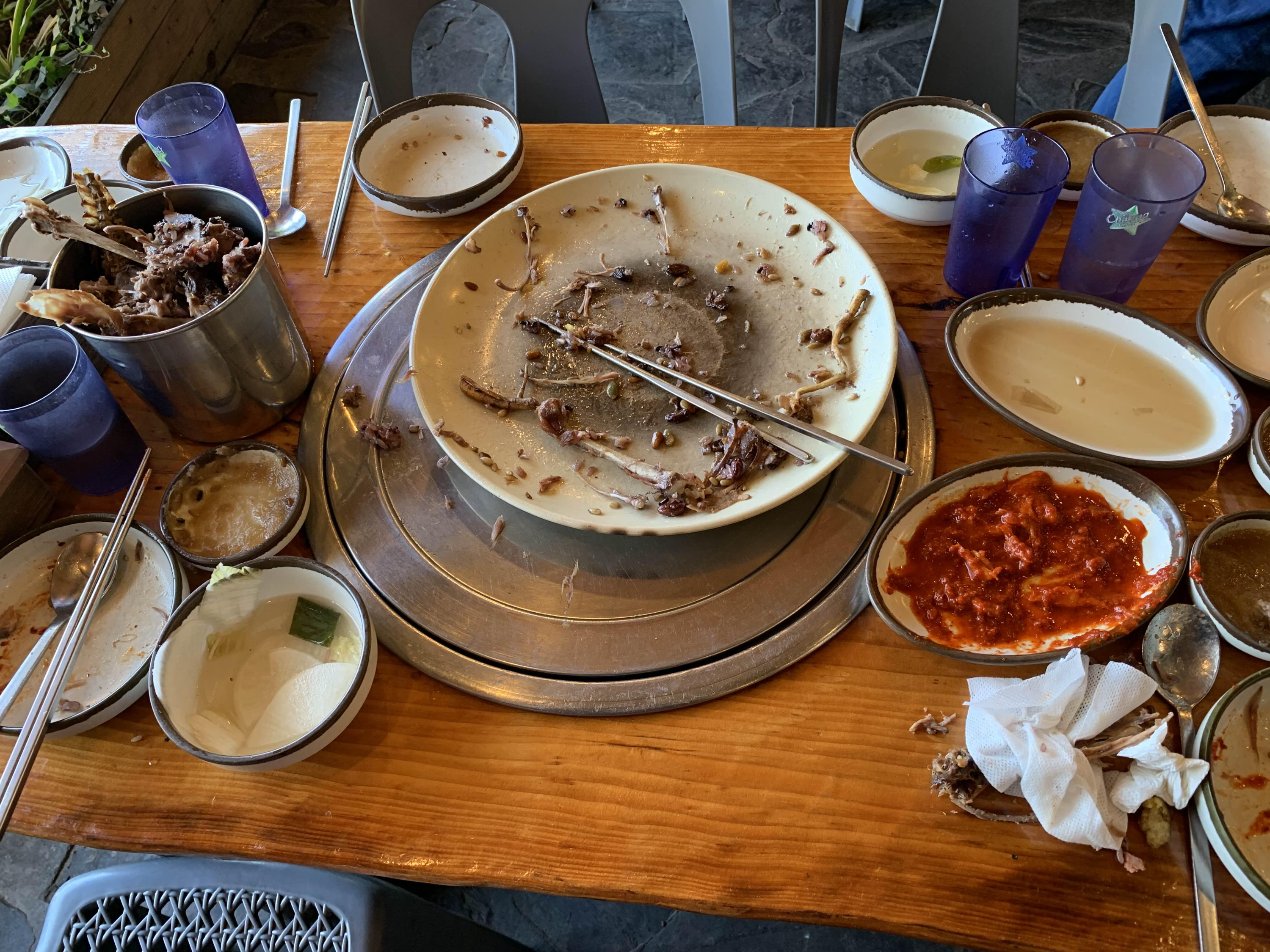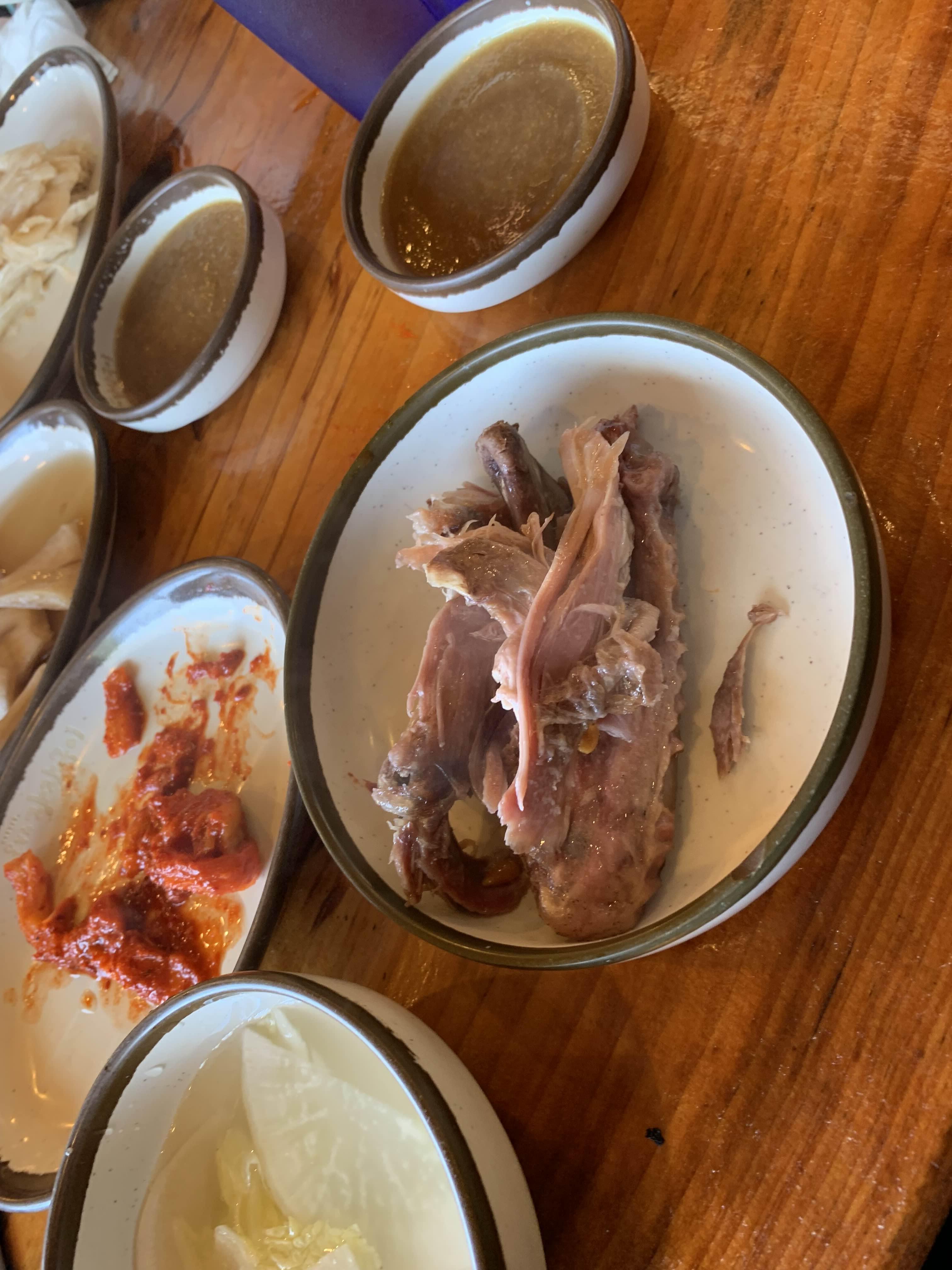 어느새 오리구이는 바닥을 드러냈습니다. 그리고 가마솥 옆 고구마!! 그 고구마를 구워 먹고 싶더군요. 다른 테이블에서는 고구마를 구워 드시더군요.ㅎㅎ 후식으로 잔치국수!!! 후식 메뉴를 주문했습니다.