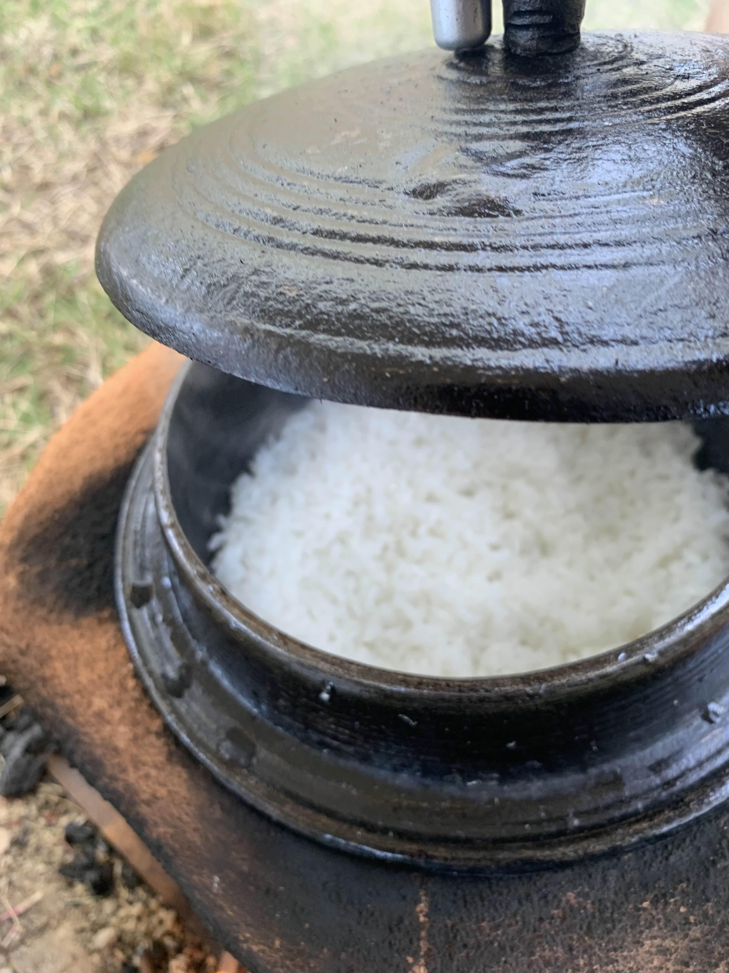 자그마한 가마솥에 물을 부어서 다시 아궁이에 올려 좋았습니다. 가마솥에서 펄펄 끊어 오르는 누룽지! 누룽지가 만들어진 사이에 가마솥으로 만들어진 쌀밥과 반찬으로 아점을 맛보았습니다. 근데, 먹는 거를 그리 좋아하지 않던 아이가 밥을 왜 이렇게 잘 먹는지.... 가마솥으로 만든 밥이 상당히 맛있었나 봅니다.
