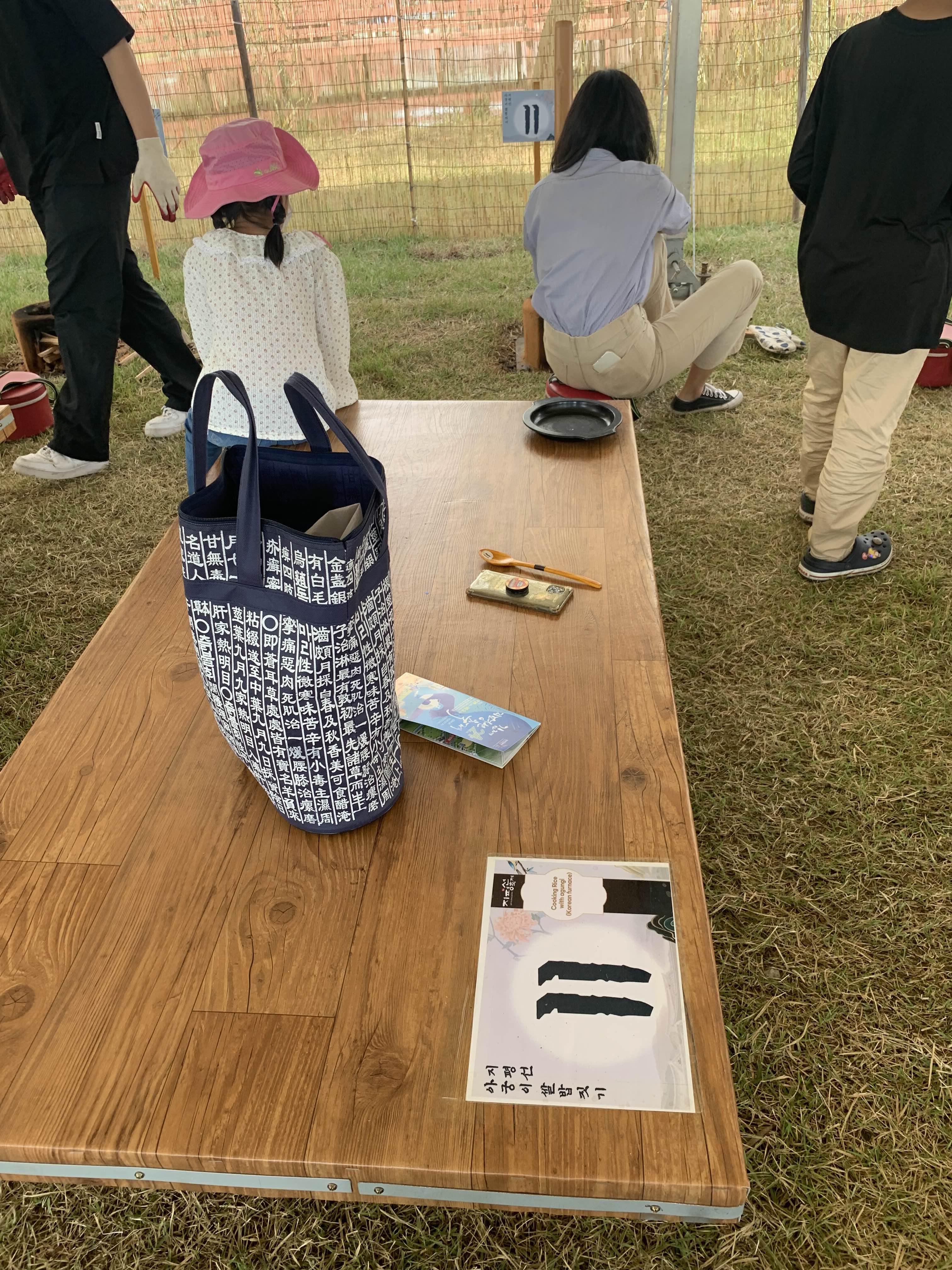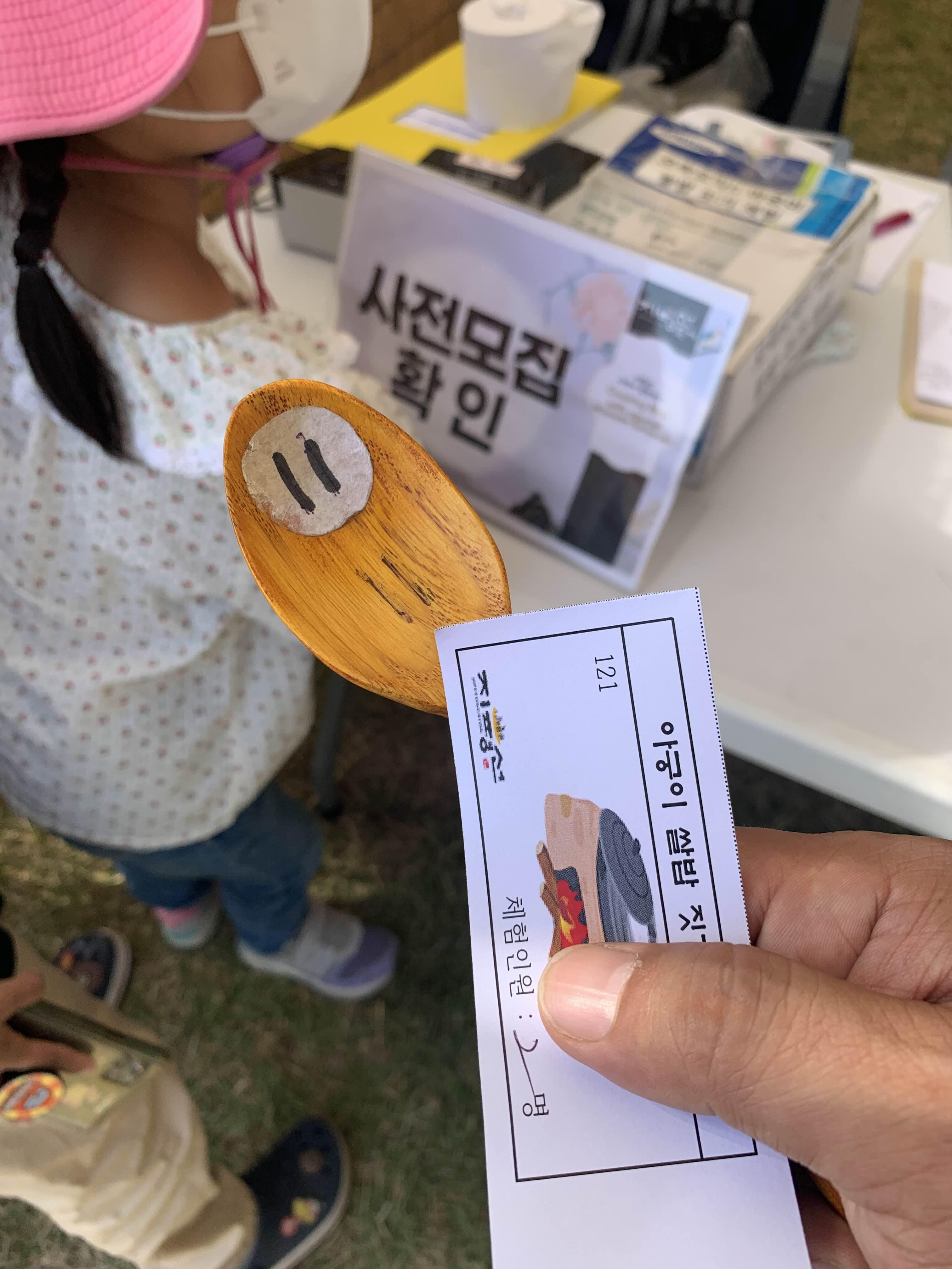 운영부스에 사전 예약한 성함을 이야기하면, 저 이상한 나무 숟가락이 지급됩니다. 나무 숟가락을 가지고.... 쌀이 담긴 그릇 아기자기한 가마솥을 들고 아궁이로 향합니다. 그러면!!! 조그마한 장작이 준비된 아궁이에서 불을 지피면~~