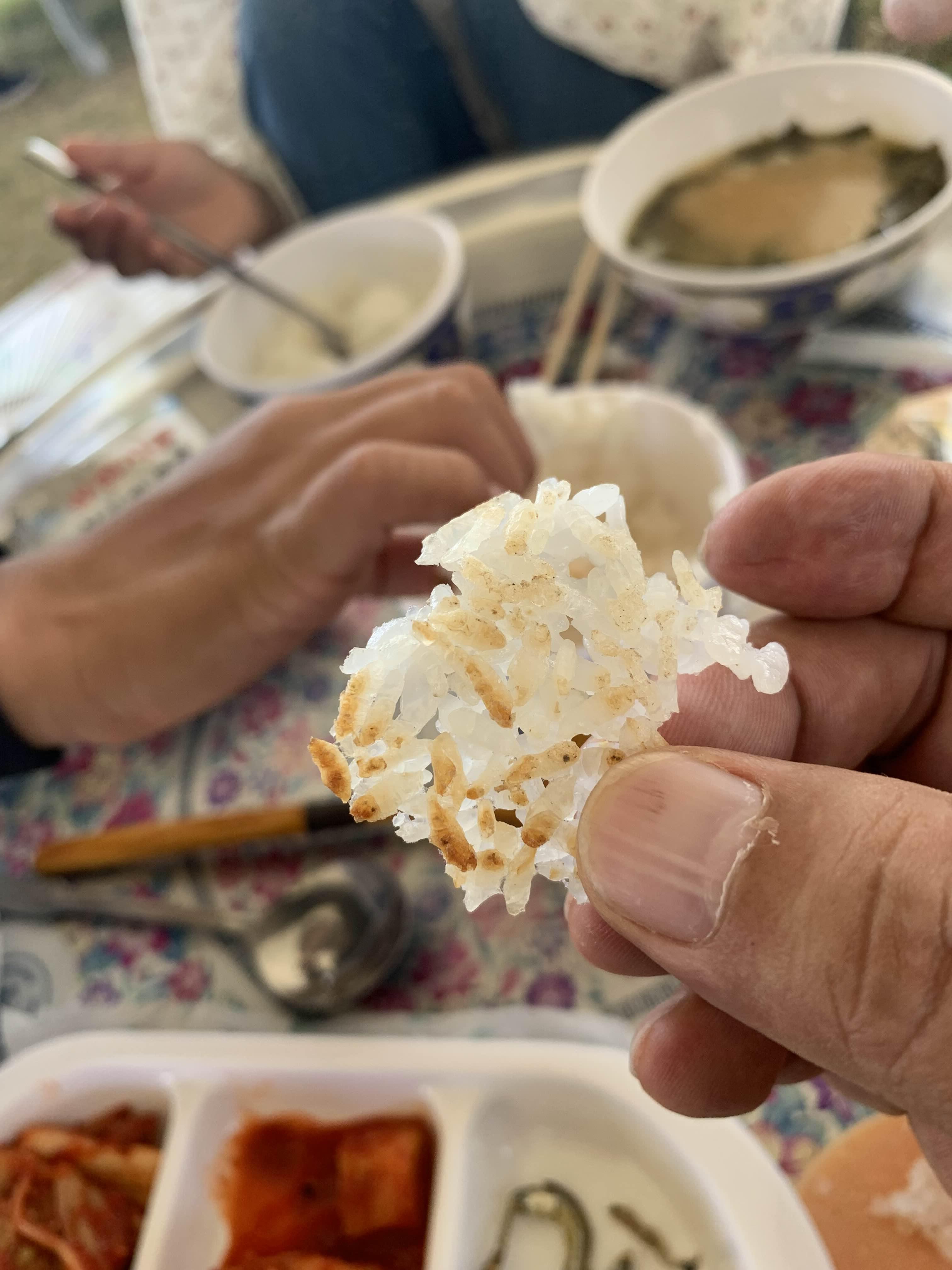 아궁이의 밥이 다 되었습니다. 밥이 준비되었으니.... 밥을 밥그릇에 담고서... 바닥에 누른 누룽지에 물을 부어서, 아궁이에 다시 올려주었습니다. 그리고... 반찬을 받았습니다. 반찬으로는 멸치, 김, 김치 그리고 된장국!!