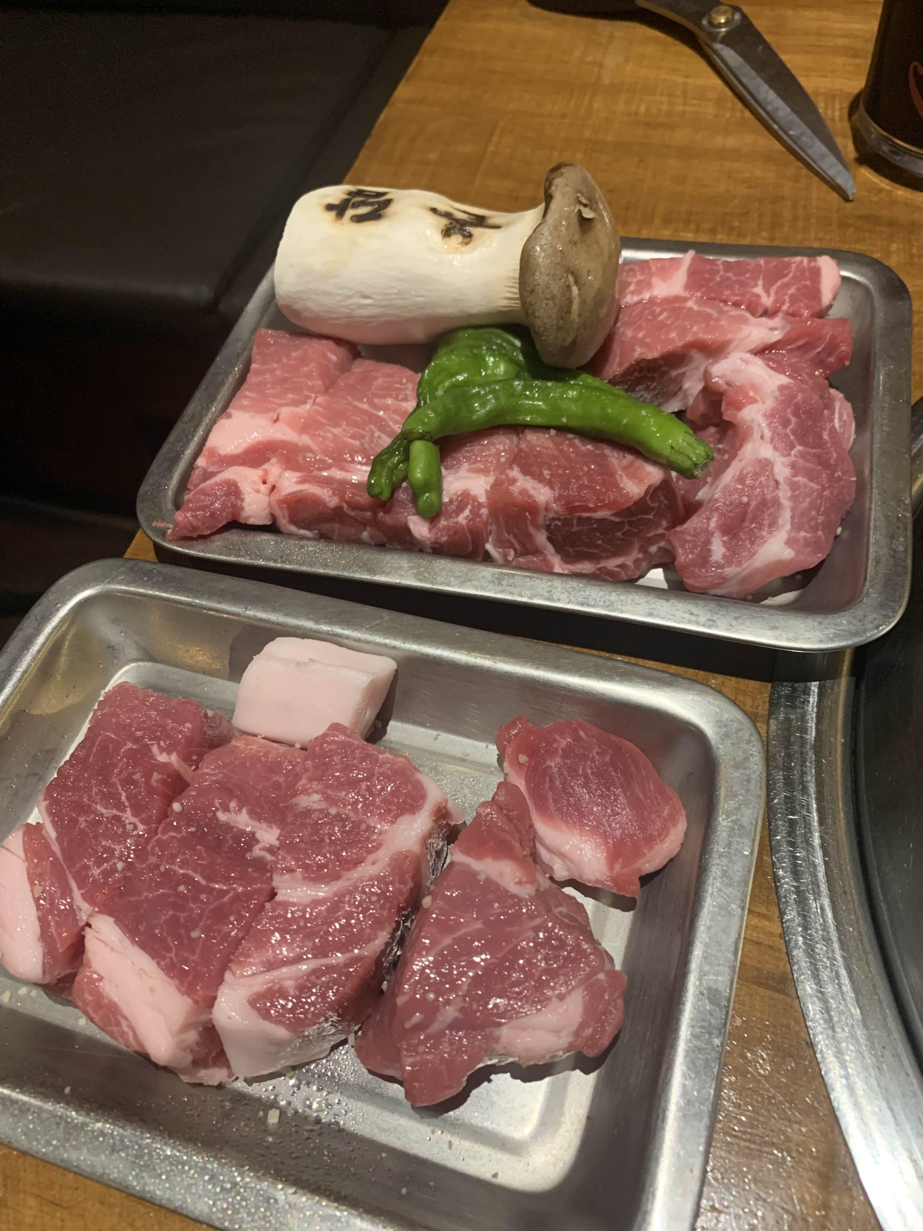 그리고 잠시 후 주문한 직각 목살이 나왔습니다. 시선을 사로잡은 건 목살이라기보다, 온담이라고 새겨진 새송이버섯!!ㅎㅎ 목살은 소금으로 약간 밑간이 되어 있고 고기를 직접 구워 주시더군요. 식당 내부에는 대략 9개의 테이블이 있는데.... 대기시간이 많은 이유는 테이블이 적고, 테이블 회전이 적은 불판에 굽는 고기다 보니... 많은 대기시간이 소요되는 거 같습니다.