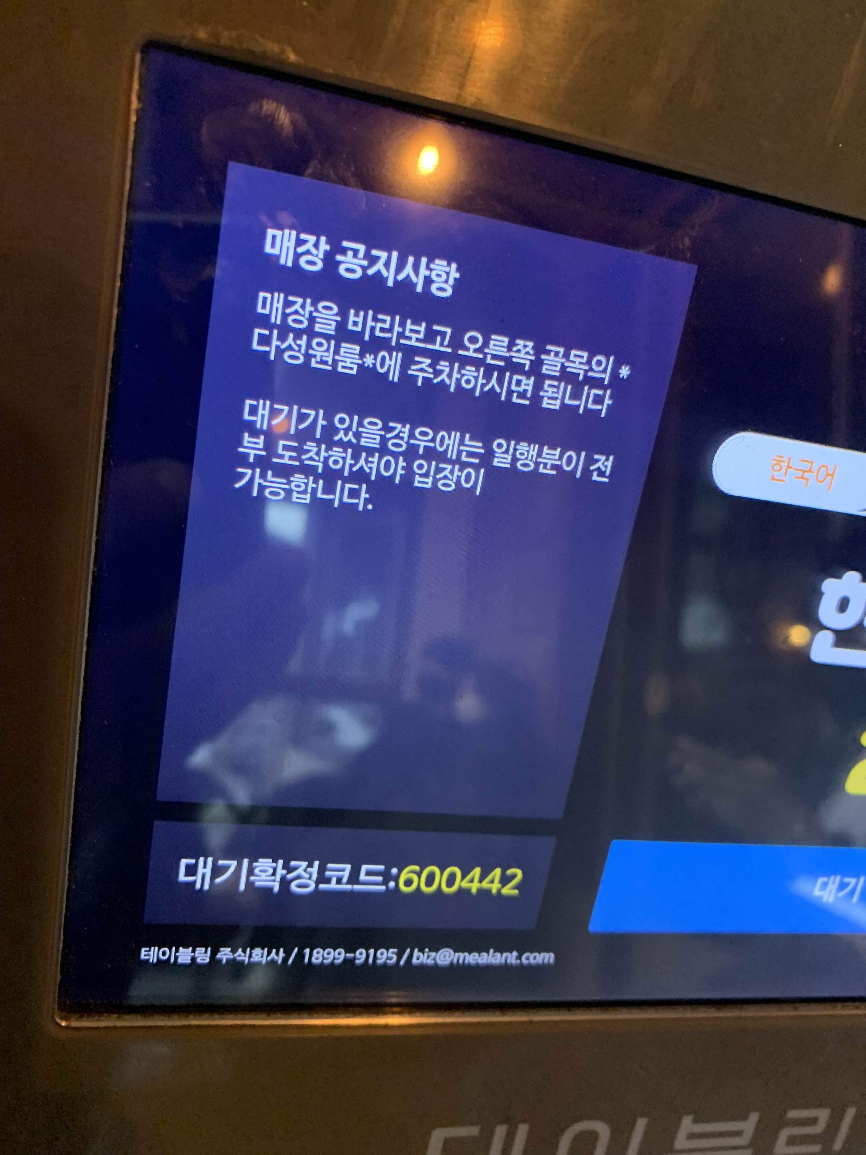 식당에 방문하여 입장하려고 하니... 5시가 조금 넘은 시간인데, 손님으로 자리가 없더군요. 더욱이.... 매장 입구에 있는 예약 포스기에는 대기번호가 13번째인가? 저녁식사를 5시에 방문했는데... 이 시간에 고기를 먹으로 온 사람들이 이렇게나 많다니... 정말 믿기지 않더군요.ㅎㅎ
