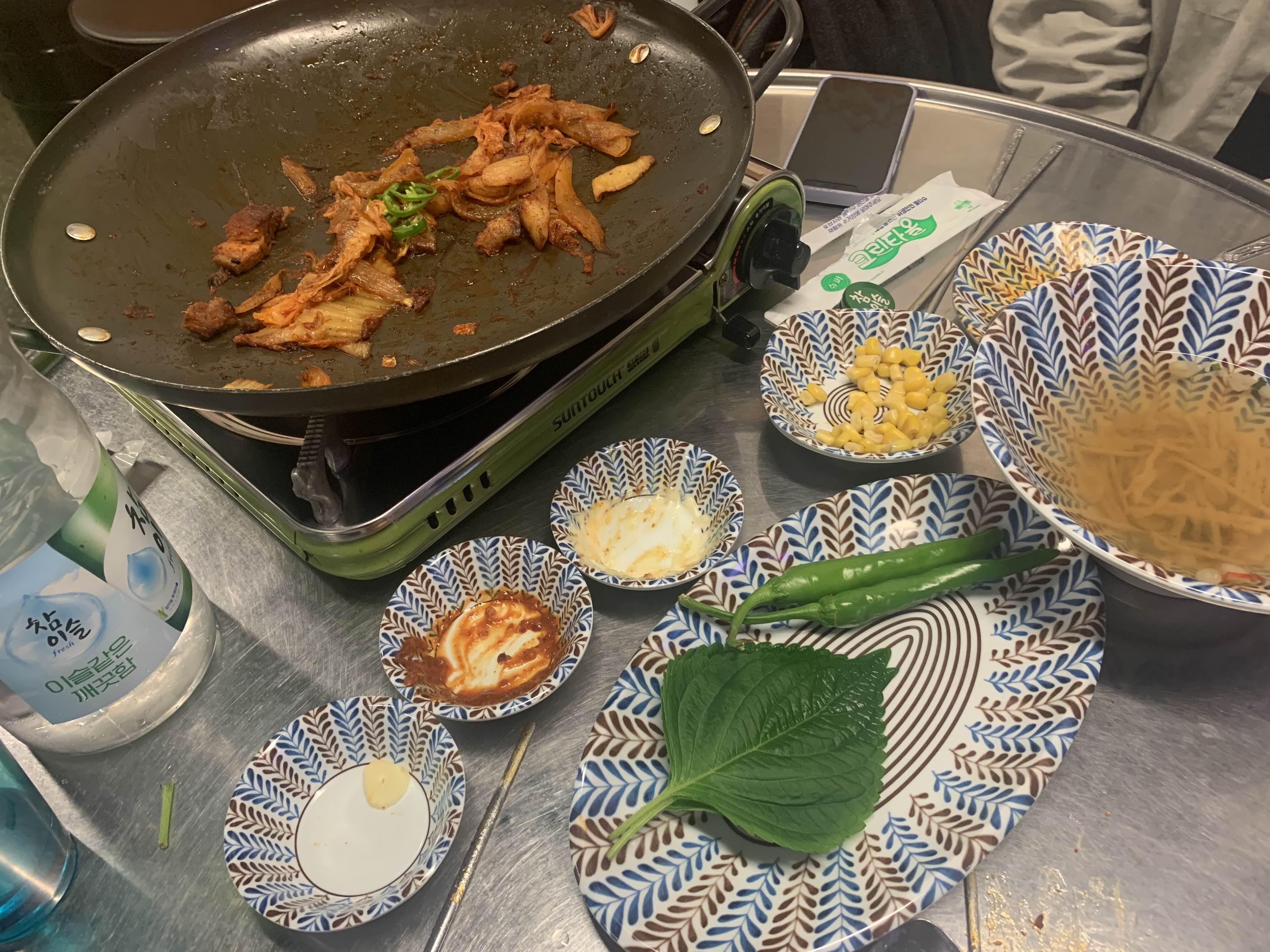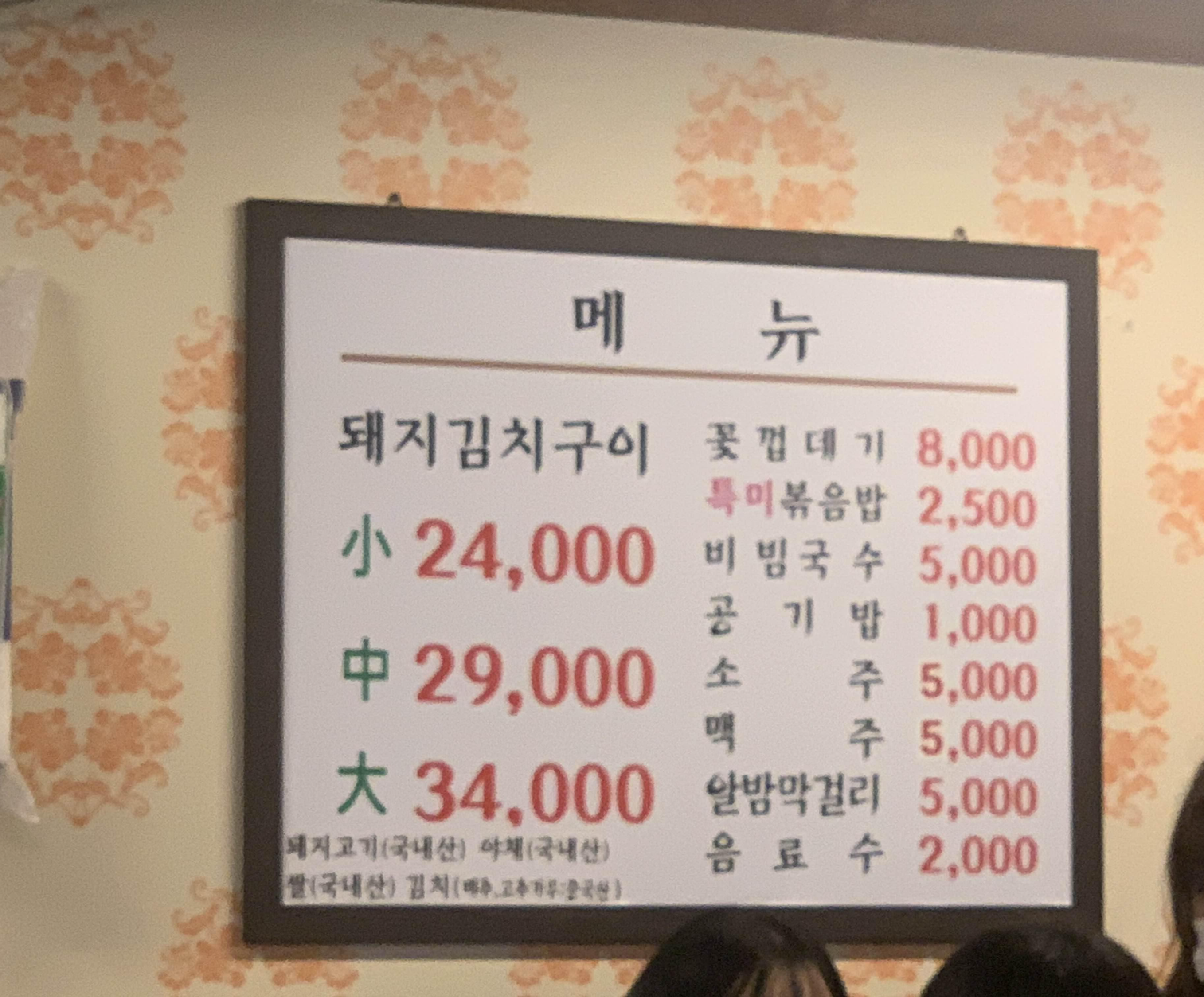 식당에 들어가 메뉴판을 보고, 다른 테이블 음식을 스캔해야 하는데.... 다른 테이블 음식 스캔이 필요하지 않은 식당이더군요. 오직 단일 메뉴의 식당 돼지김치 구이 메뉴만 있더군요. 2명이 방문하여... "소" 사이즈가 아닌 "중"사이즈로 주문했습니다. ㅎㅎ