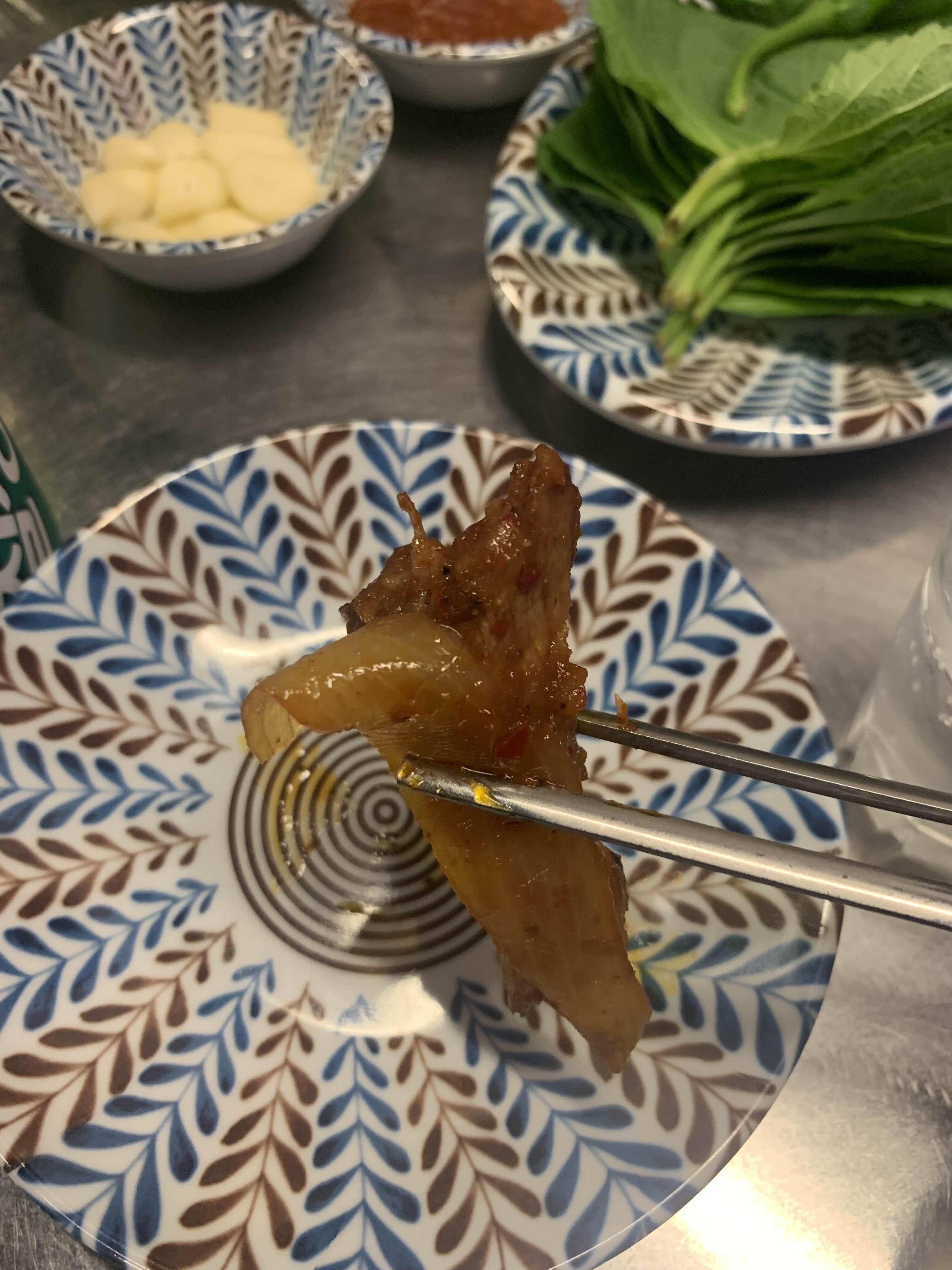 메인 요리가 나왔으니... 아무런 곁들여 먹은 재료 없이! 메인 고기와 김치만 한입 먹어보았습니다. 다른 곁들여 먹는 거 필요 없이 맛이 괜찮더군요. 술은 소주 또는 막걸리가 적당할 것 같더군요. 근데!!! 내가 술을 못해서..... 나는 물만;;ㅠㅠㅠ