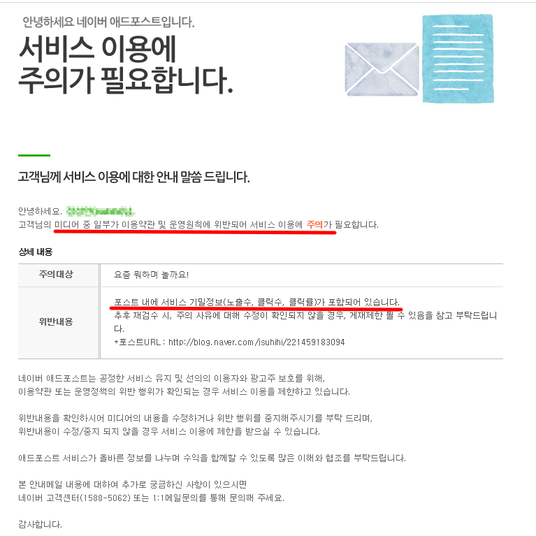얼마 전에 "네이버 애드포스트" 서비스 이용에 주의 메일을 받았습니다. 네이버 애드포스트 기밀정보에 대한 사전 검토가 필요해 보입니다.