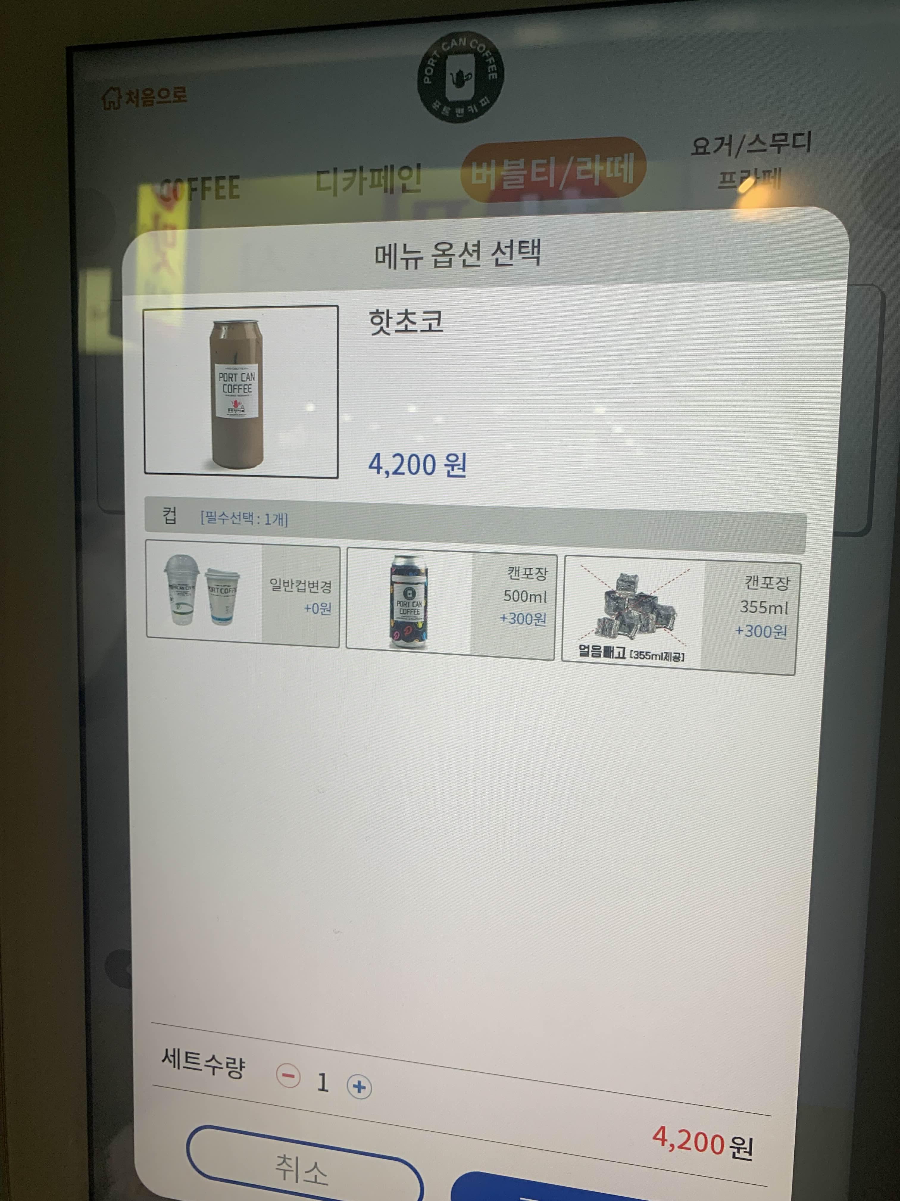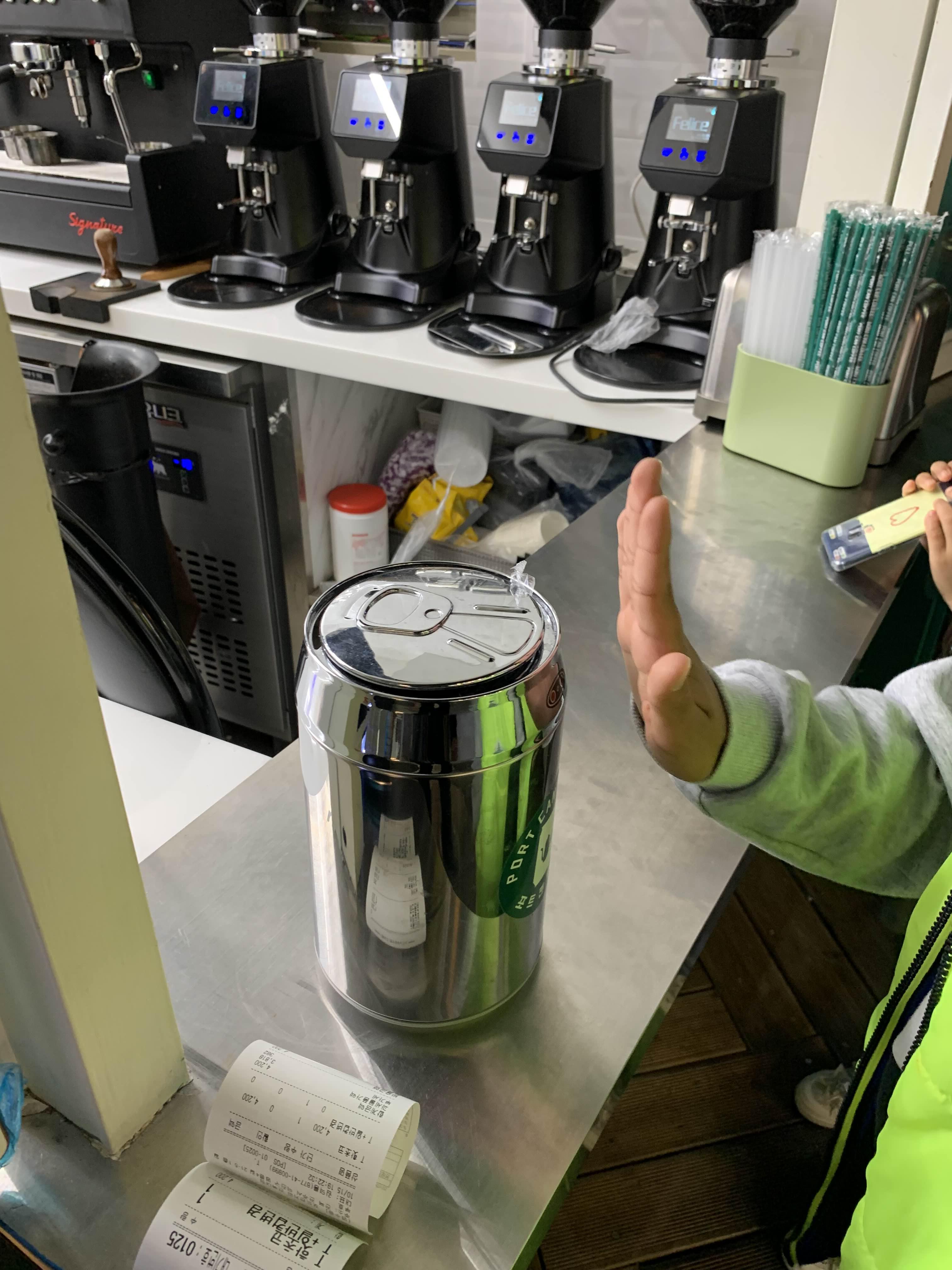 주문은 핫초코!!! 가격은 4,200원으로... 가격이 좀 비싸다는 느낌이... 들기도 하지만, 최근 물가상승을 고려하면.... 그래도 좀 비싸긴 함! 최근 저렴하면서 맛 괜찮은 카페들이 많이 생겨서.. 그런 영향이 있는 거 같기도 함!! 암튼 핫초코를 주문했는데... 여기는 커피를 캔에 담아주는데, 아이들이 먹어야 하기에 캔은 불편할 것 같아서 일반 종이컵으로 주문했습니다.