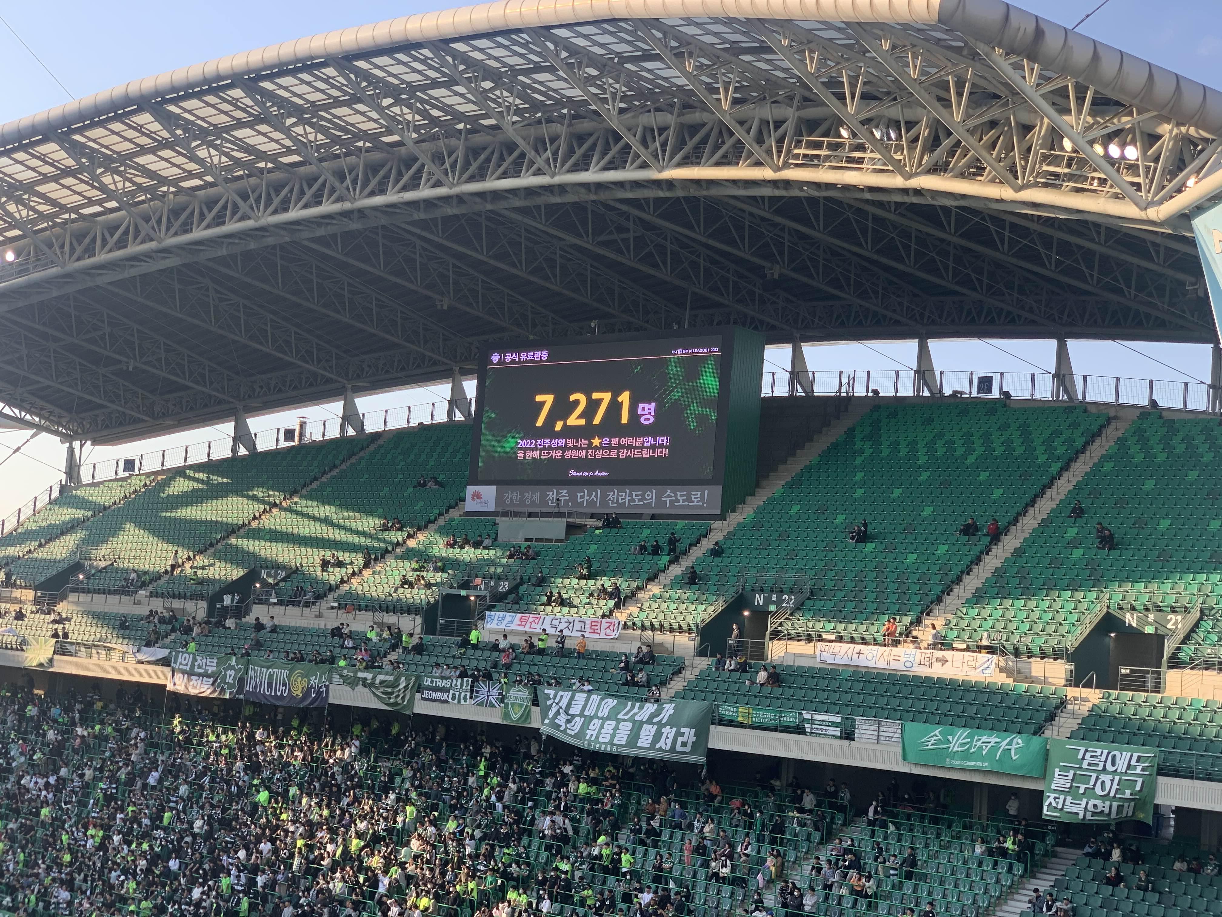`22년도 마지막 홈경기 관람수는 7,271명! 코로나로 인하여 홈경기 관람객이 많이 줄었는데.... 더욱이, 이미 김 빠진 경기라서 많은 관중이 찾지 않으리라 생각했는데... 의외로 많은 관람객이 경기 관람을 했더군요.ㅎㅎ 이번에 우승한 울산 현대는 2만 명이 넘는 관중이 몰렸다는~ㅎㅎ