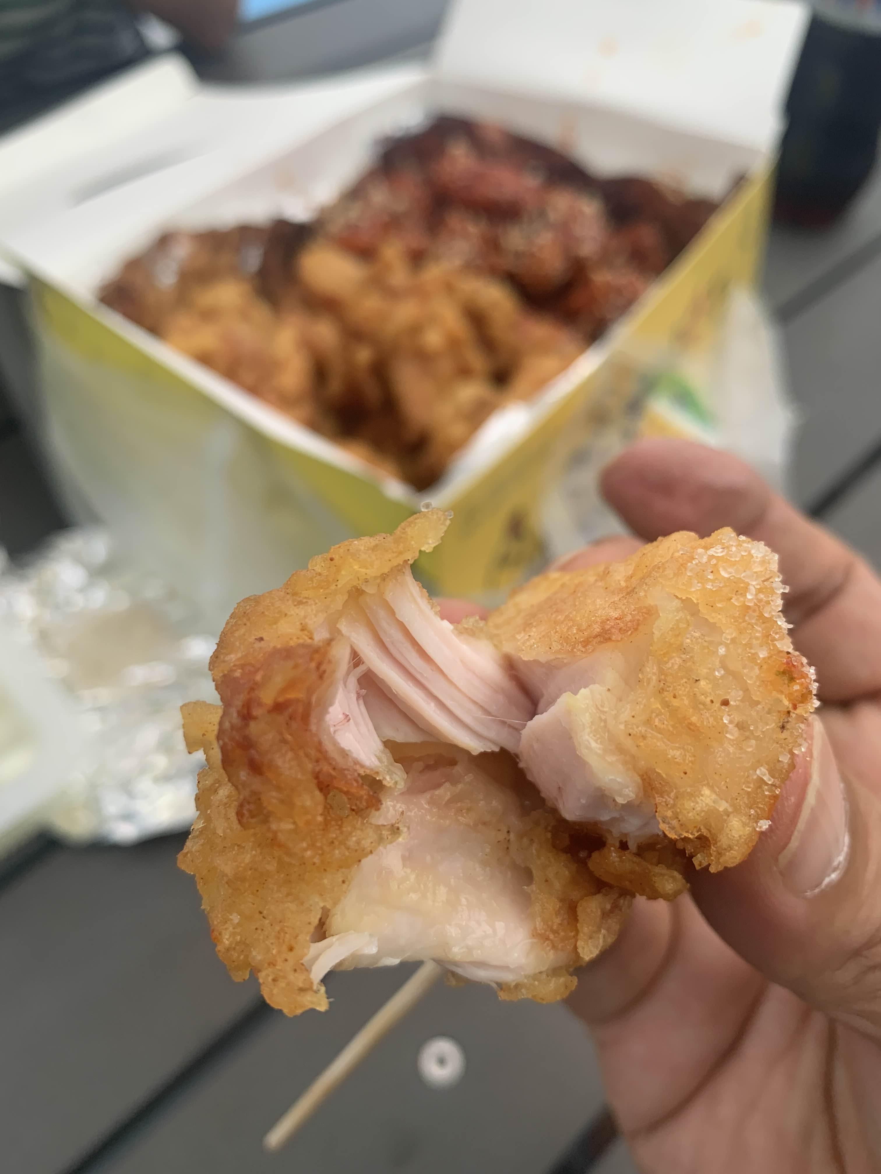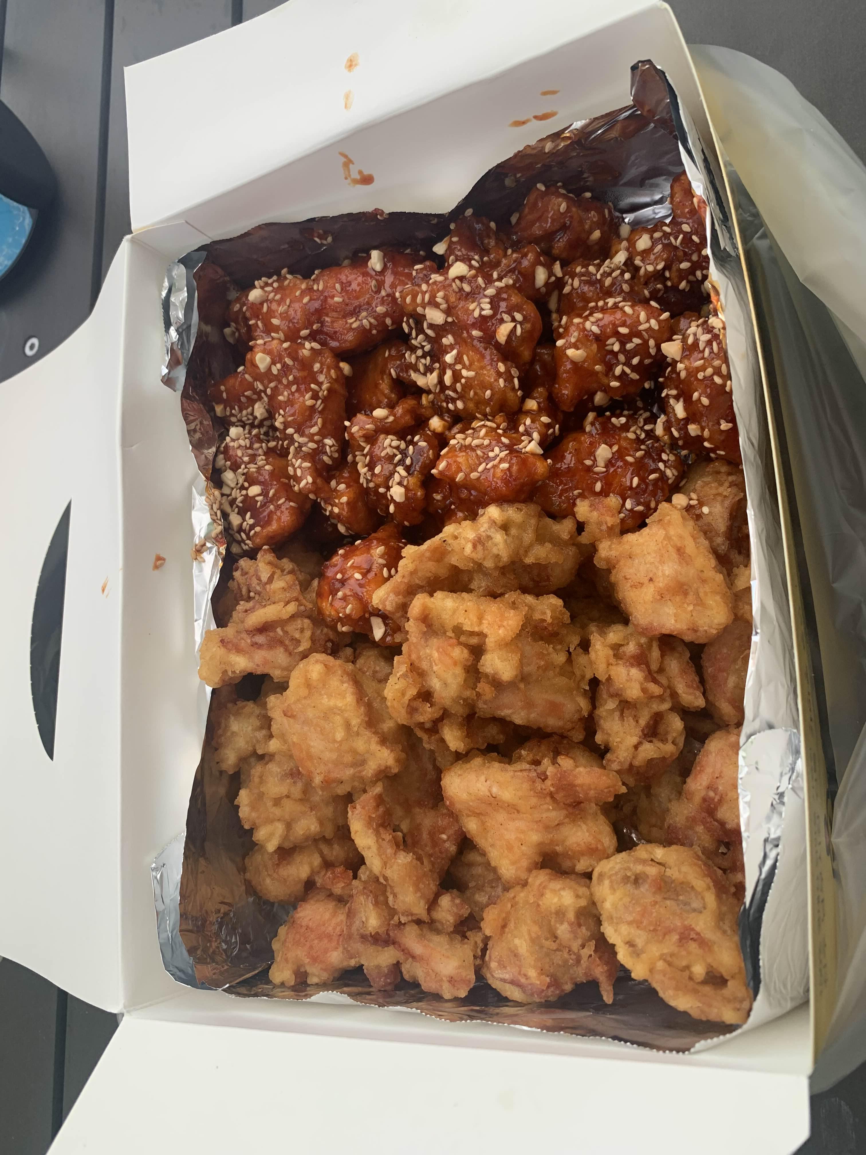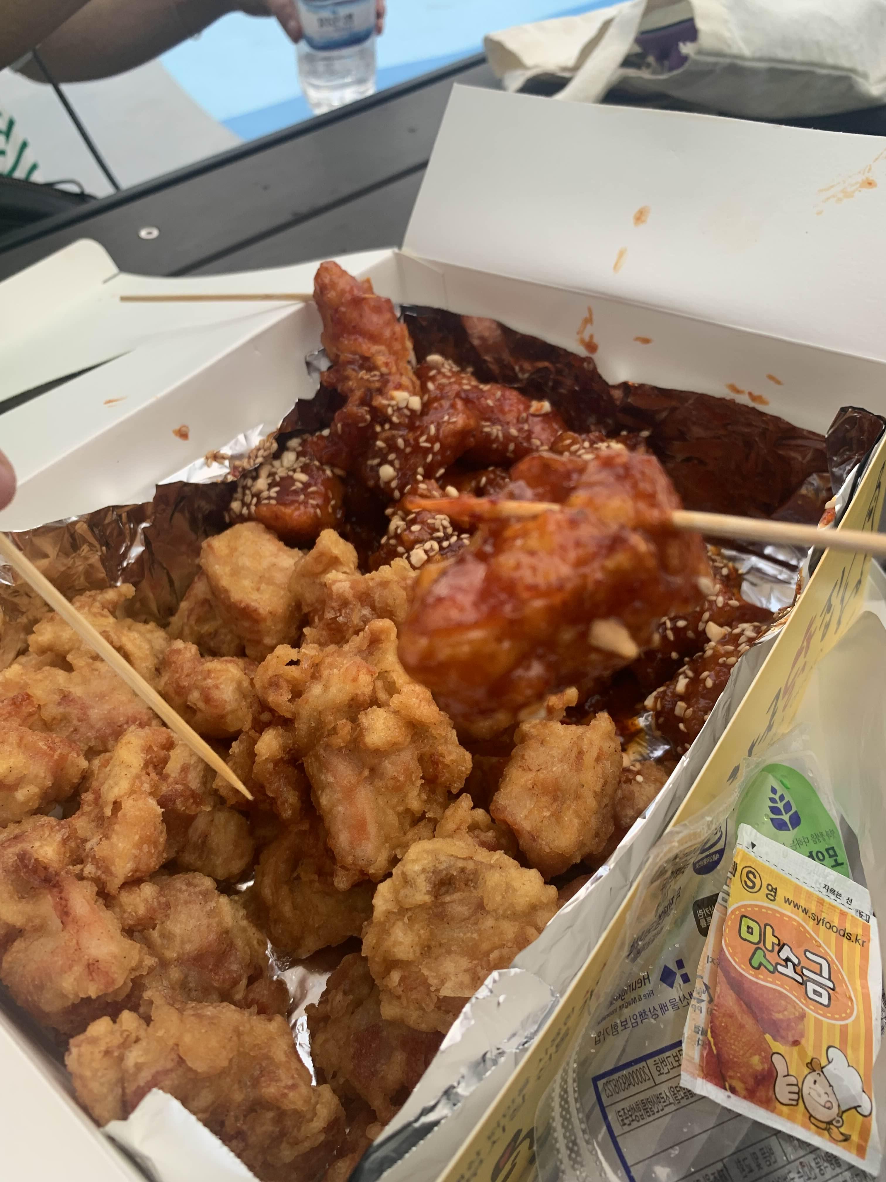 한국 닭집에는 통닭 말고도... 다른 음식을 판매하고 있는데... 다른 음식을 그리 맛있어 보이지 않아서 사 먹지는 않았네요. 통닭은 가마솥에 튀기는 방식으로.... 뜨거운 기름에 닭을 튀겨서, 튀김이 바삭하다.