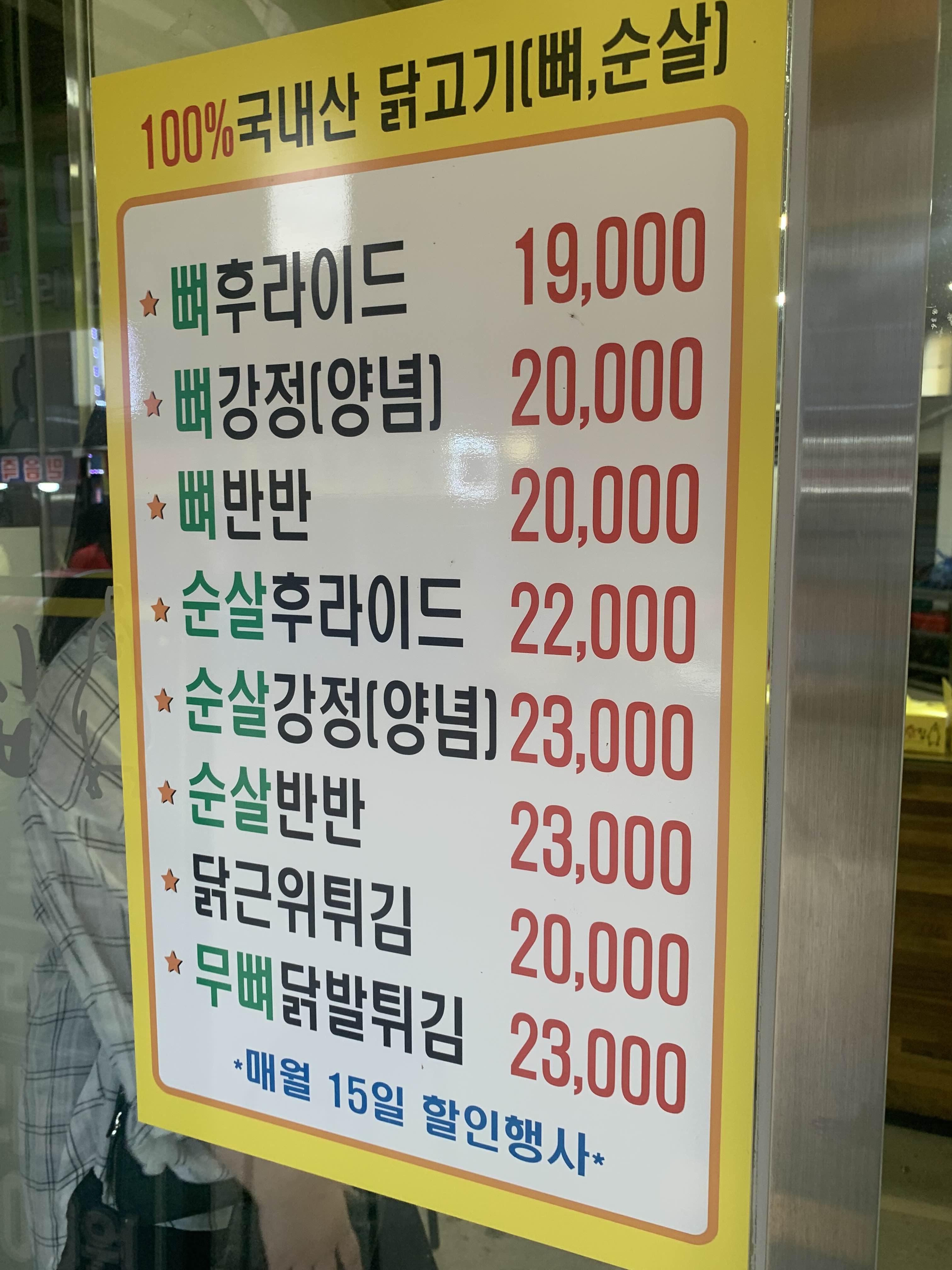 한국 닭집은 매월 15일 특별 세일을 진행합니다. 예전에는 뼈 후라이드를 15일에 만원에 판매했었는데... 지금은 어떻게 판매하는지는 모르겠네요.ㅎㅎ 최근 물가가 많이 올라서 그런지.... 통닭 가격이 많이 올랐습니다. ㅠㅠㅠ 순살 반반을 많이 먹는데, 가격이 23,000원!!!