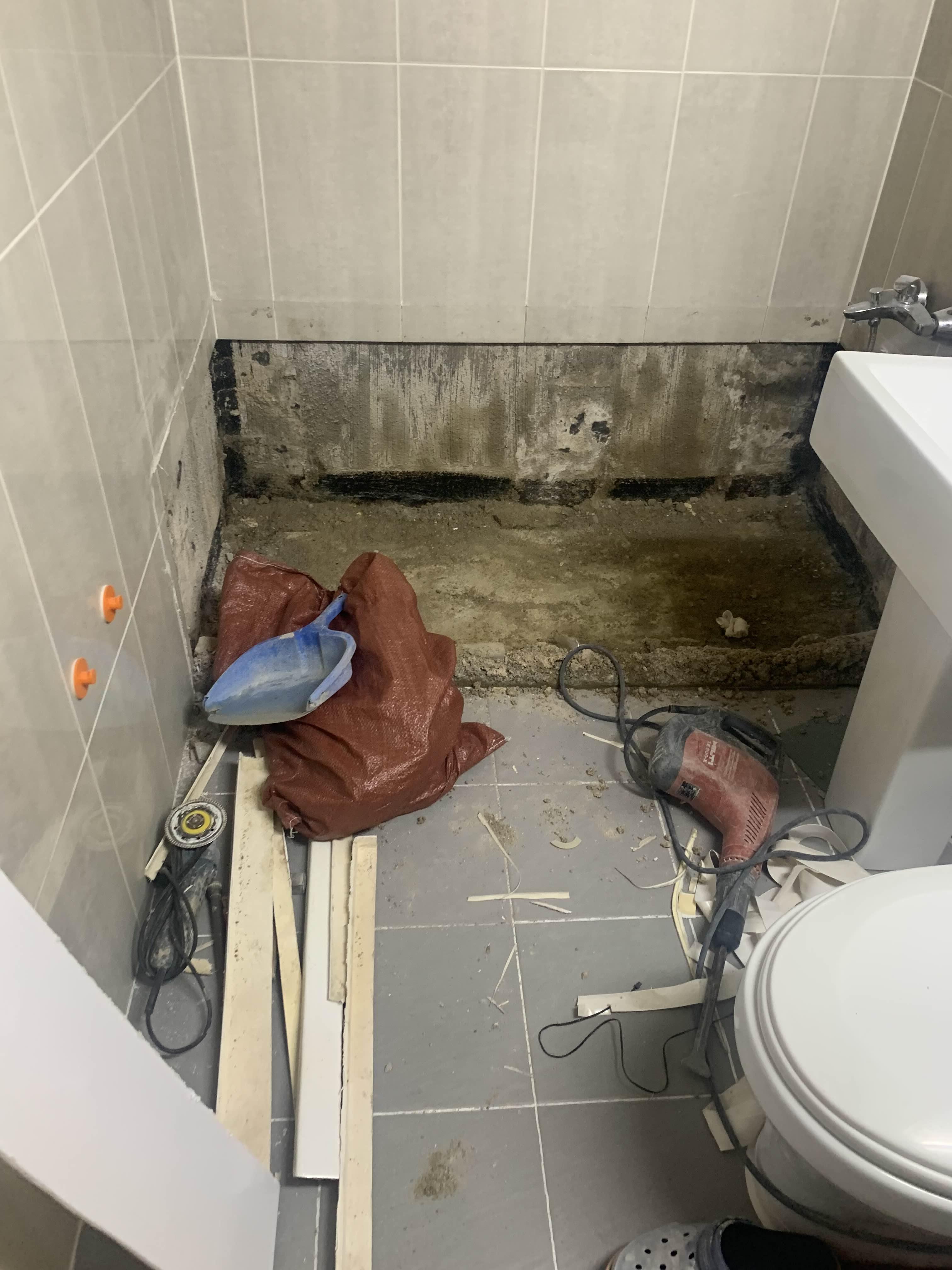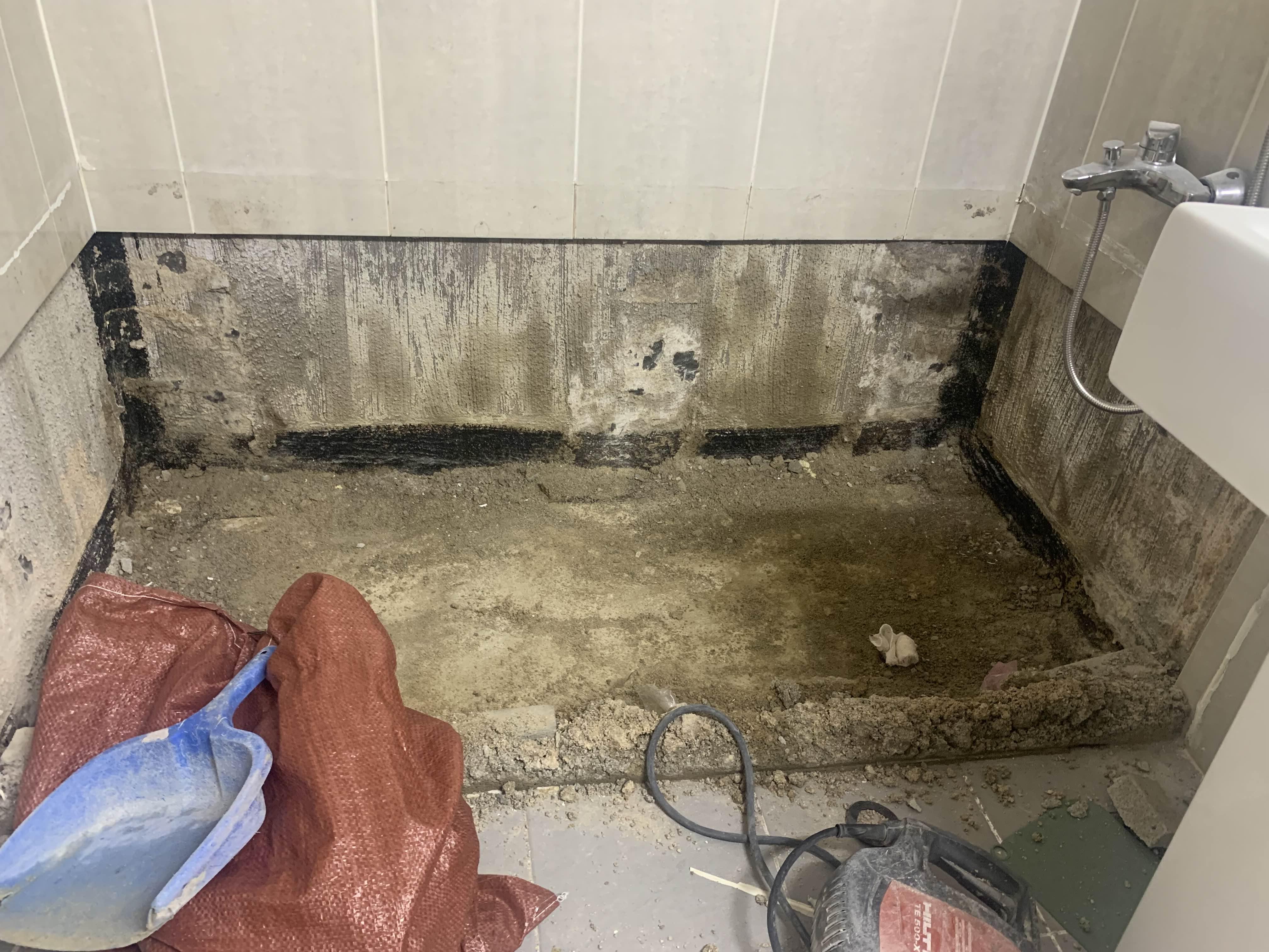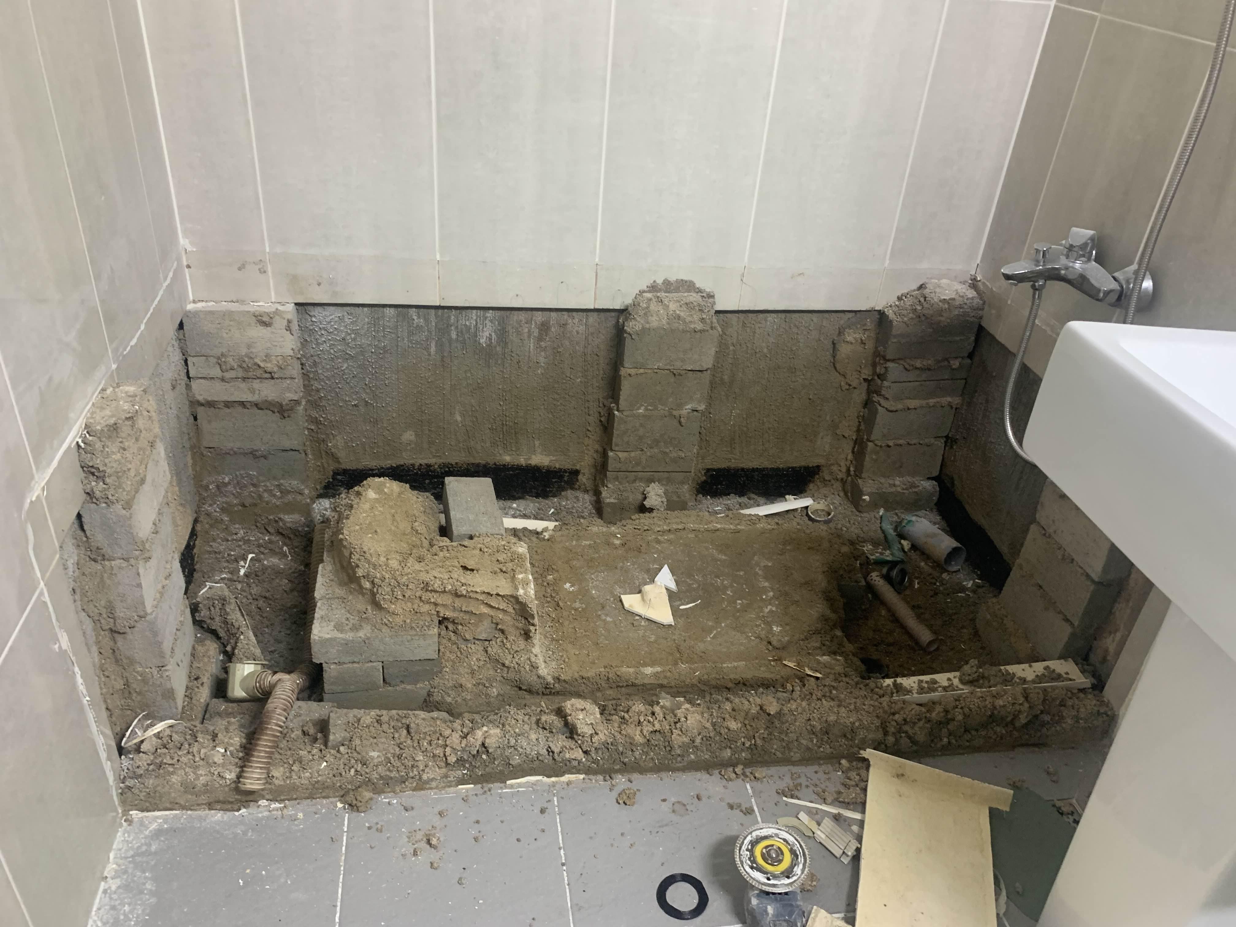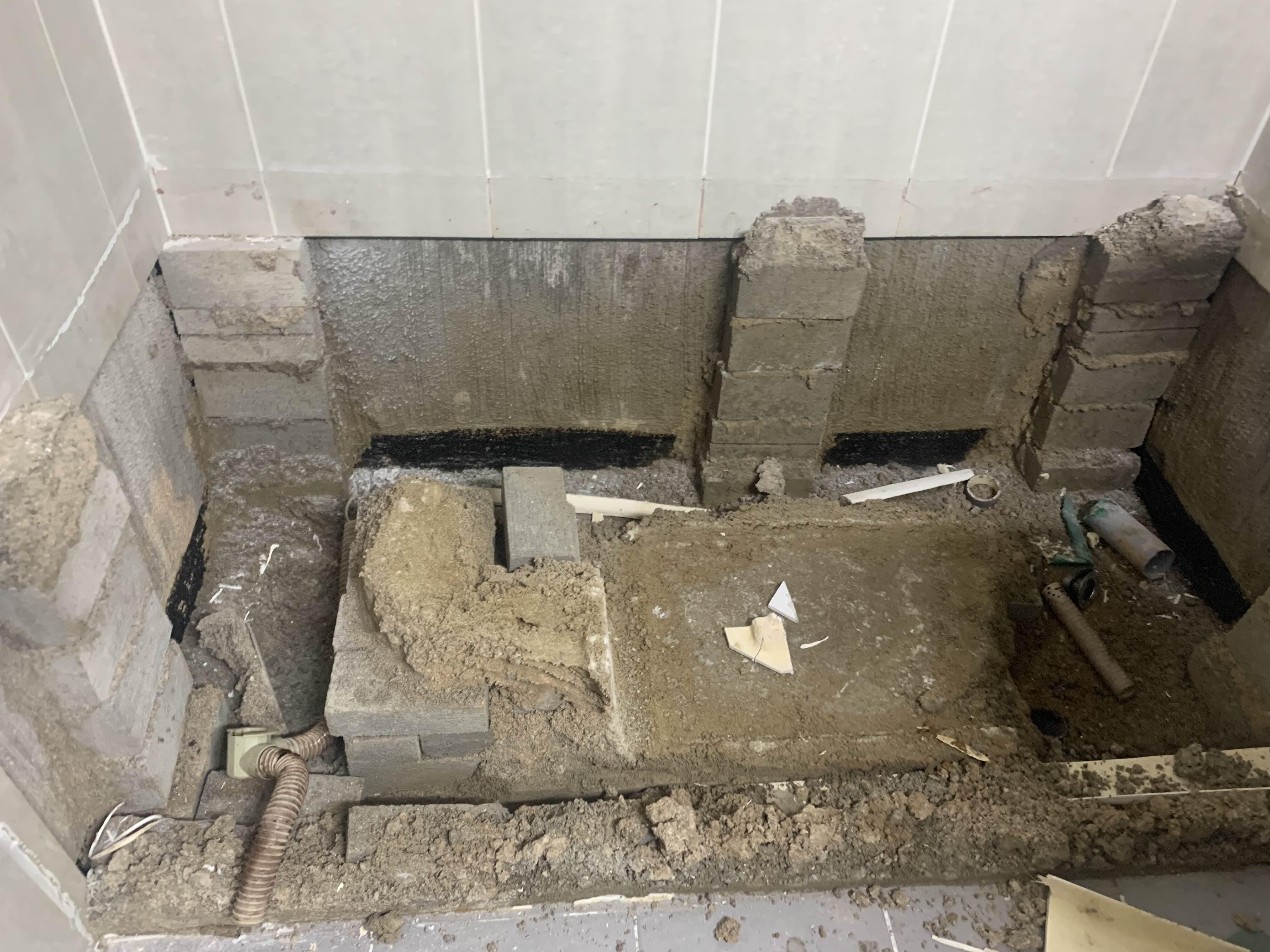 욕조를 철거 후 욕조 거치대(벽돌)를 제거 후 청소한다. 청소가 다 끝나면, 욕조 하부 쪽 방수층이 보인다. 육안으로는 방수가 깨졌는데, 안되었는 모른다.ㅎㅎ